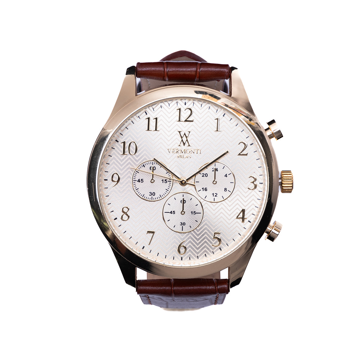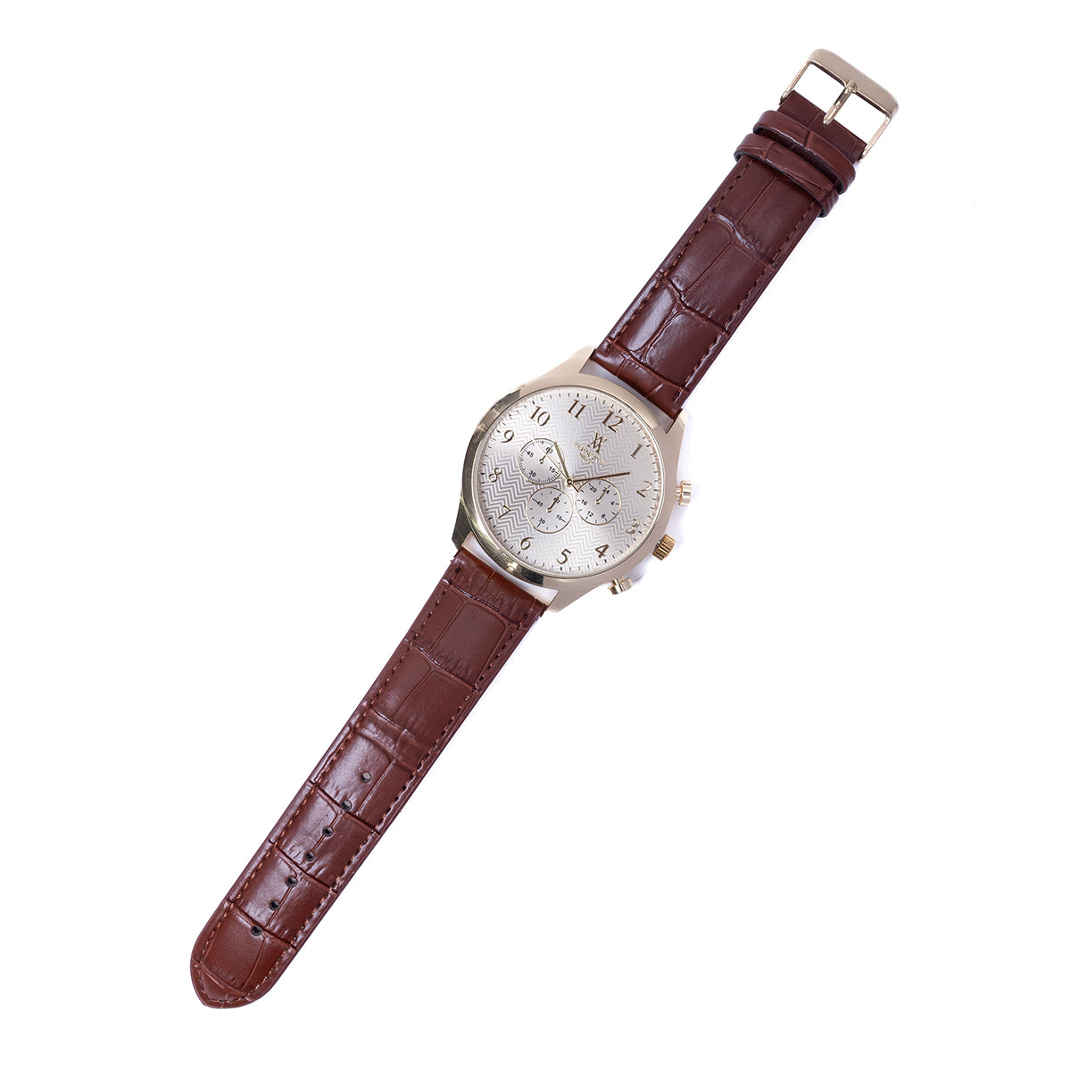 Reloj en color café con marcadores de fácil lectura y corona de ajuste.