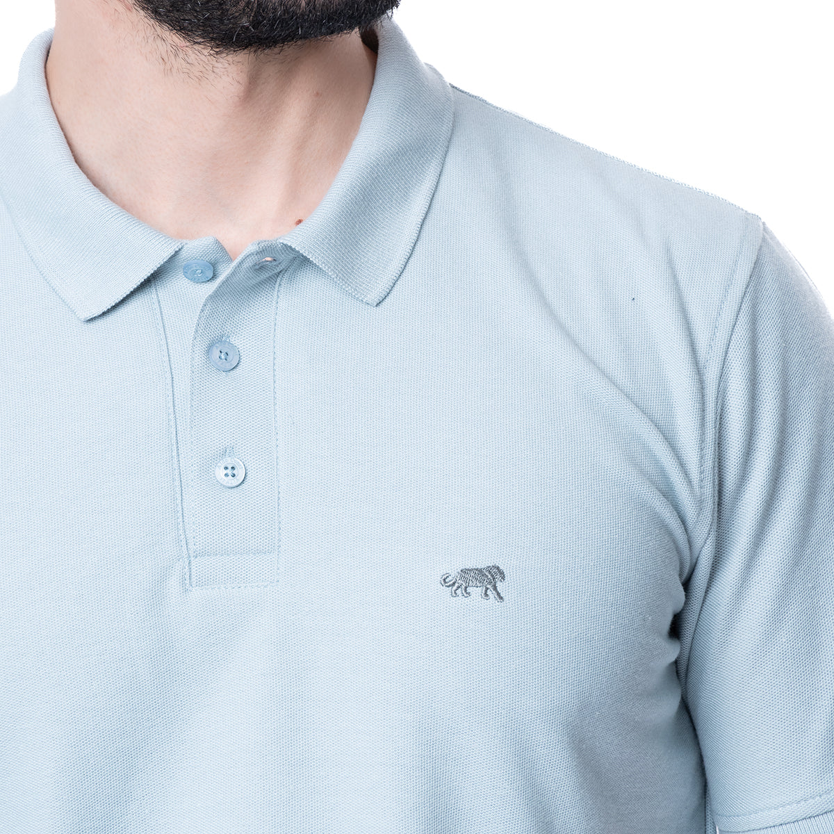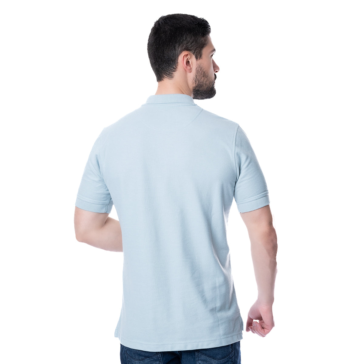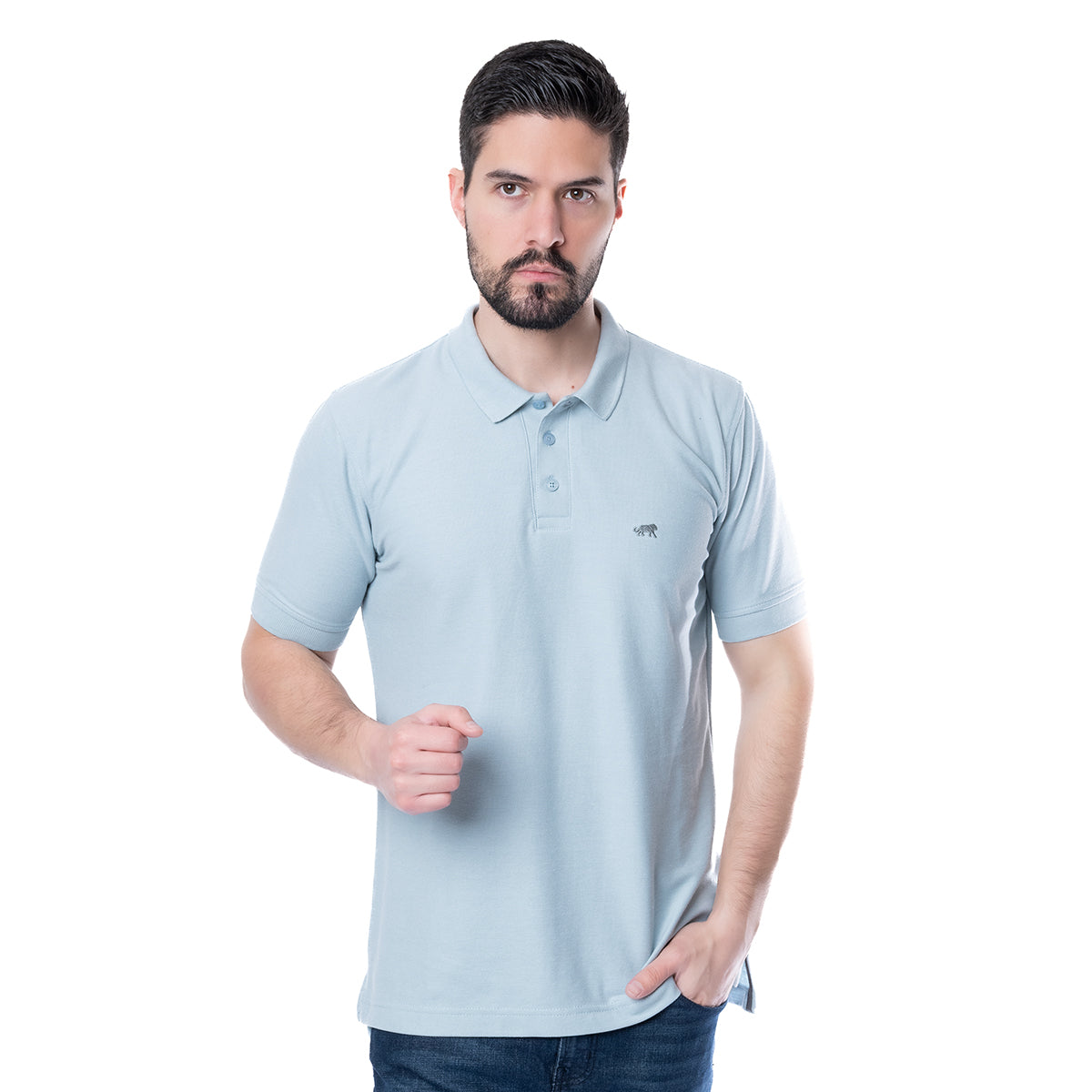 Playera tipo Polo de corte Slim Fit, en color azul . Cuello italiano y manga corta. Moldeable al cuerpo y tela suave. Cierre de botonadura a la altura del pecho.