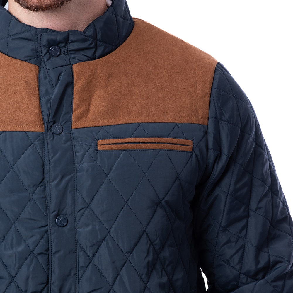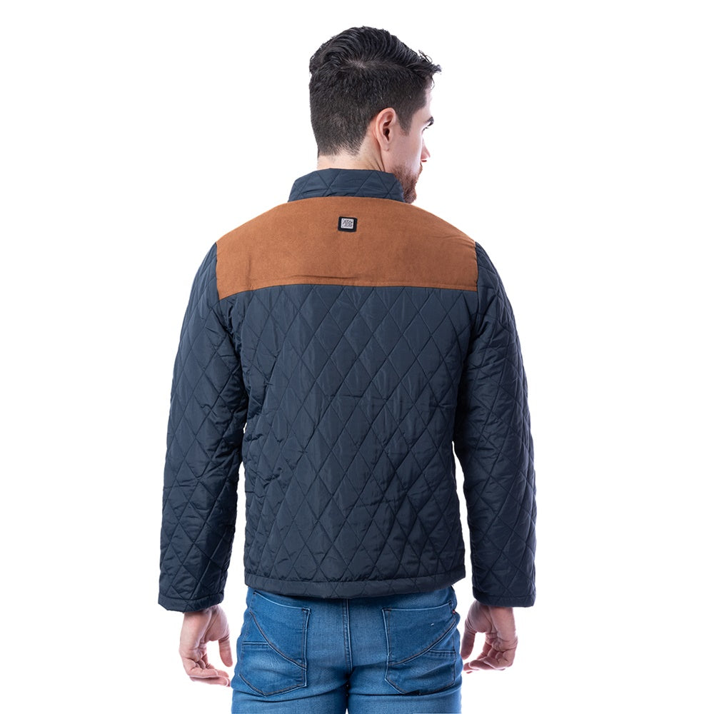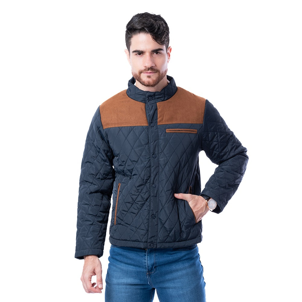 Chamarra de corte Classic Fit, color marino y diseño multicolor. Cierre frontal de botonadura y bolsillos laterales.
