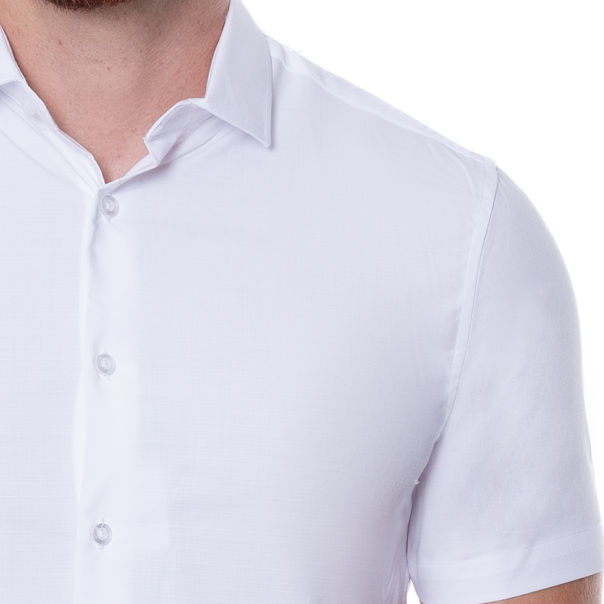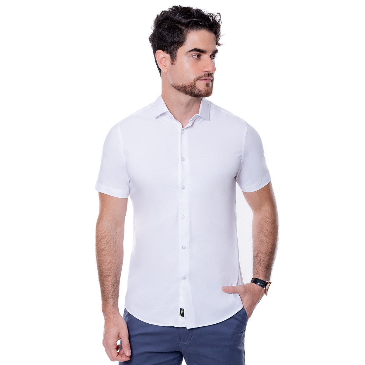 Camisa para hombre en corte Slim Fit, color blanca y diseño liso, con cuello italiano, botonadura al frente y manga corta. Una opción versátil para oficina, eventos y looks smart casual con una imagen pulida.