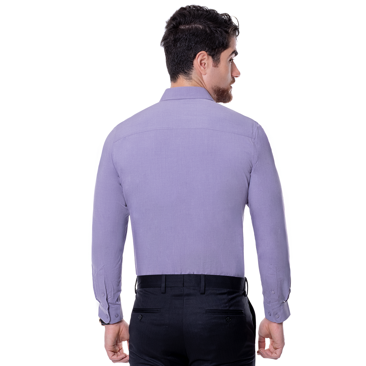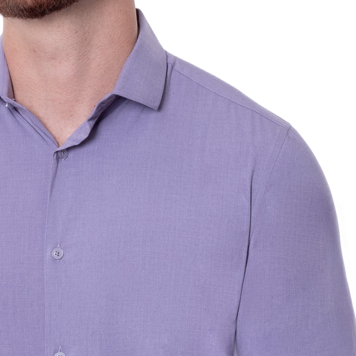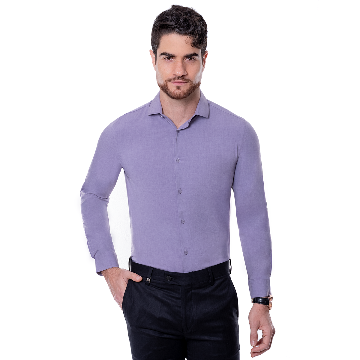 Camisa para hombre en corte Slim Fit, color Morada y diseño liso. con cuello italiano y manga larga. Una opción versátil para oficina, eventos y looks smart casual con una imagen pulida.