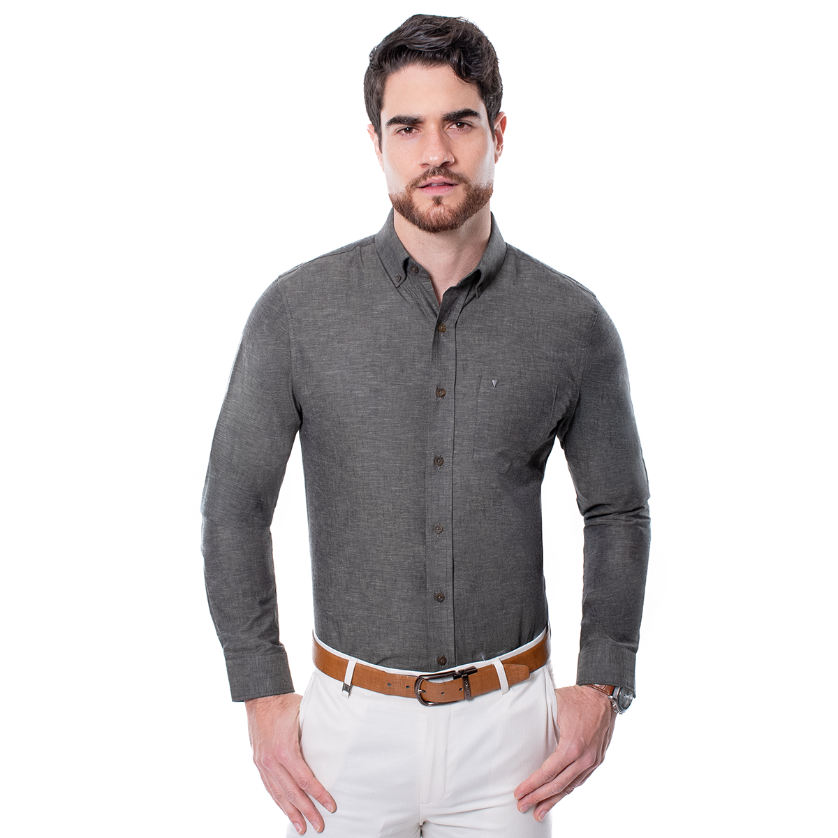 Camisa para hombre en corte Slim Fit, color olivo y diseño texturizado, con cuello button down, botonadura al frente y manga larga. Incluye bolsillo al pecho para un detalle funcional. Una opción versátil para oficina, eventos y looks smart casual con una imagen pulida.