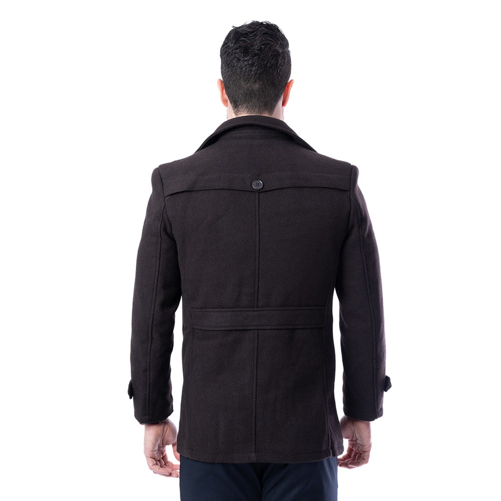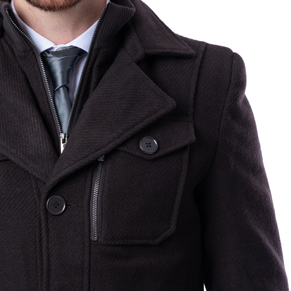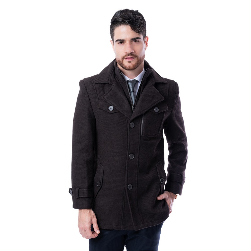 Abrigo de corte Slim Fit, en color café y diseño liso. Cierre de botonadura y cremallera, con dos bolsillos a los costados y uno superior de lado izquierdo.