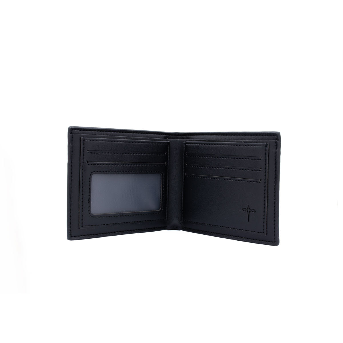 Cartera en color negro con diseño texturizado y compartimentos para billetes y tarjetas, con costuras decorativas.