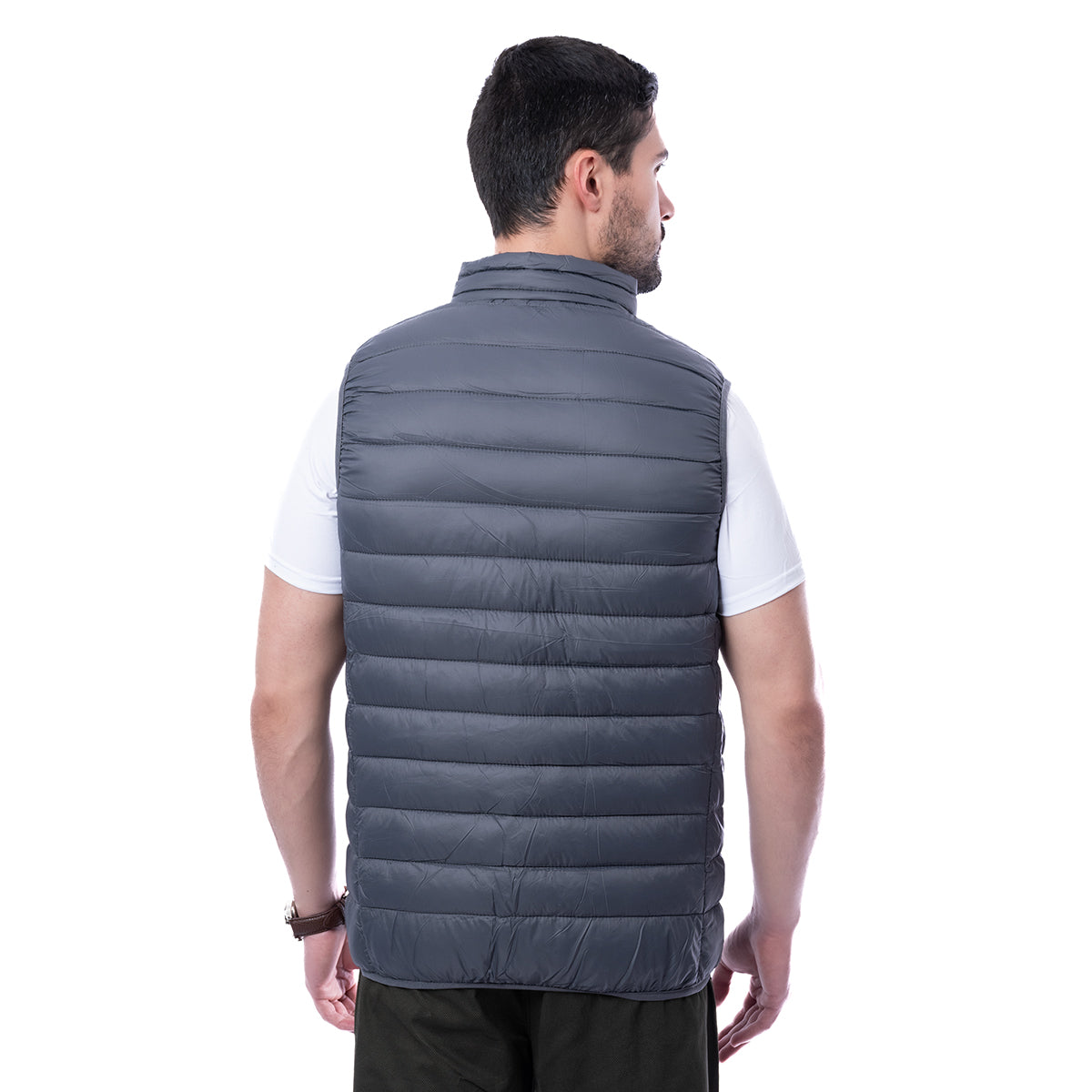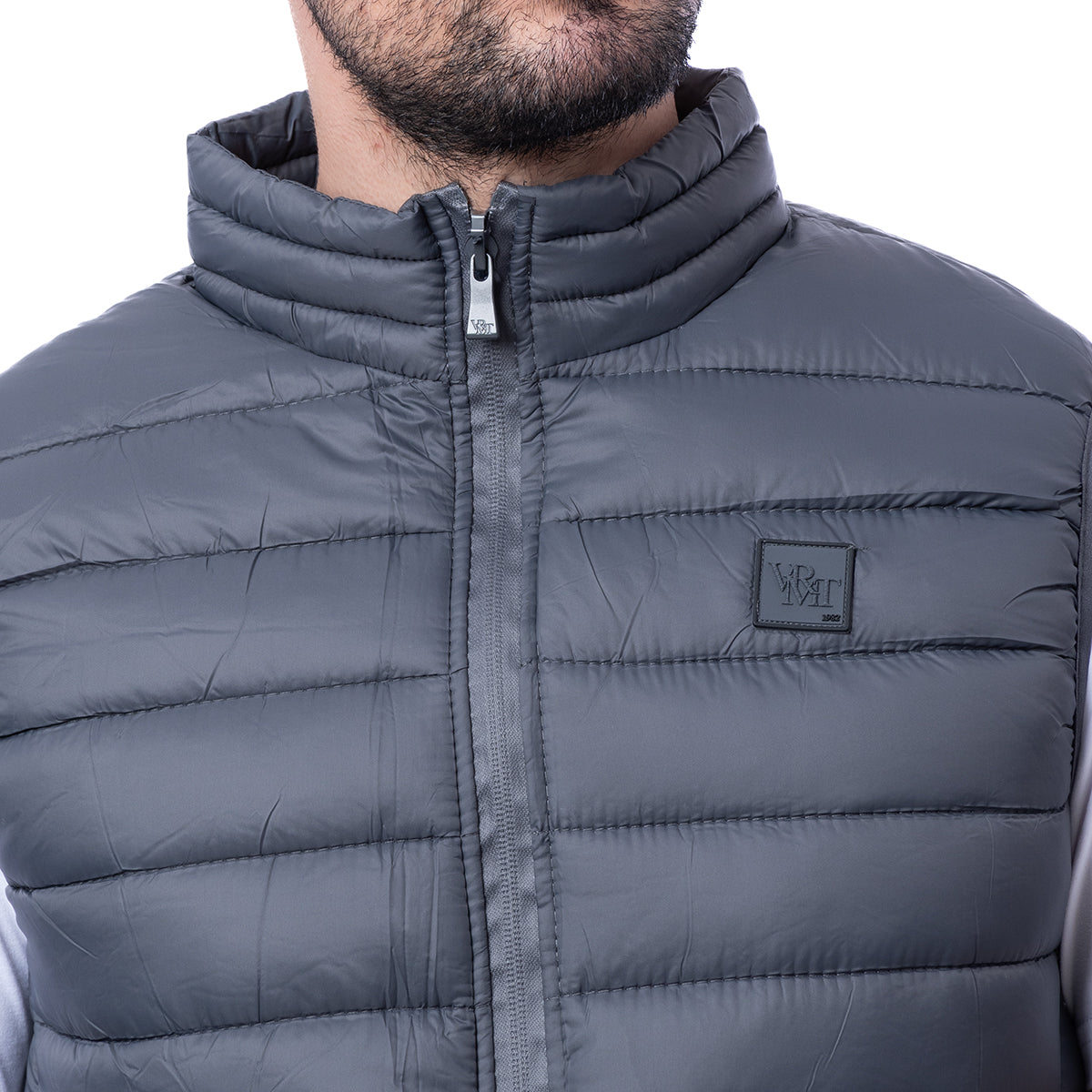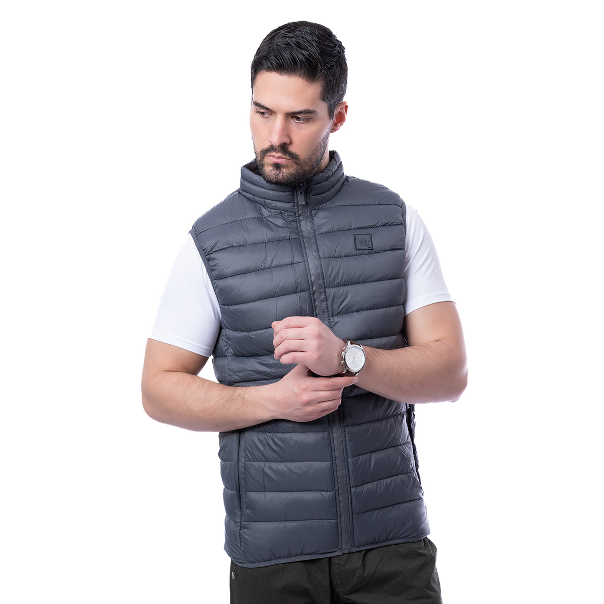 Chaleco capitonado en color gris con diseño liso y cierre de cremallera.
