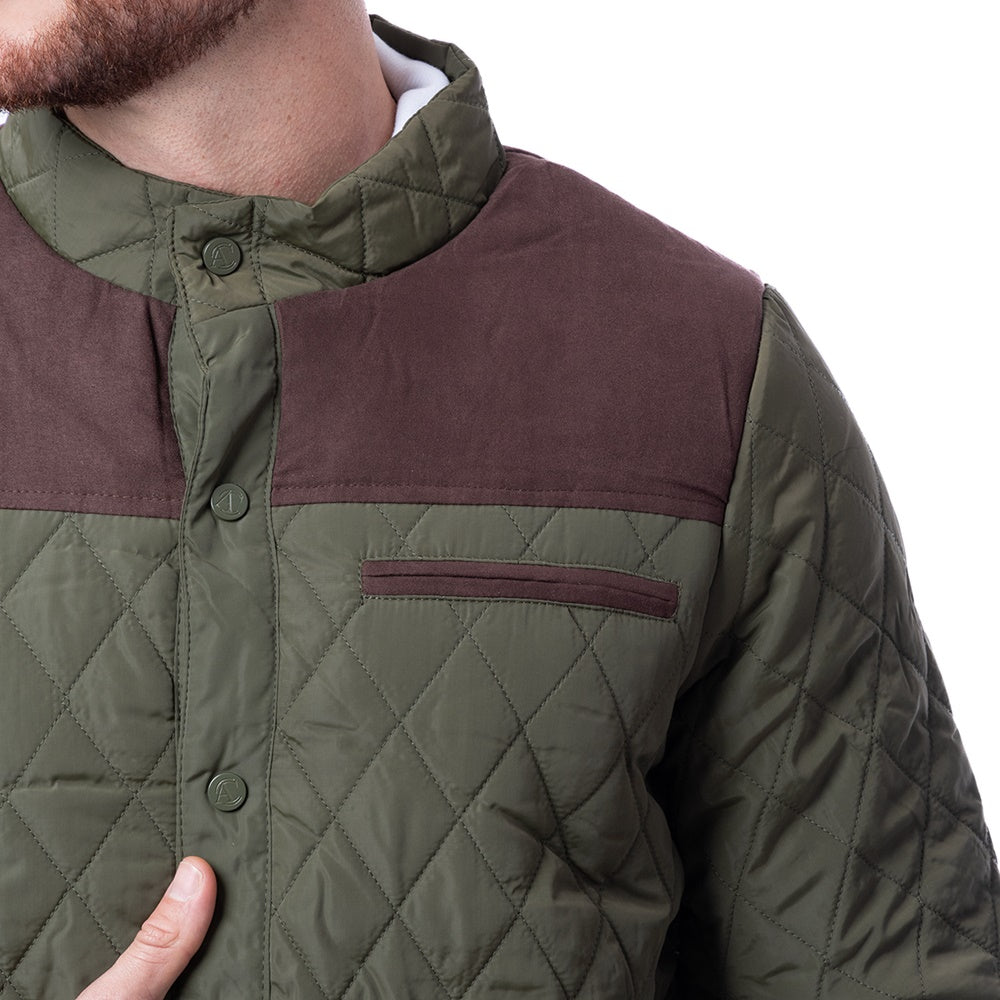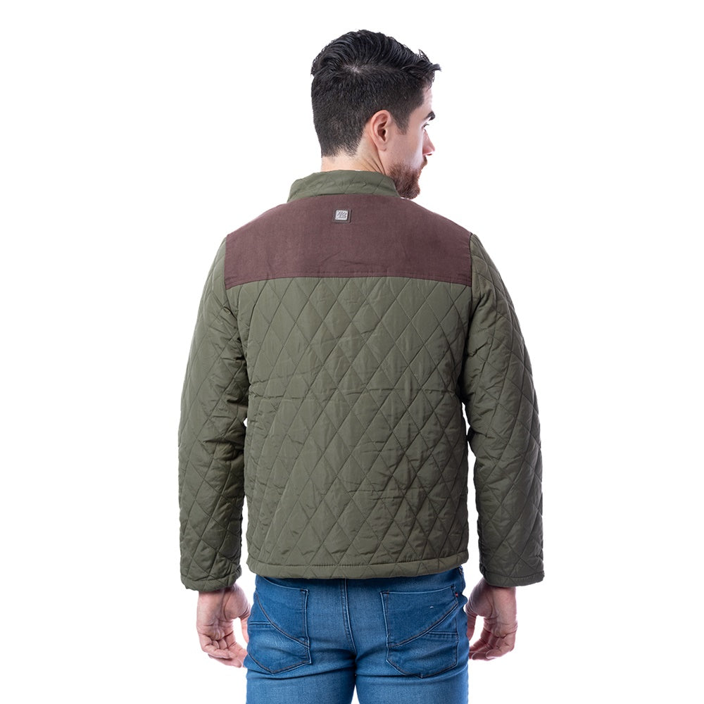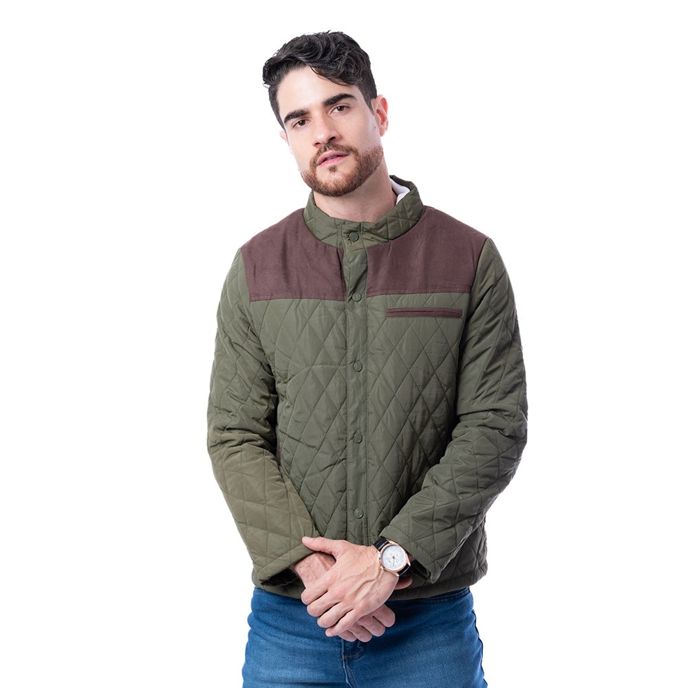 Chamarra de corte Classic Fit, color olivo y diseño multicolor. Cierre frontal de botonadura y bolsillos laterales.