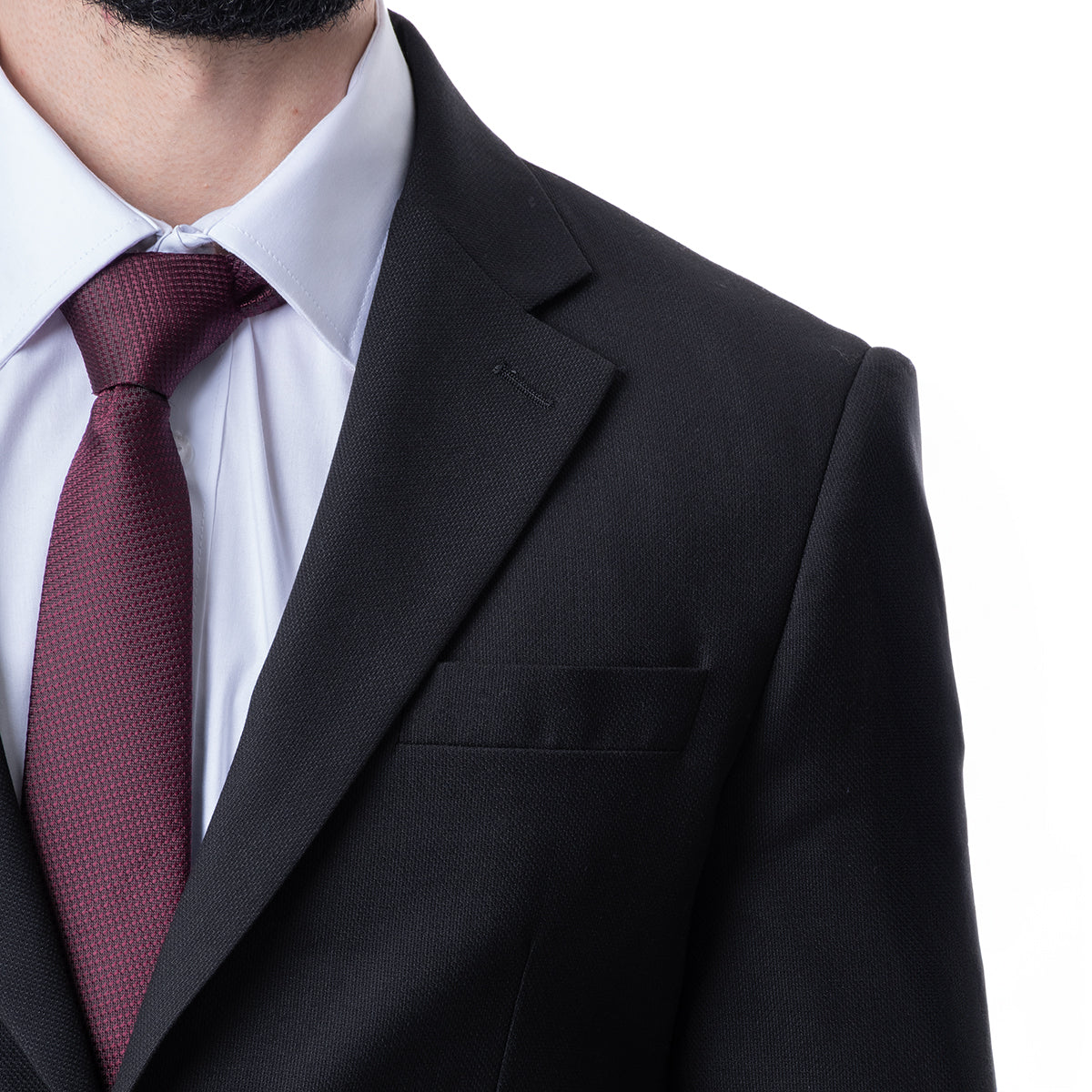 Traje en color negro. Conjunto de 2 piezas: saco con solapa de muesca y pin decorativo, pantalón con bolsillos delanteros y traseros con botón, cierre frontal de botonadura y cremallera.