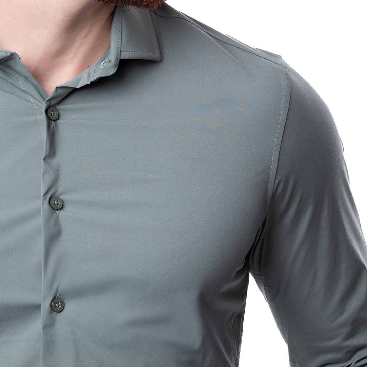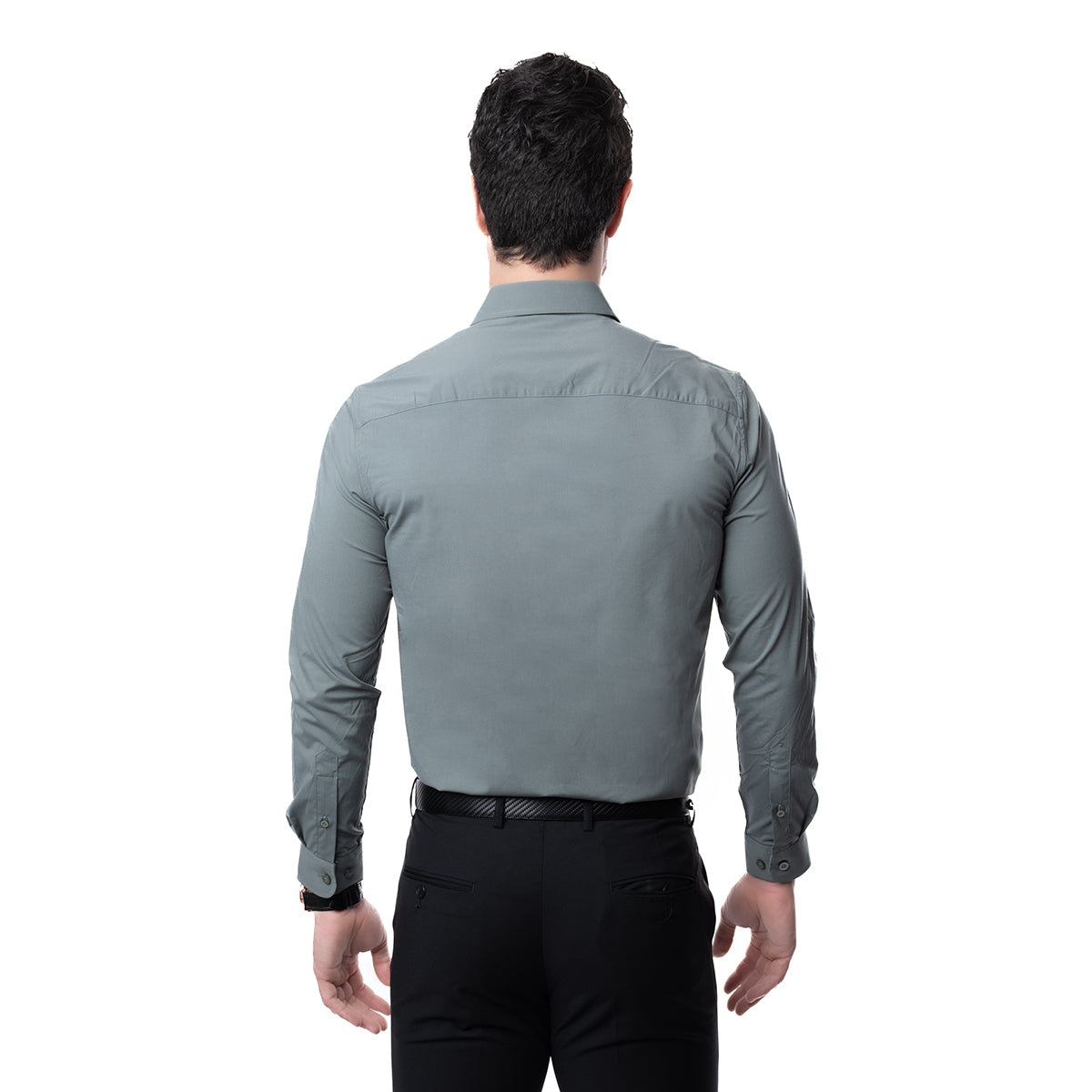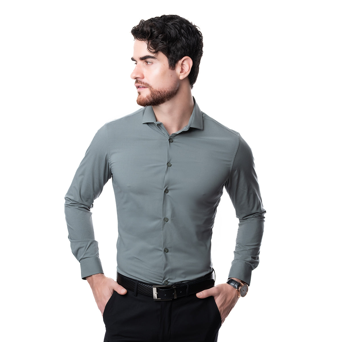 Camisa corte Slim Fit olivo con diseño liso, cuello italiano, botonadura clásica al frente y manga larga. Con el corte SLIM FIT tendrás un atuendo cómodo, dándote la libertad con un estilo semi ajustado.