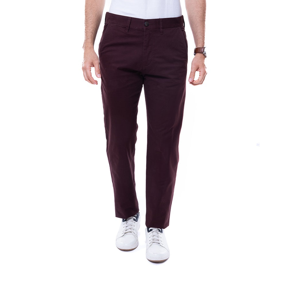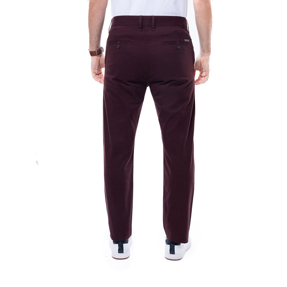 Pantalón de corte Slim Fit, en color vino y diseño liso, con bolsillos frontales sin botón y traseros de doble vivo con botón.