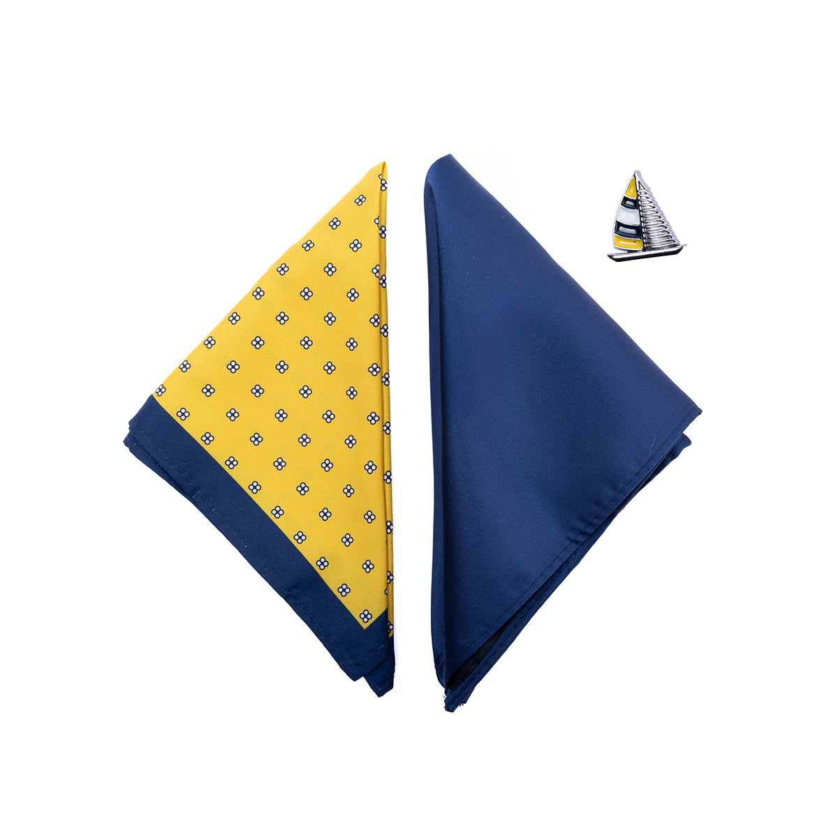 Set de 3 piezas que incluye 1 pañuelo azul liso + 1 pañuelo amarillo, y 1 pin de barco.
