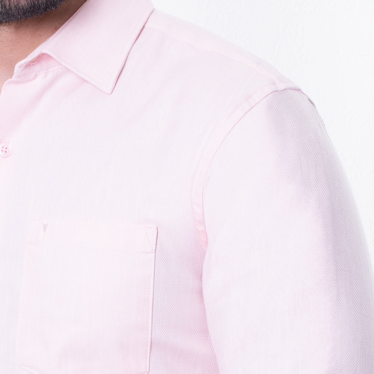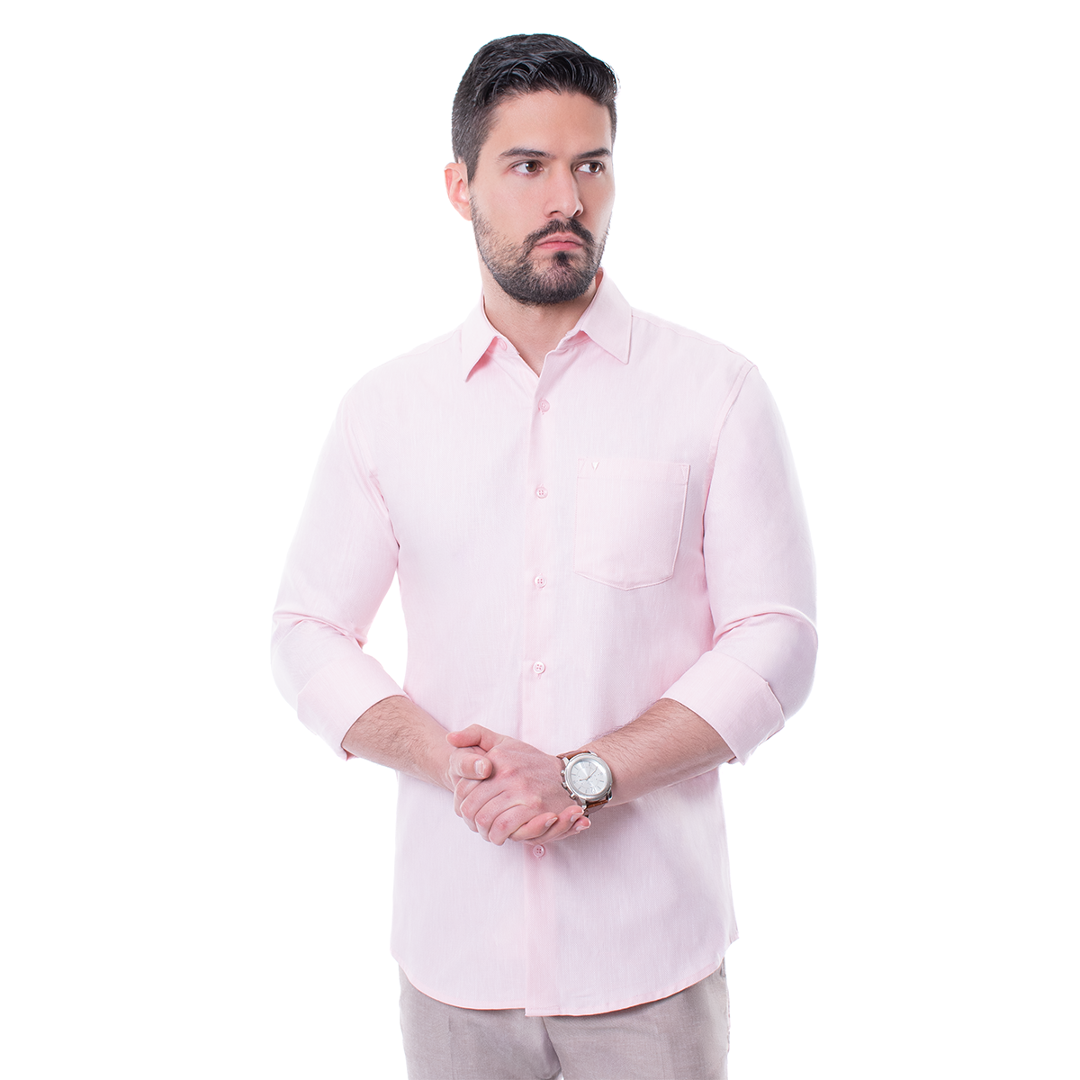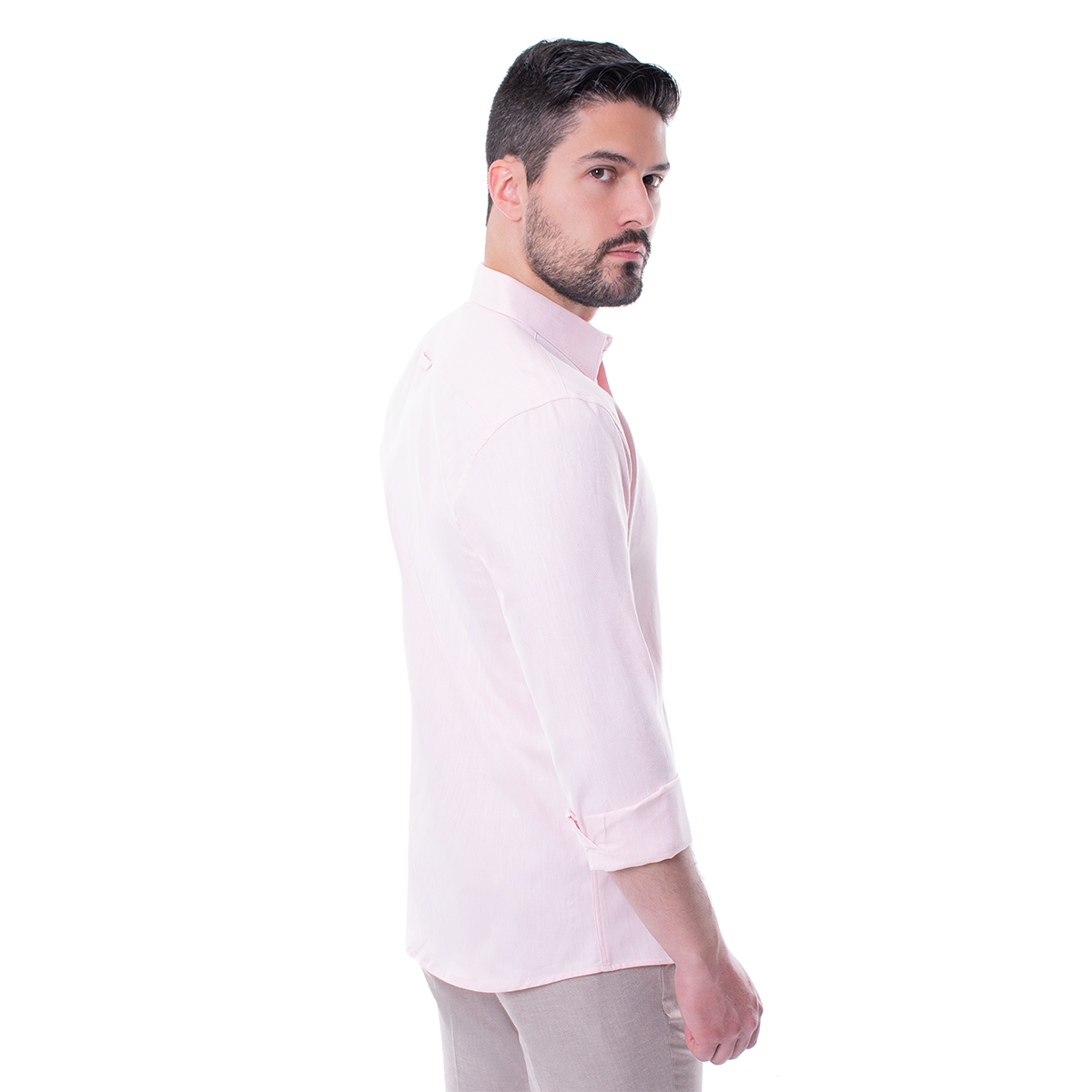 Camisa para hombre de manga larga en corte slim fit y tono rosa, con diseño liso y bolsa de parche al frente. El cuello italiano eleva el conjunto y funciona perfecto con saco. El detalle de botones al tono suma un acabado cuidado para tus looks de oficina y smart casual.