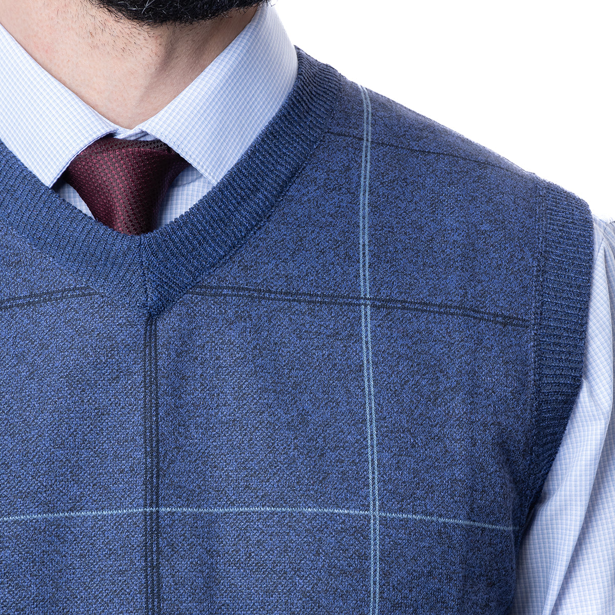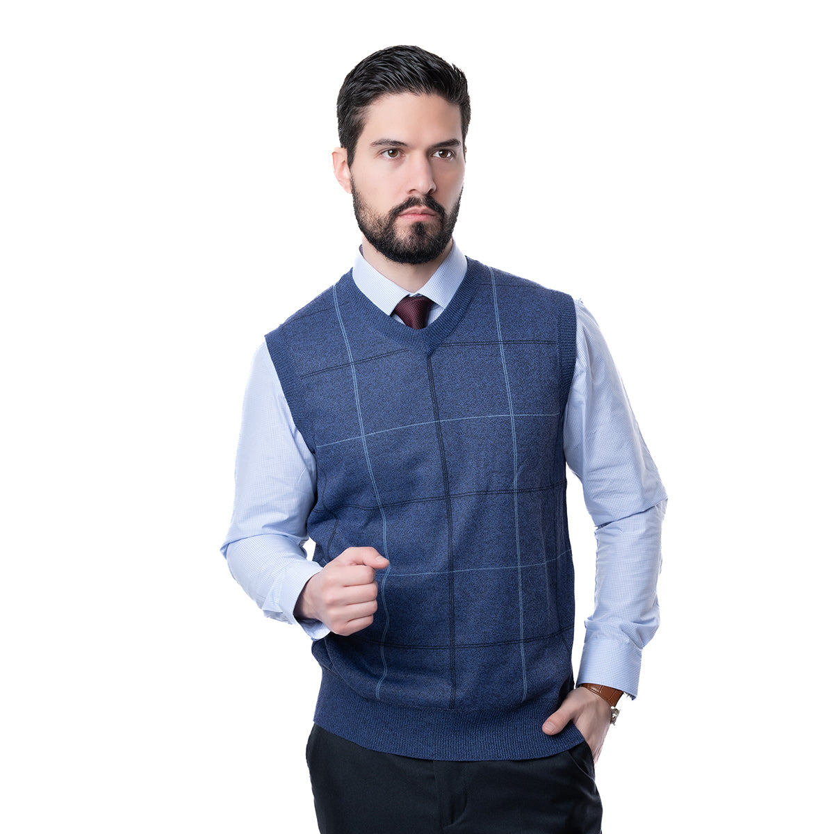Chaleco corte Slim Fit tejido azul marino con diseño a cuadros ventana y cuello en “V”. Con el corte SLIM FIT tendrás un atuendo cómodo, dándote la libertad con un estilo semi ajustado.