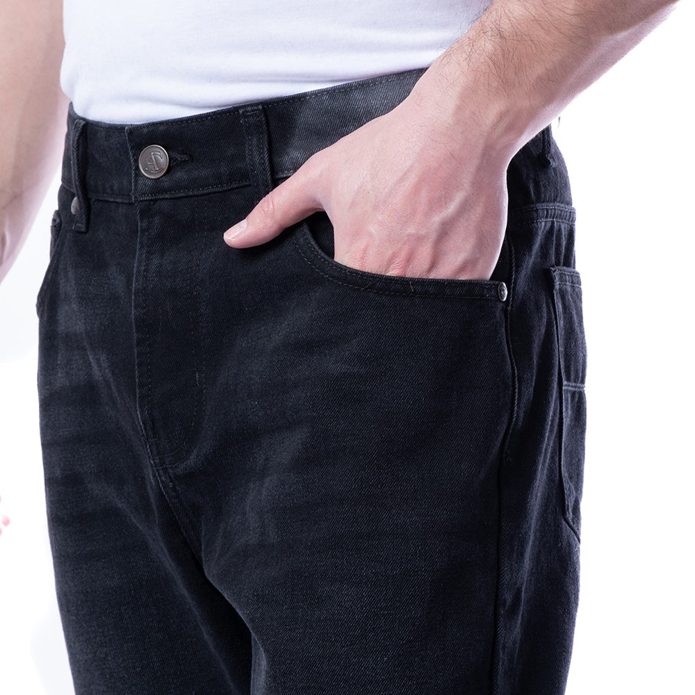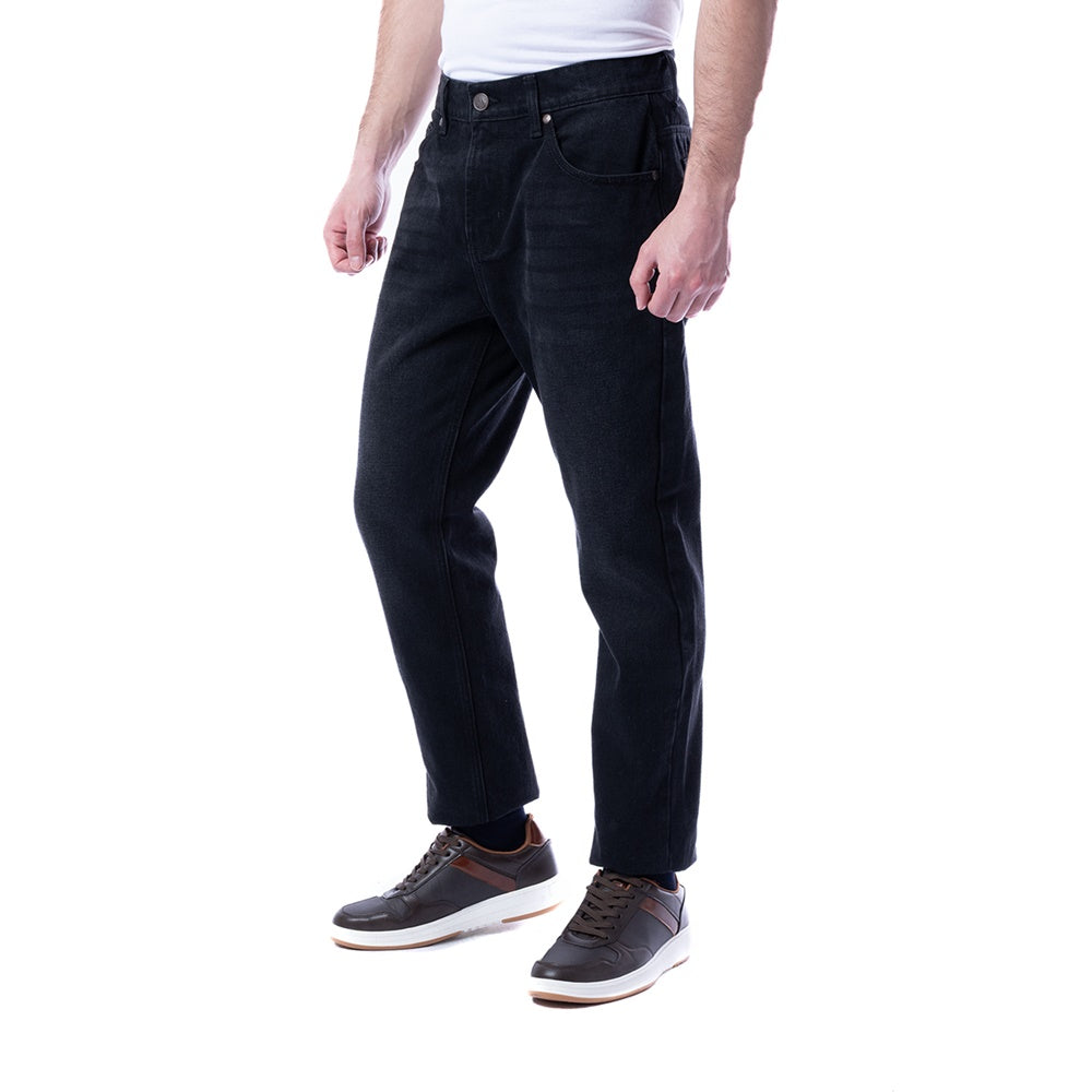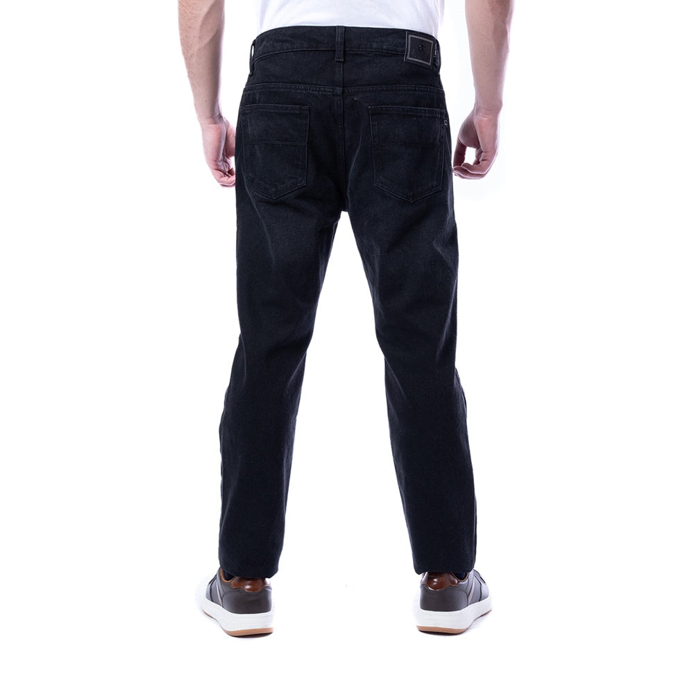 Pantalón estilo "Jeans" de corte Classic Fit, de color negro y diseño liso y detalles de "Whiskers" frontales para una apariencia casual y elegante. Bolsillos traseros y laterales. Cierre frontal con cremallera y botón.