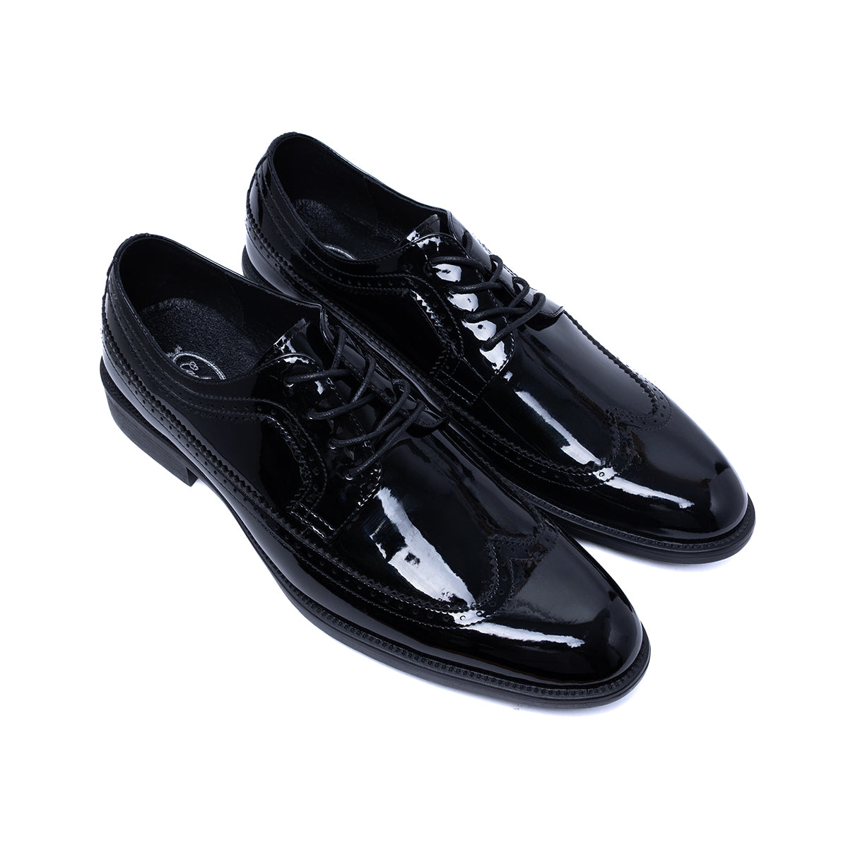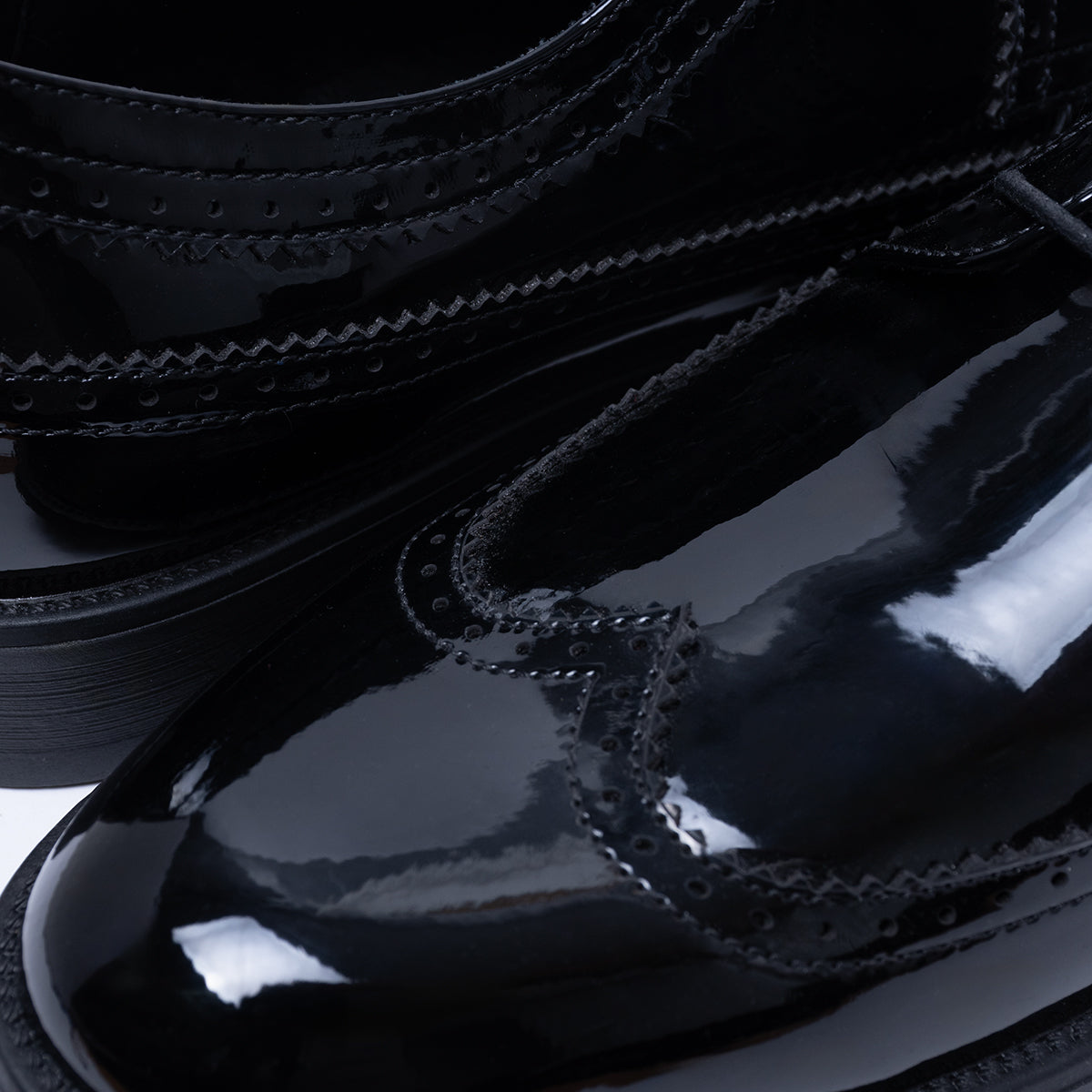 Par de zapatos negros con acabado charolado y detalles tipo brogue en la puntera. Cierre con agujetas. Suela y tapa antiderrapante.
