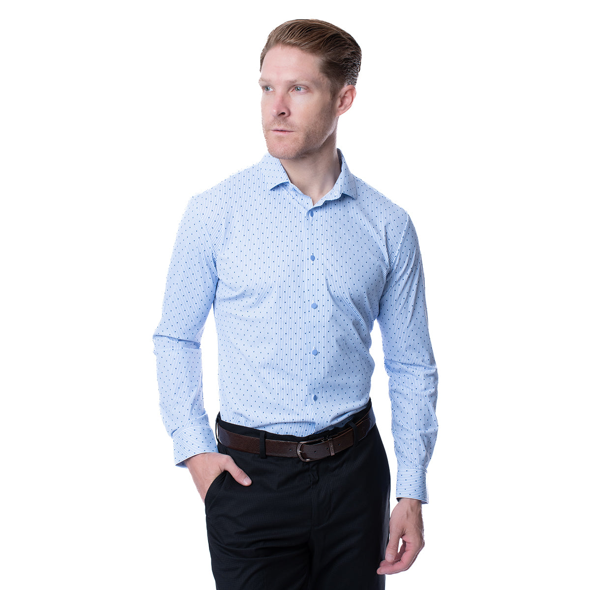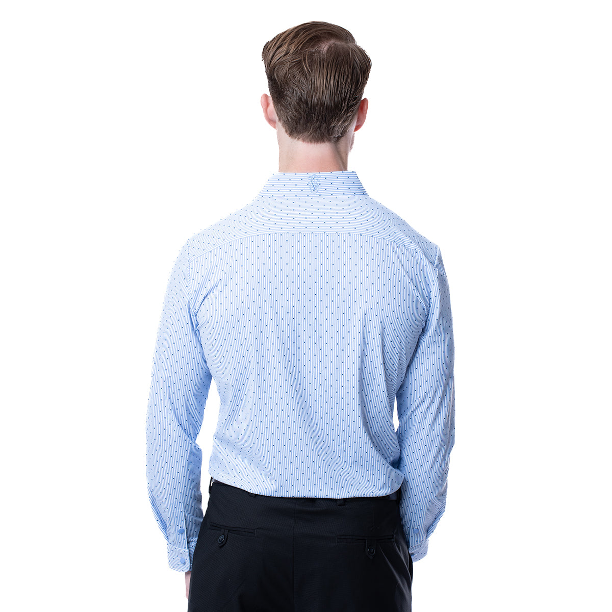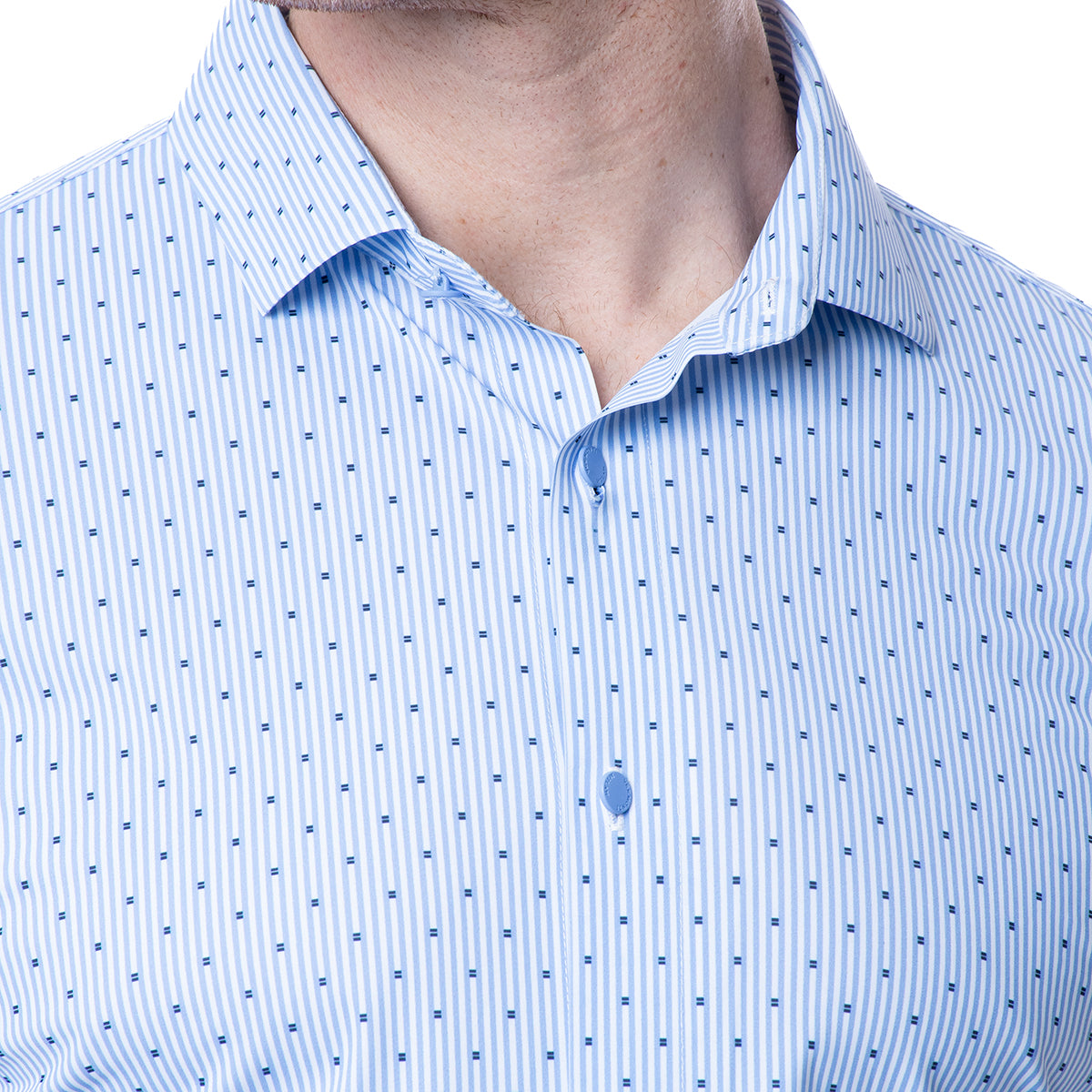 Camisa manga larga en color cielo con rayas, cuello button down. Corte Slim Fit que brinda un ajuste moderno y estilizado.