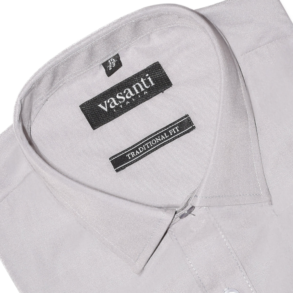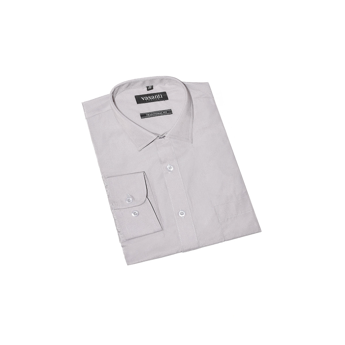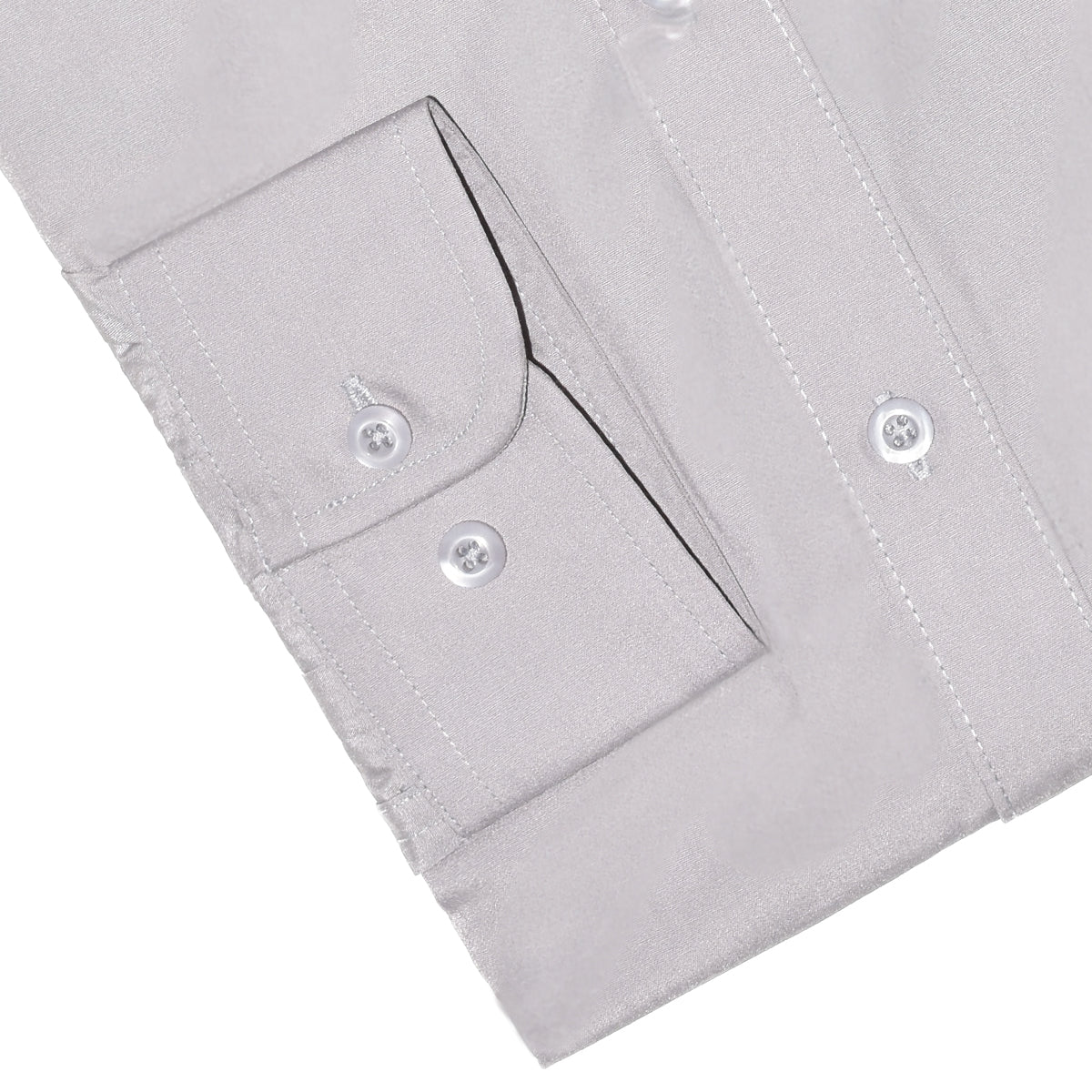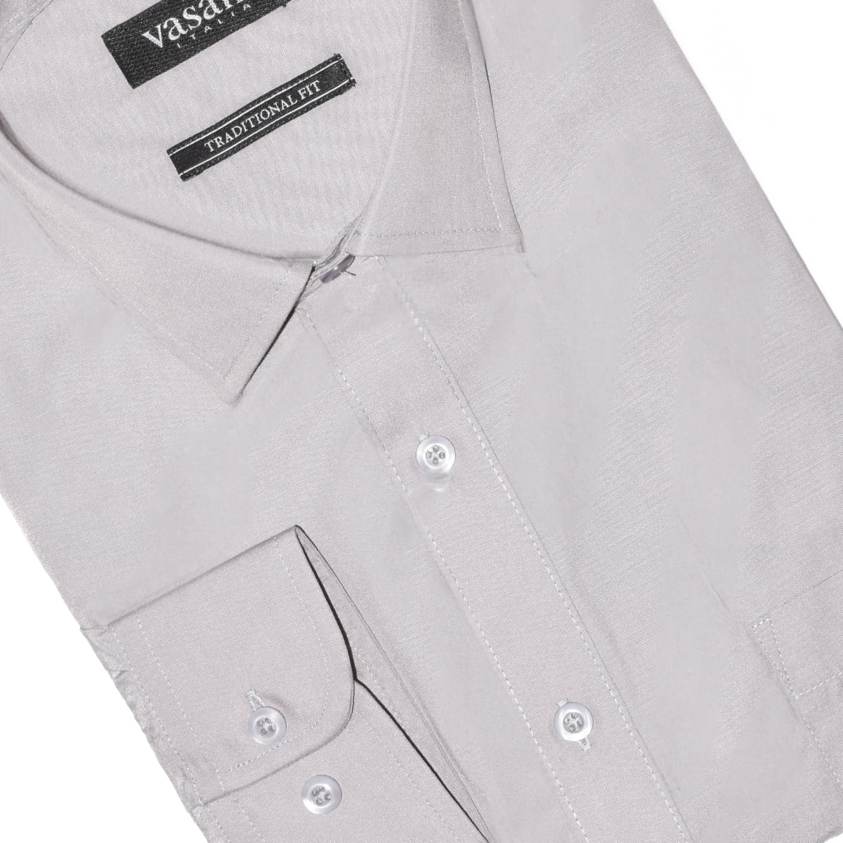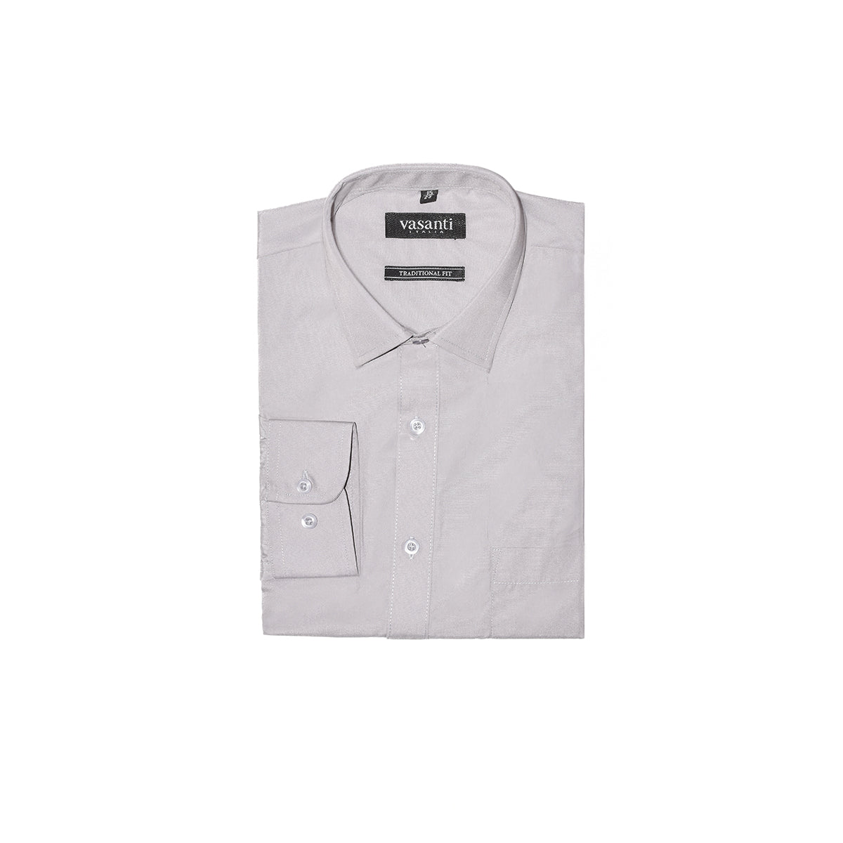 Camisa color gris, corte Tradicional Fit con cierre de botonadura, manga larga terminada en puño y bolsillo a la altura del pecho.