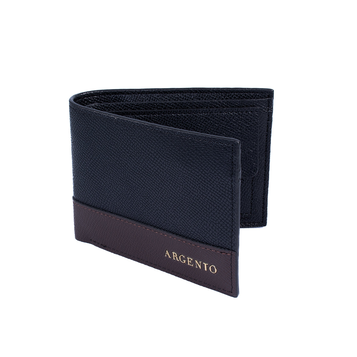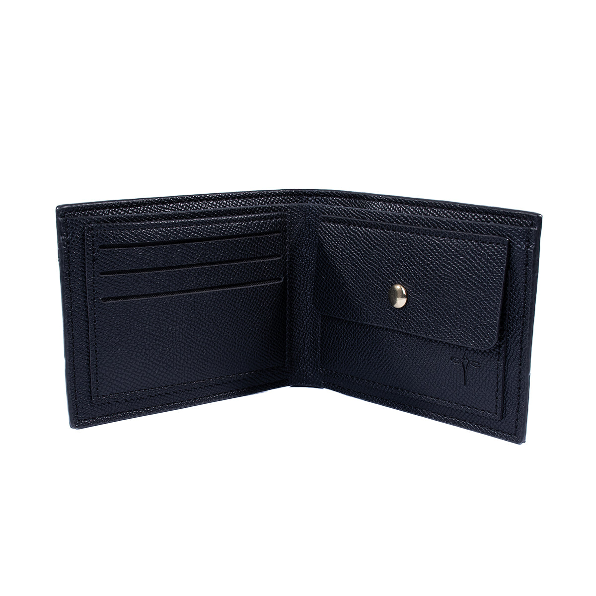Cartera negra con diseño texturizado y compartimentos visibles para tarjetas, monedero y billetes. Diseñada para acompañarte en cualquier ocasión, esta cartera mantiene tus objetos esenciales organizados con un estilo elegante y atemporal.