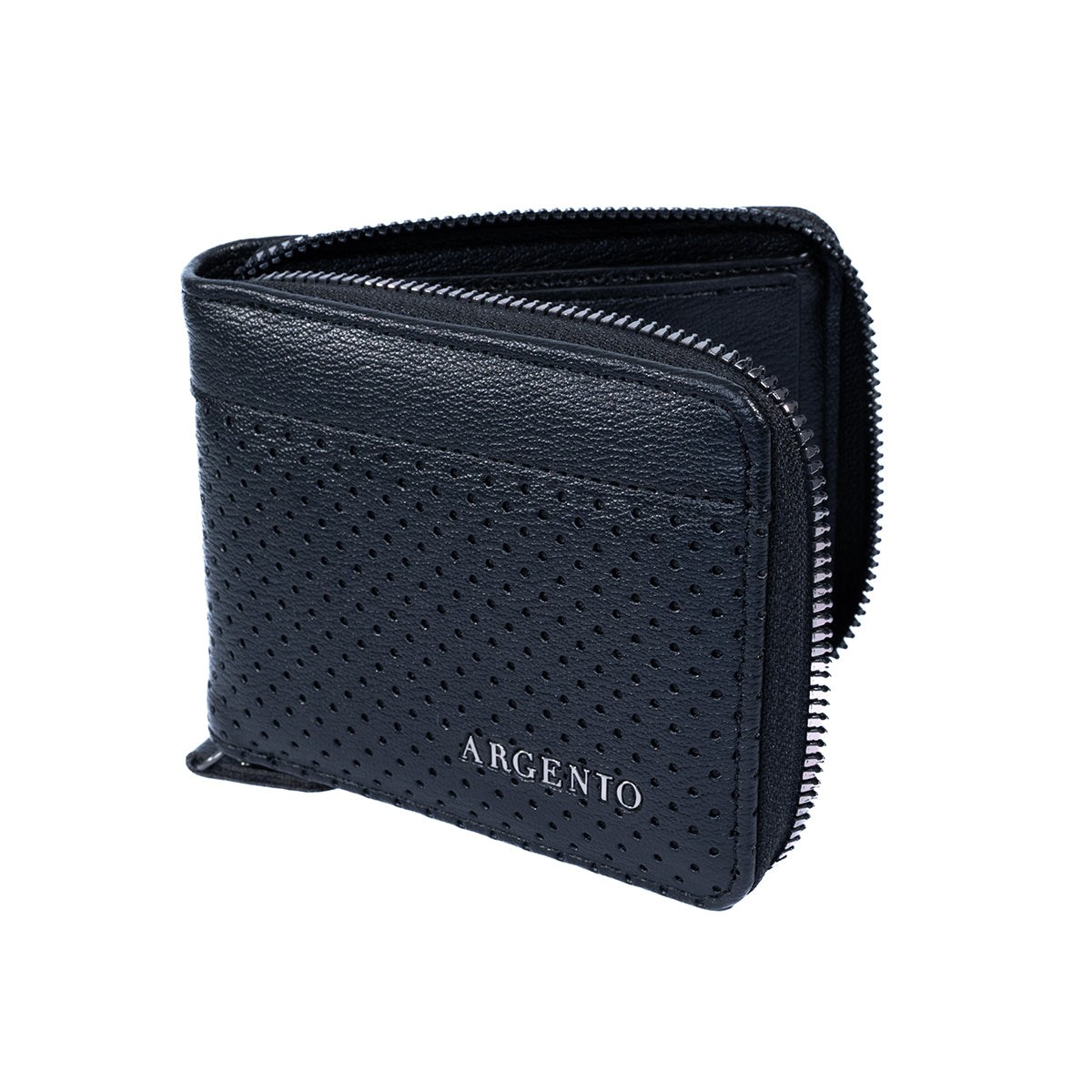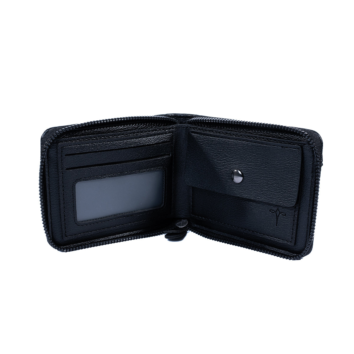 Cartera negra con diseño texturizado y perforado. Cierre de cremallera perimetral. Cuenta con portatarjetas, ventana para identificación y monedero con broche.