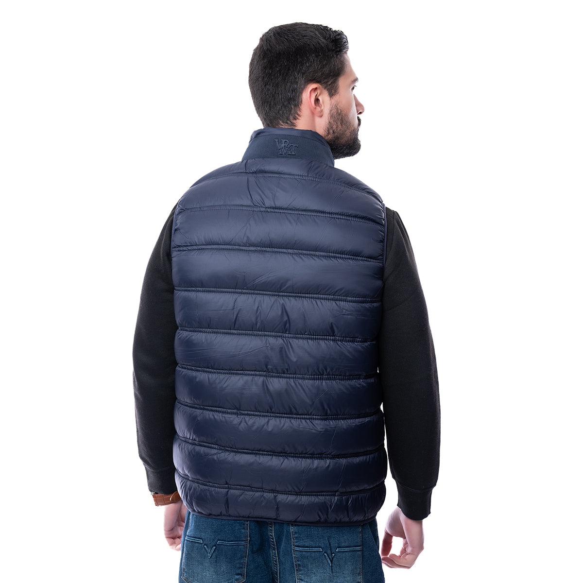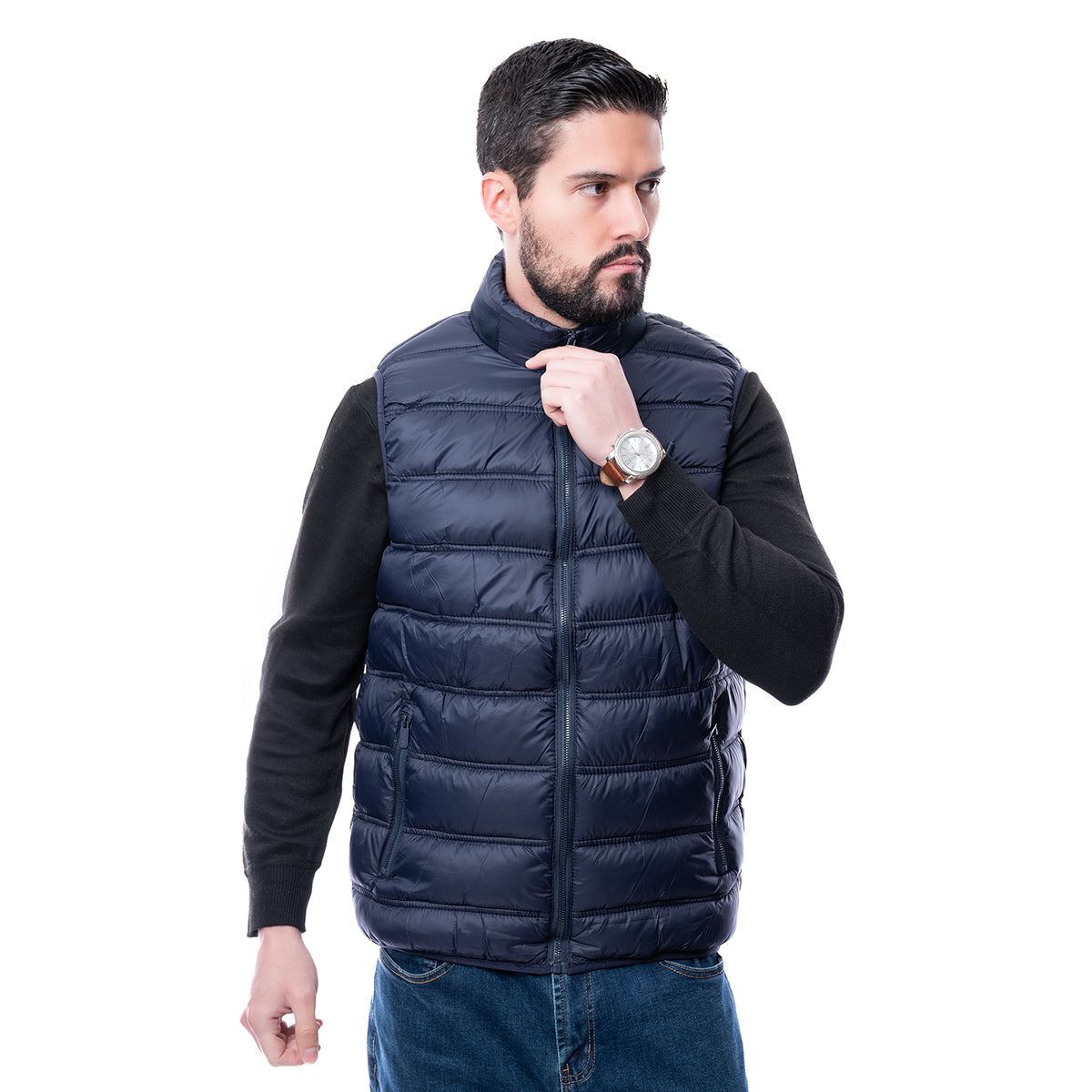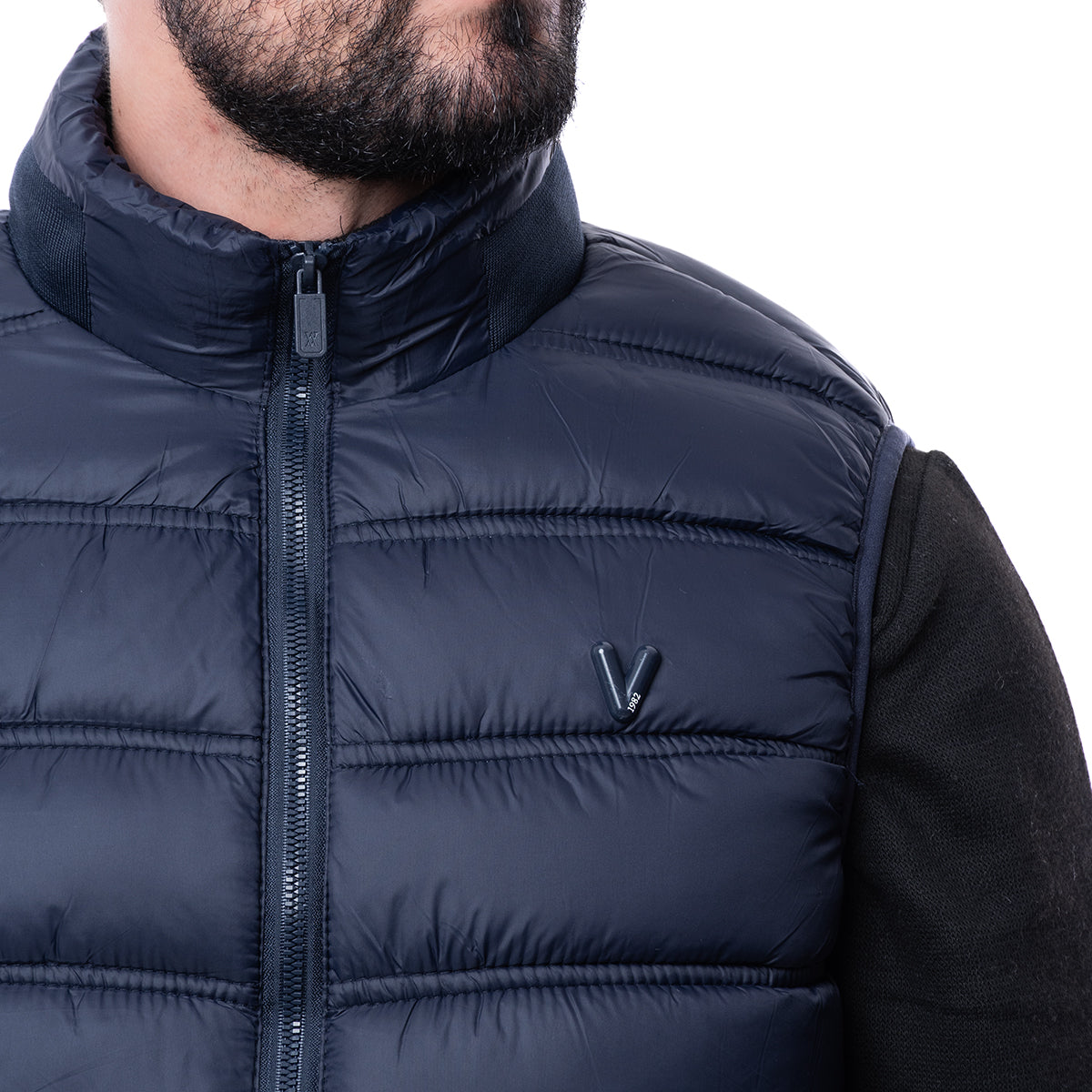 Chaleco acolchado en color azul marino con cierre de cremallera y bolsillos laterales.