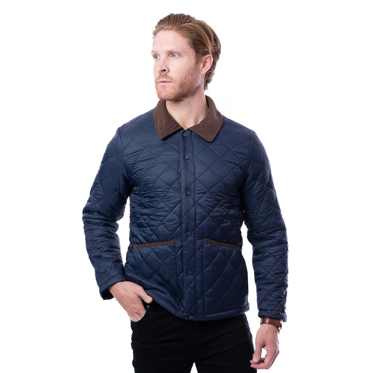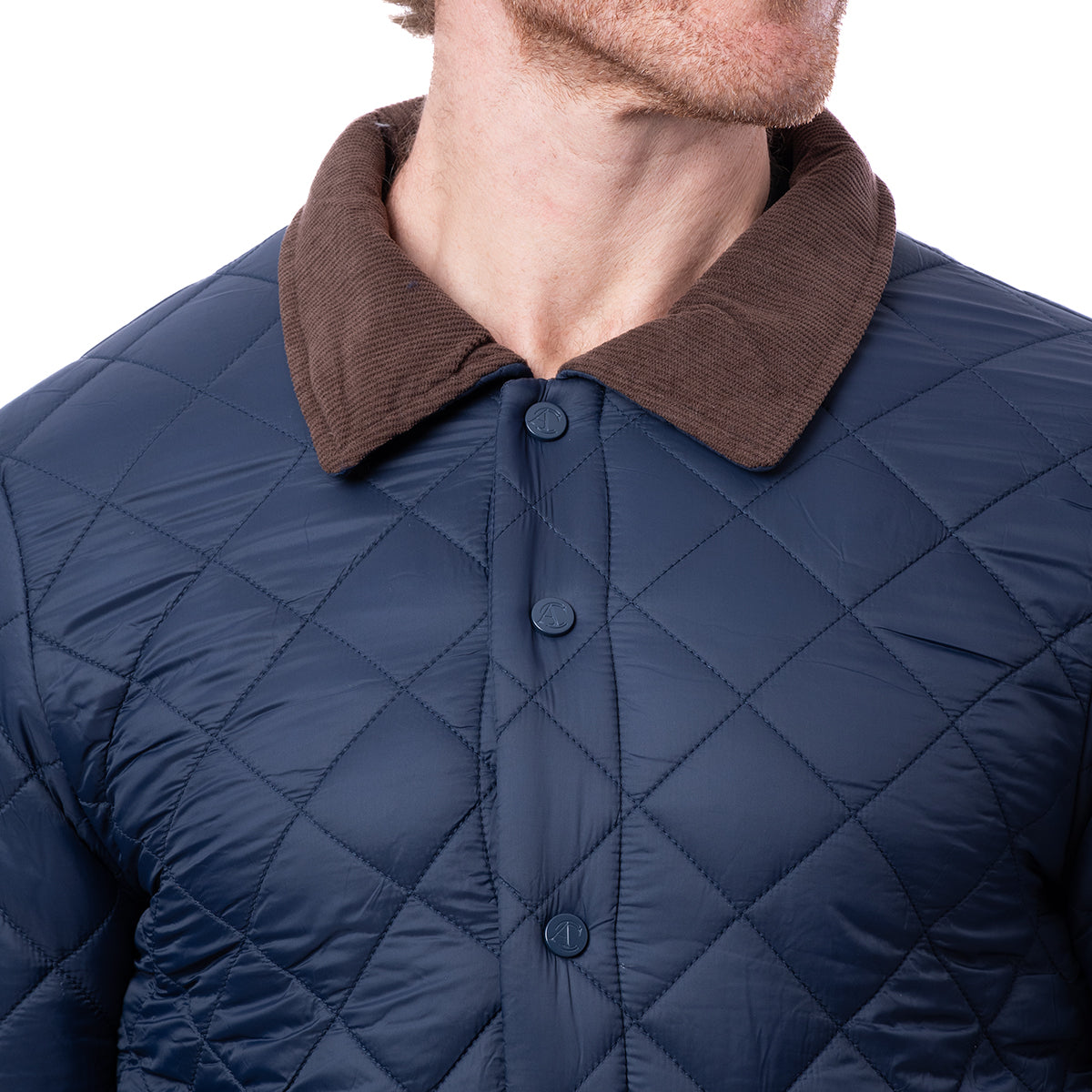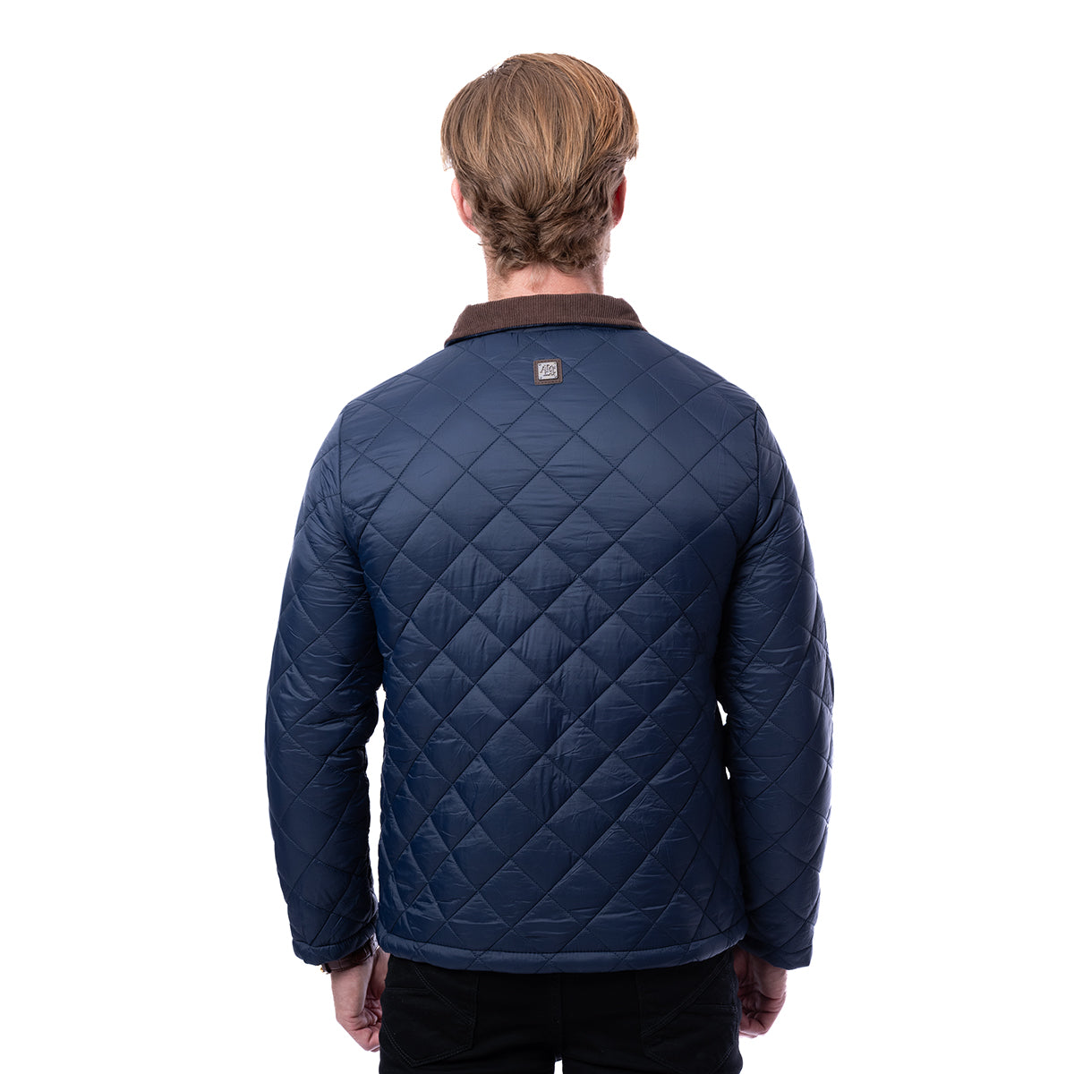 Chamarra capitonada en color marino con diseño liso y cierre de broche de presión.