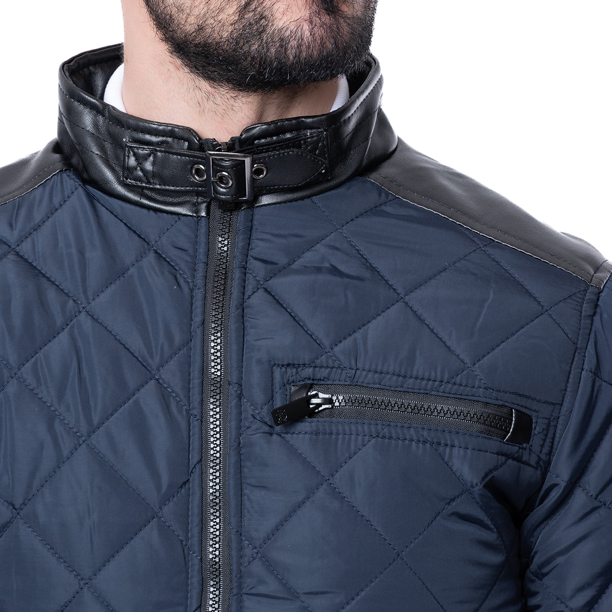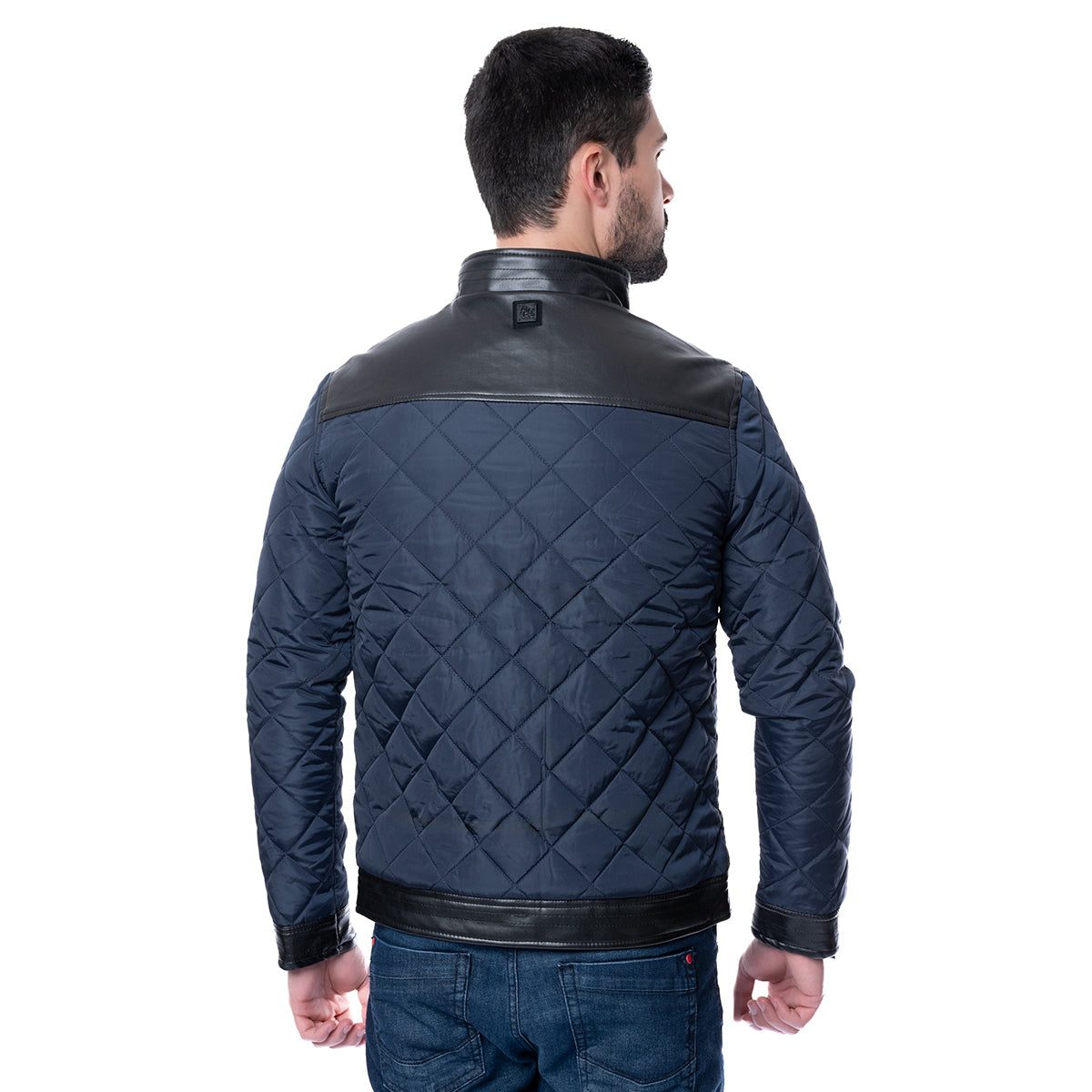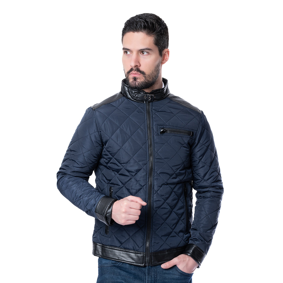 Chamarra marino con diseño capitonado, cuello alto y cierre de cremallera. Corte Casual Fit, ideal para un look moderno y versátil.