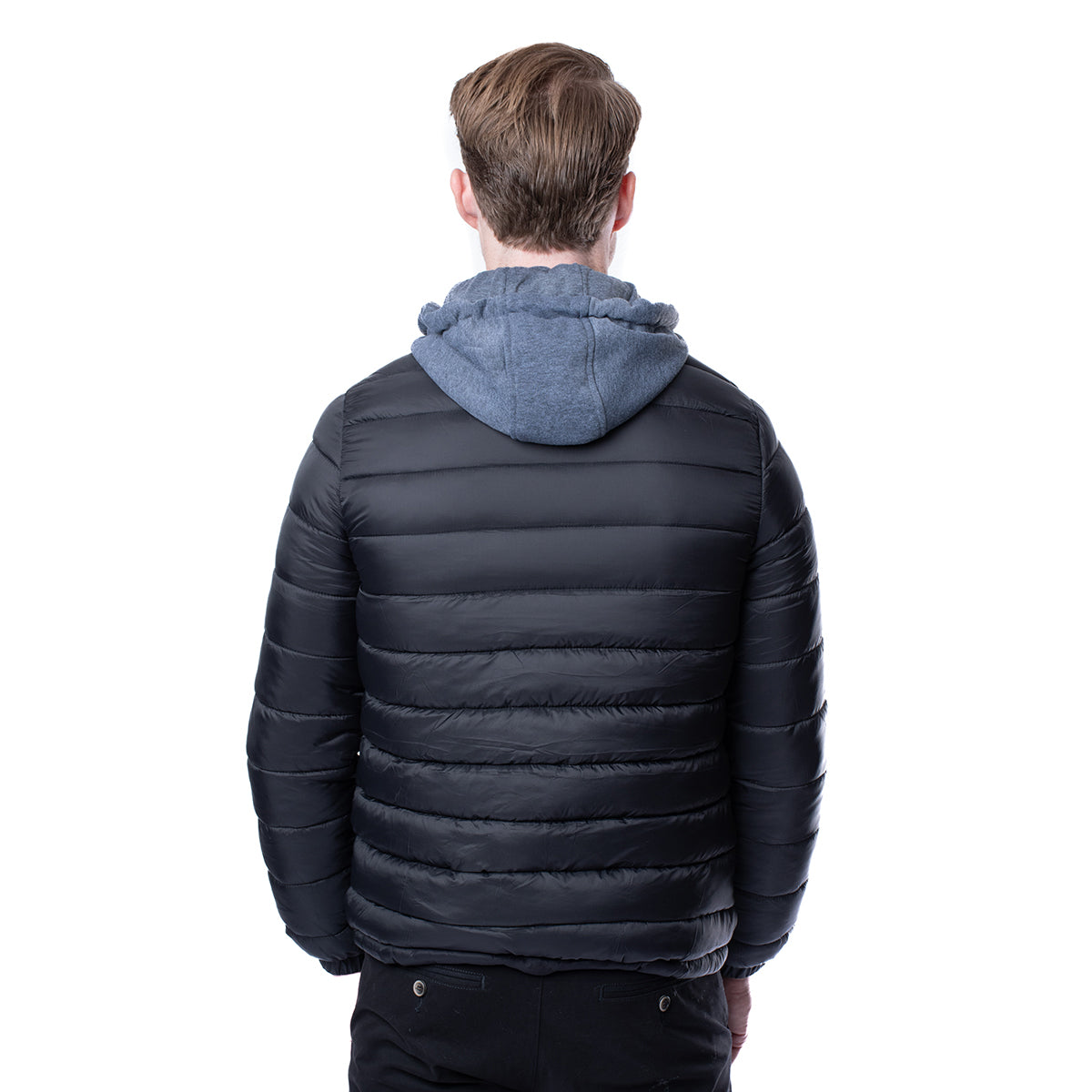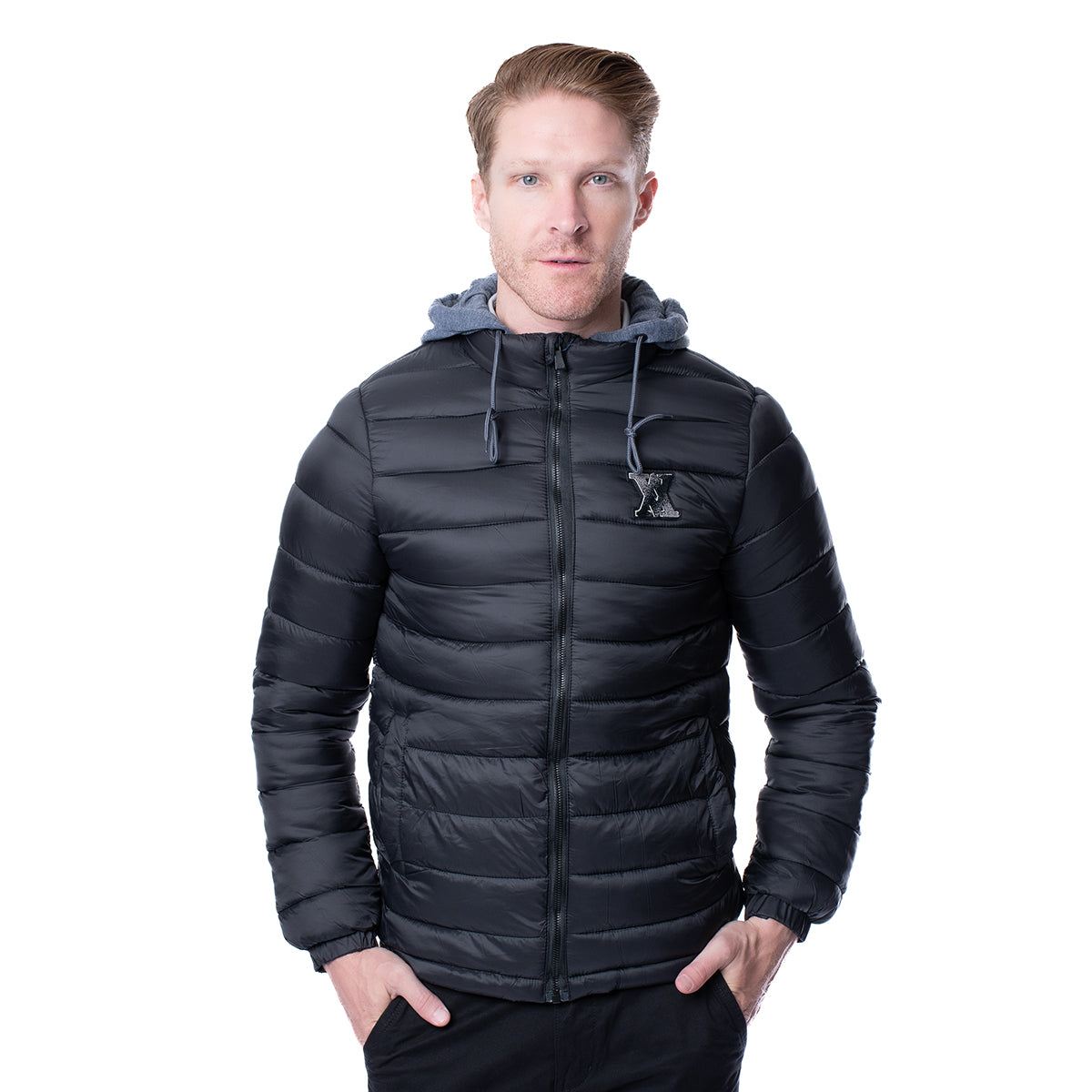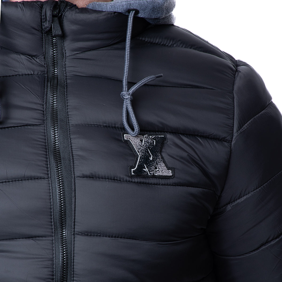 Chamarra negra acolchada con cierre de cremallera y bolsillos funcionales. Corte Casual Fit que aporta comodidad y estilo urbano.