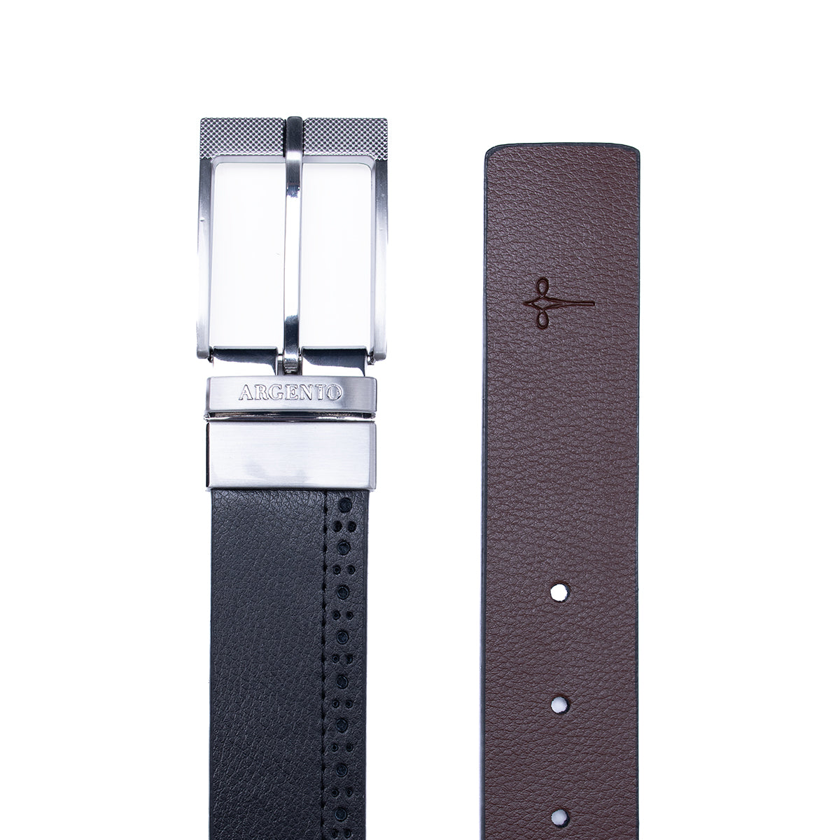 Cinturón reversible en color negro con hebilla de marco, con costuras decorativas.