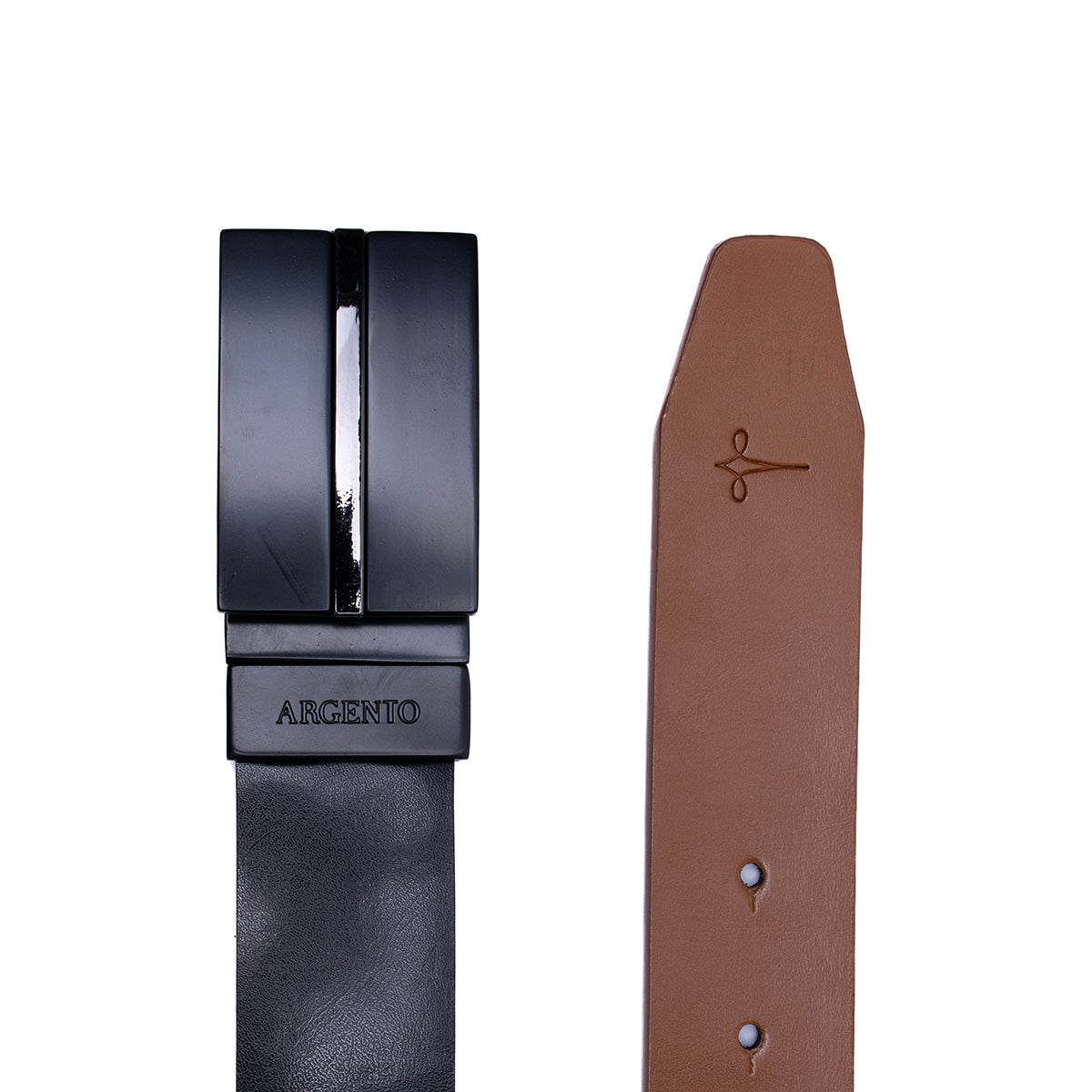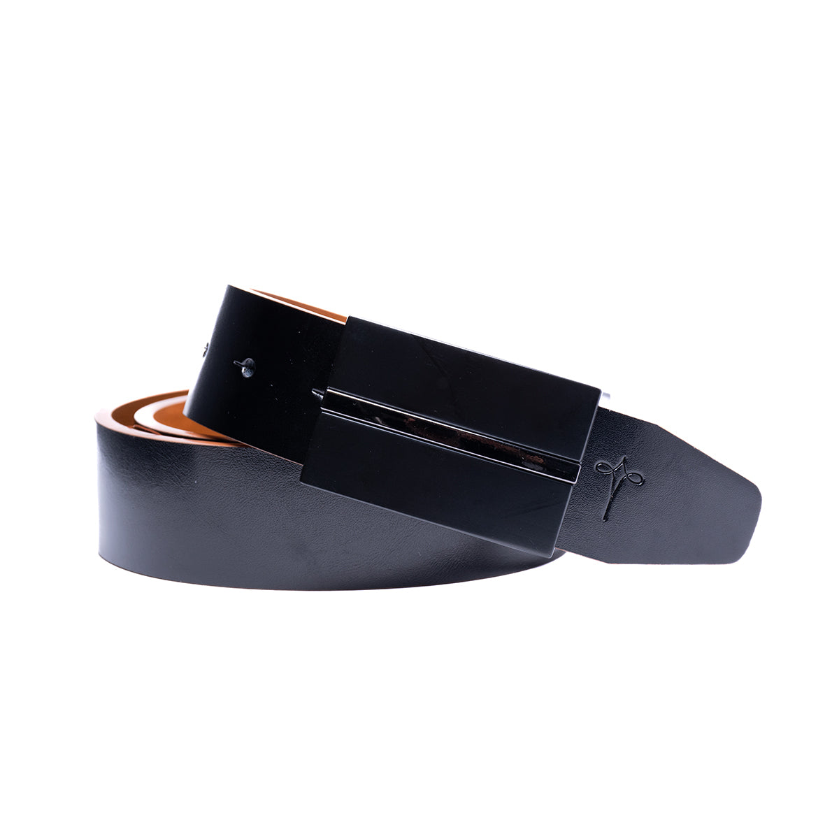 Cinturón negro reversible con diseño liso en ambas caras, con hebilla metálica tono negro en forma de placa. Un accesorio indispensable que se adapta a cualquier tipo de pantalón, aportando un acabado elegante y equilibrado. Perfecto para complementar tanto atuendos formales como casuales.