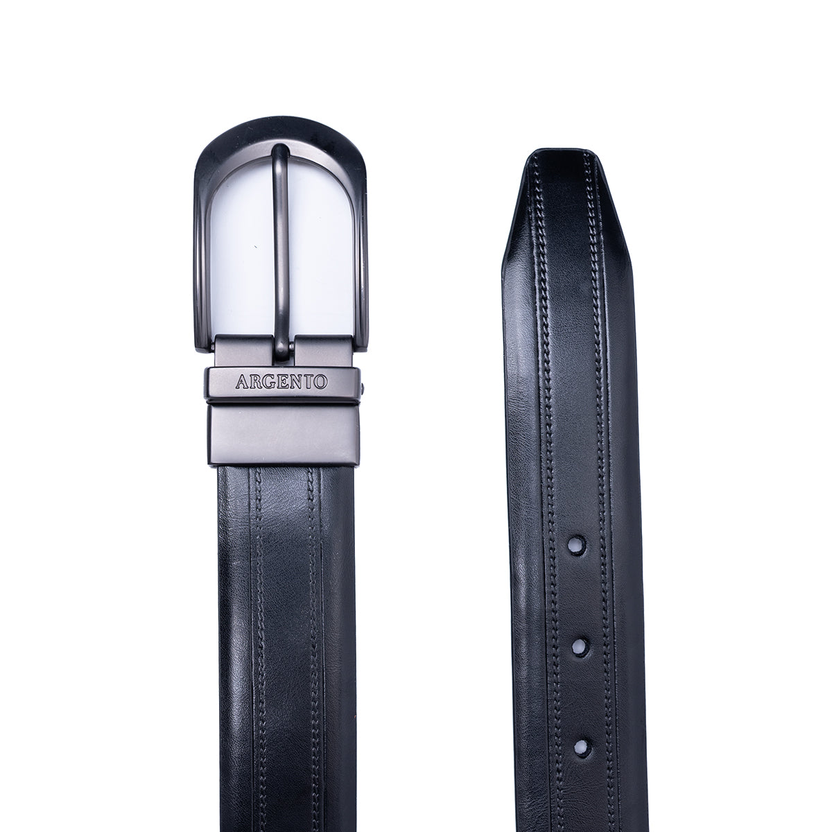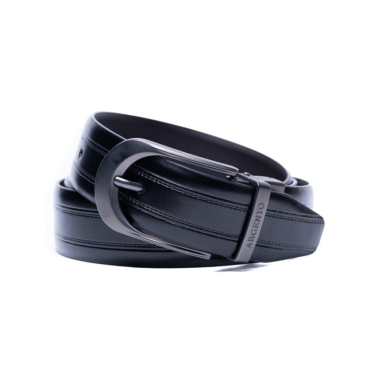 Cinturón reversible negro y café con diseño liso y hebilla metálica negra en forma curva moderna con acabado brillante.