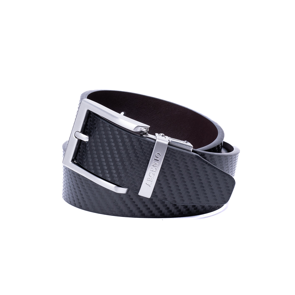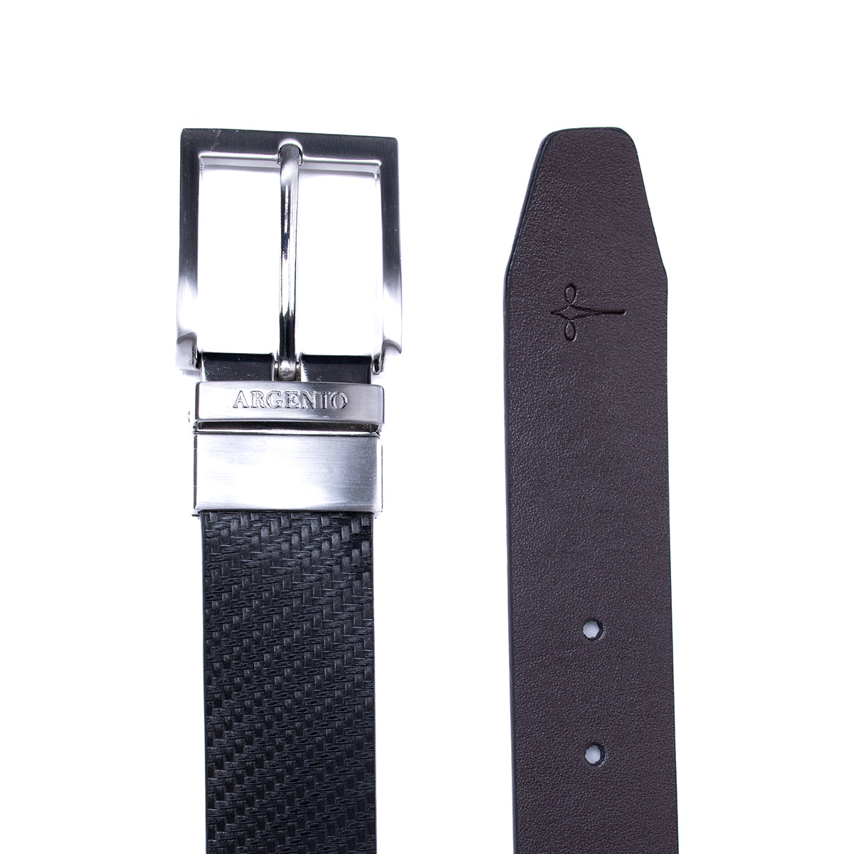 Cinturón negro reversible con textura tipo tramado visible en la cara principal y acabado liso al reverso, con hebilla metálica tono plateado en forma de marco. Un accesorio indispensable que se adapta a cualquier tipo de pantalón, aportando un acabado elegante y equilibrado. Perfecto para complementar tanto atuendos formales como casuales.