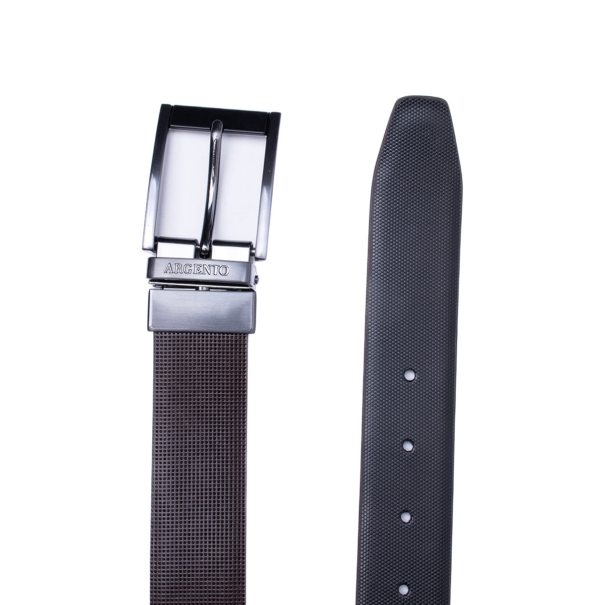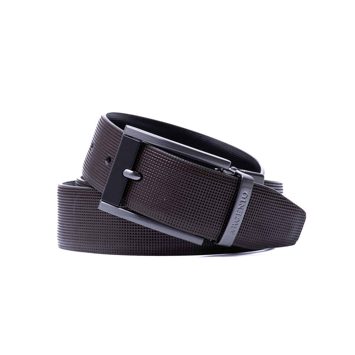 Cinturón café reversible con diseño microtexturizado y acabado liso al reverso, con hebilla metálica tono acero oscuro en forma de marco. Un accesorio indispensable que se adapta a cualquier tipo de pantalón, aportando un acabado elegante y equilibrado. Perfecto para complementar tanto atuendos formales como casuales.