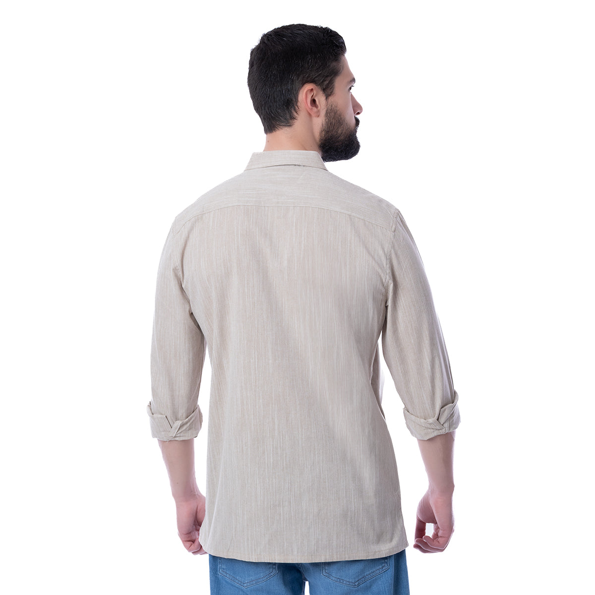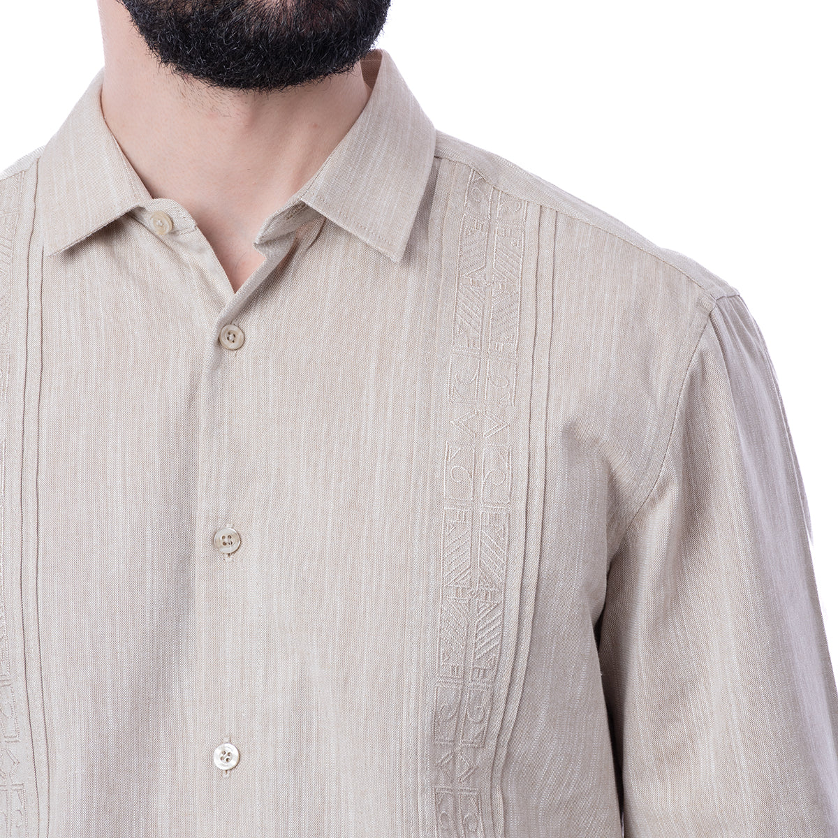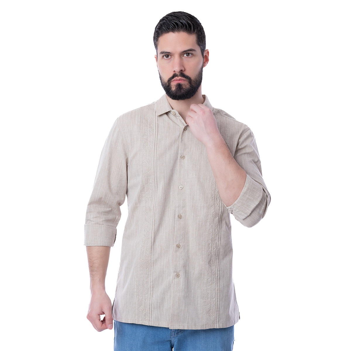 Guayabera corte Slim Fit beige con diseño de alforzas, cuello cubano, botonadura al frente y manga larga. Una prenda tradicional reinterpretada con un estilo moderno, perfecta para mantenerte fresco y elegante en cualquier ocasión. Ideal para eventos formales en climas cálidos o para un look relajado con distinción.