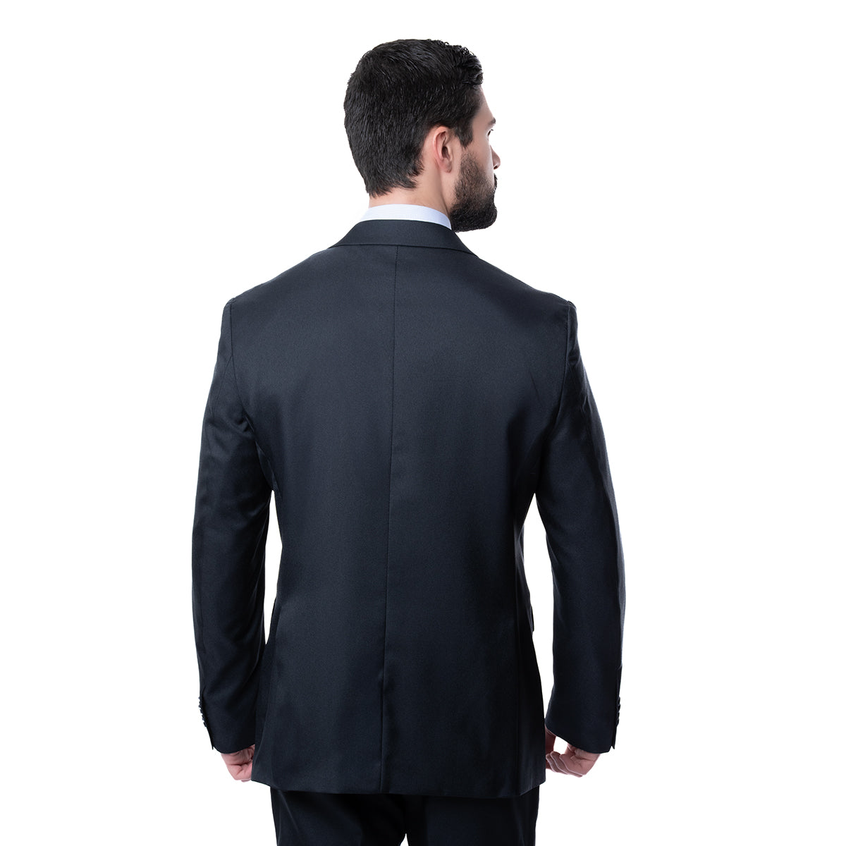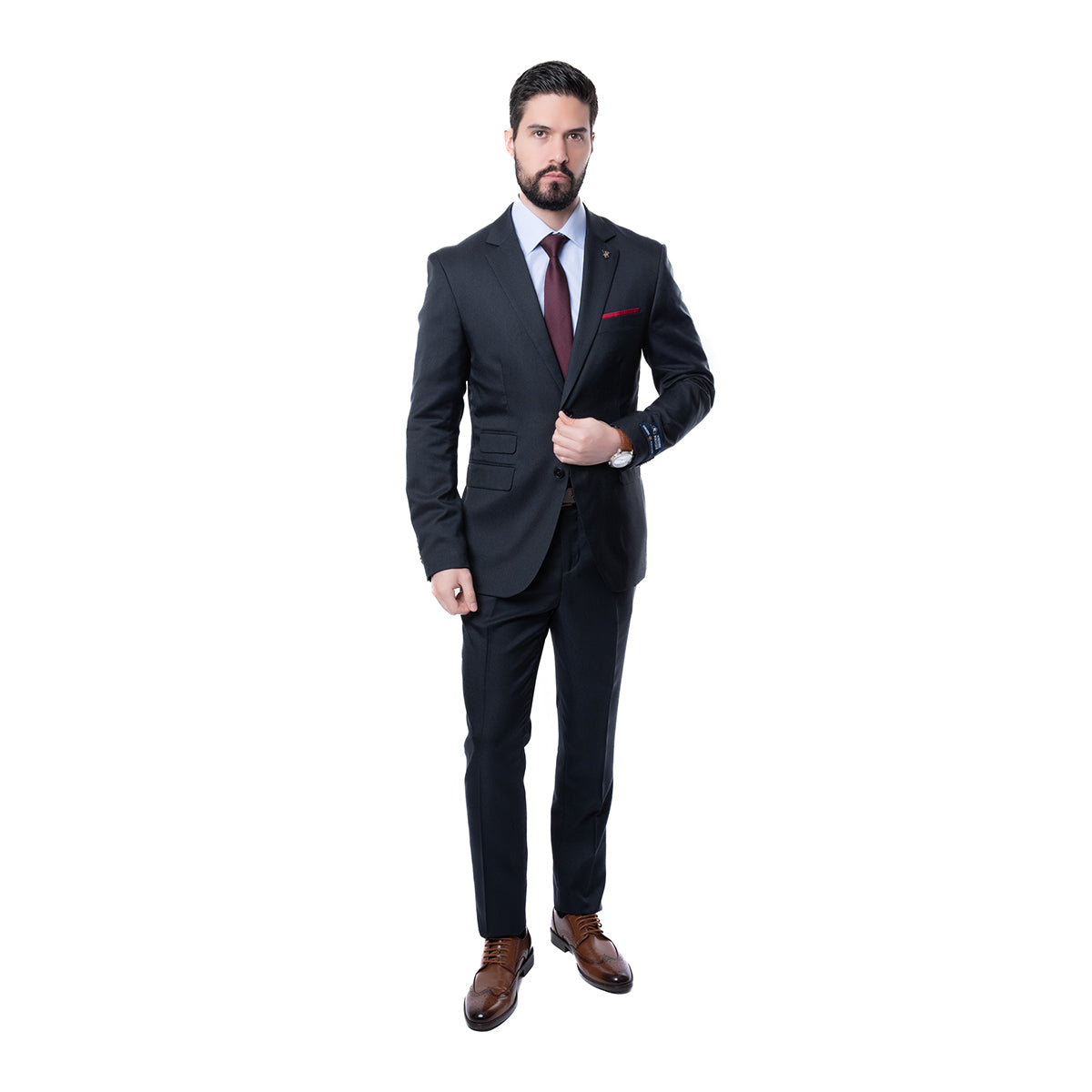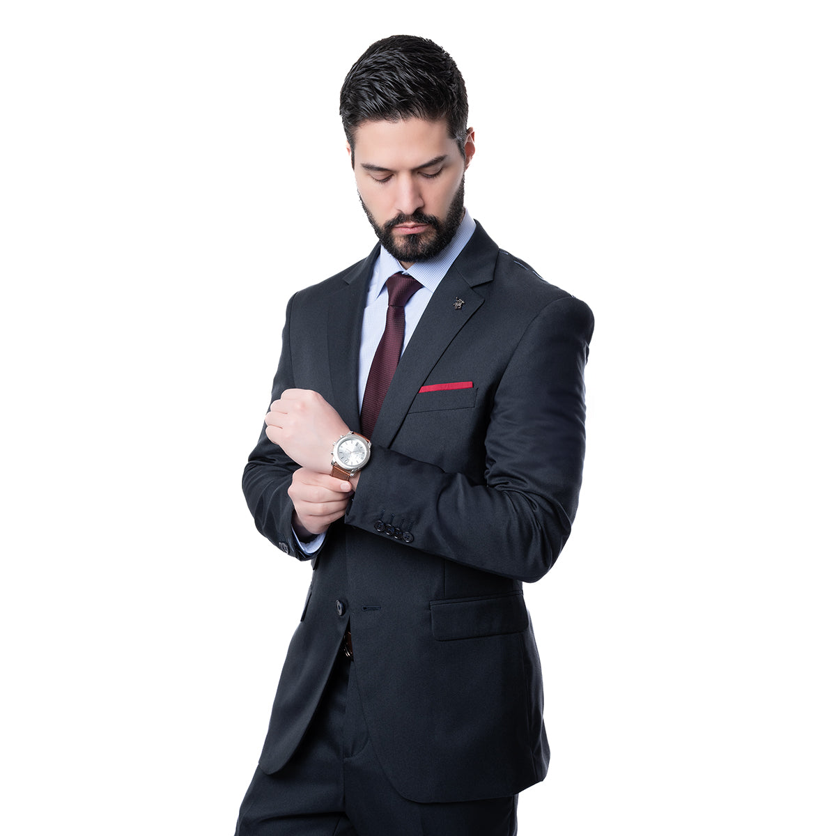 Traje corte Slim Fit de 2 piezas negro con diseño liso, solapa en muesca, dos botones al frente y bolsillos con solapa. Con el corte SLIM FIT tendrás un atuendo cómodo, dándote la libertad con un estilo semi ajustado.