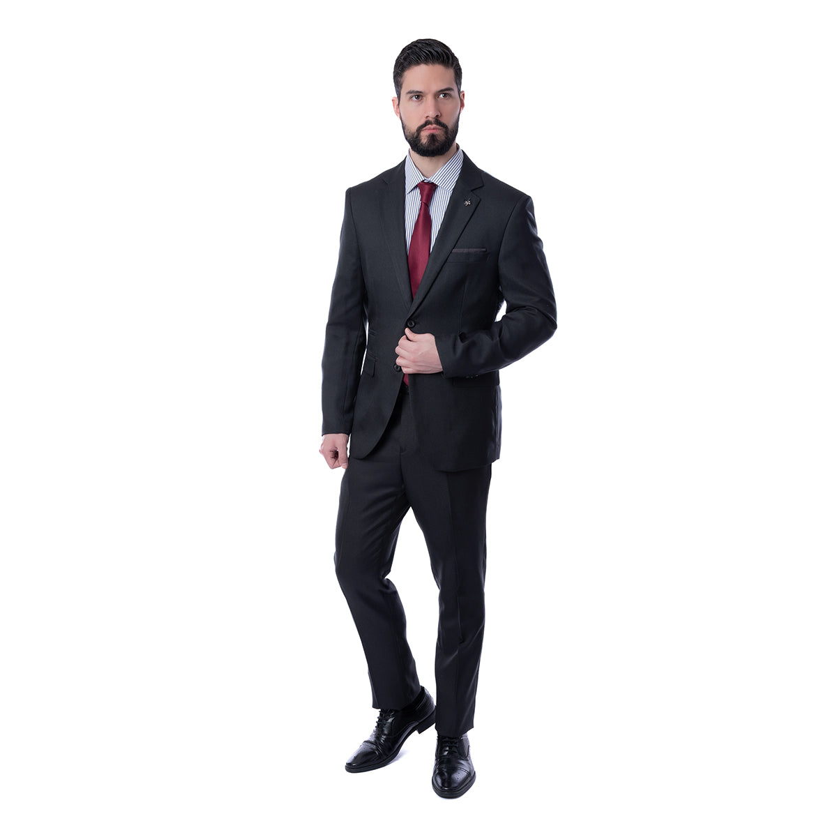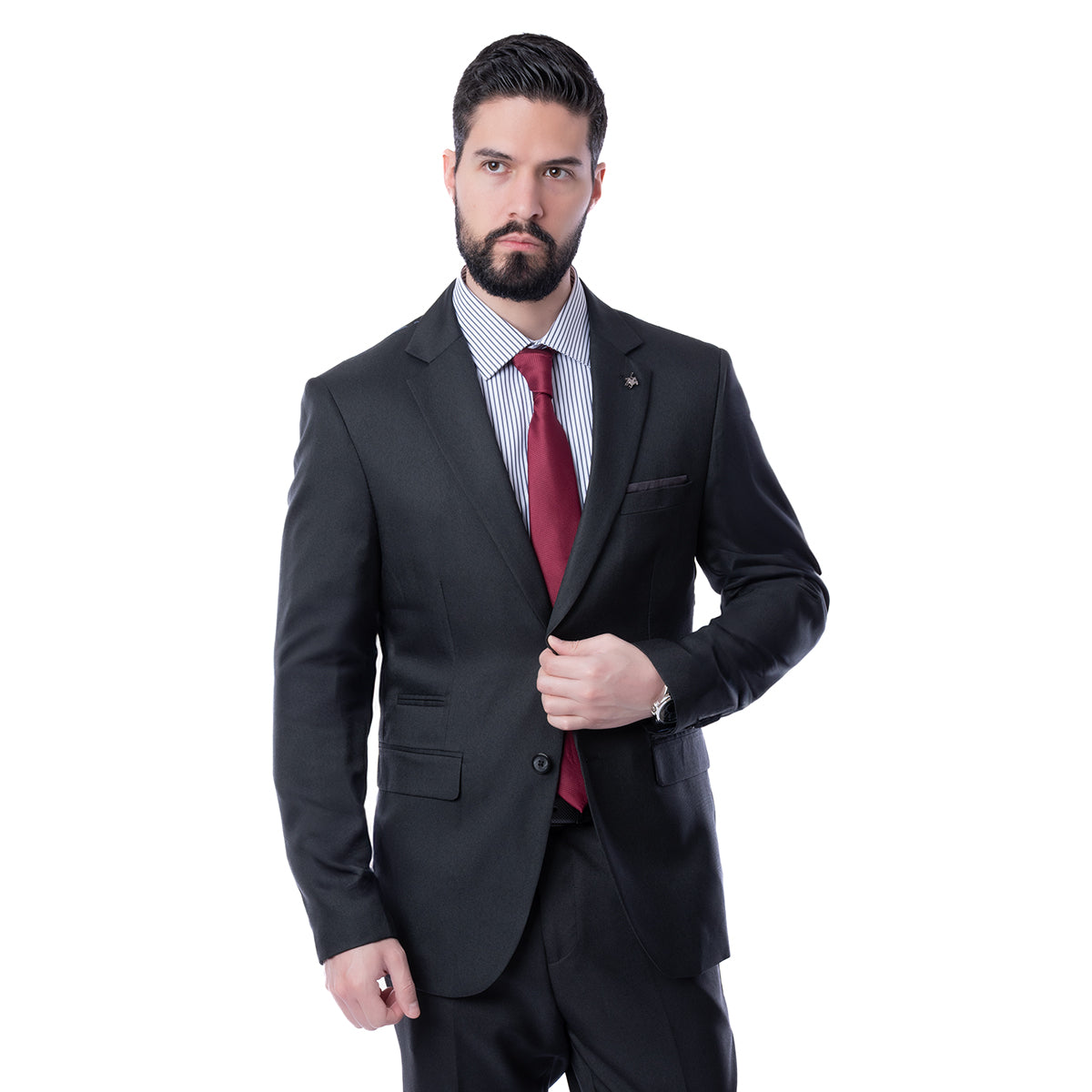 Traje corte Slim Fit de 2 piezas en color negro con diseño liso. Saco con solapa en pico, dos botones frontales y bolsillos con solapa. Pin extraíble. Pantalón con diseño liso y bolsillos traseros. Con el corte SLIM FIT tendrás un atuendo cómodo, dándote la libertad con un estilo semi ajustado.