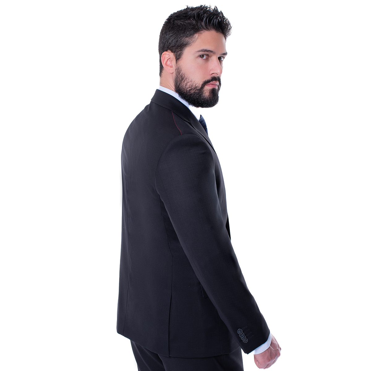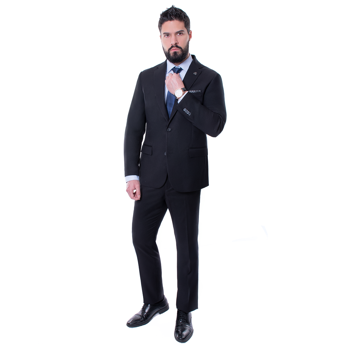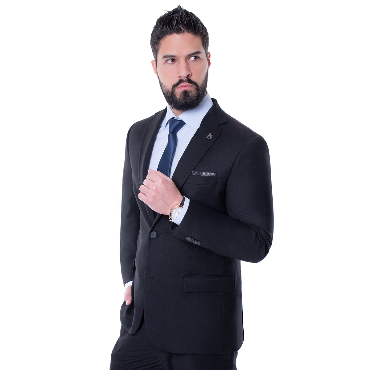 Traje de vestir para hombre en corte slim fit, color negro y diseño liso. Una opción formal con líneas limpias para eventos, graduaciones y ocasiones donde necesitas verte impecable.