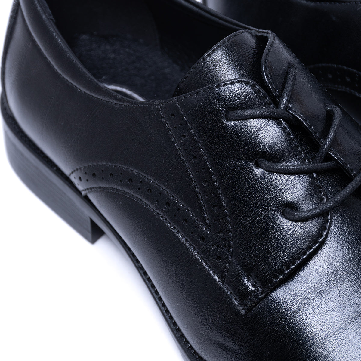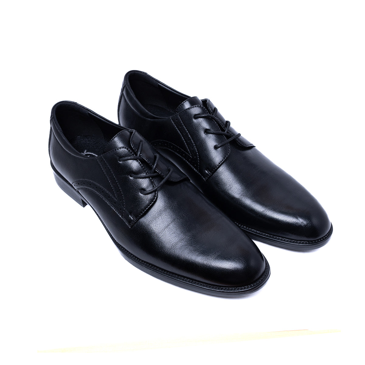 Par de zapatos negros con acabado liso y diseño elegante con cierre mediante agujetas. Suela y tapa antiderrapante. Un elemento imprescindible que combina confort y estilo, pensado para acompañarte con elegancia y versatilidad en cualquier momento.