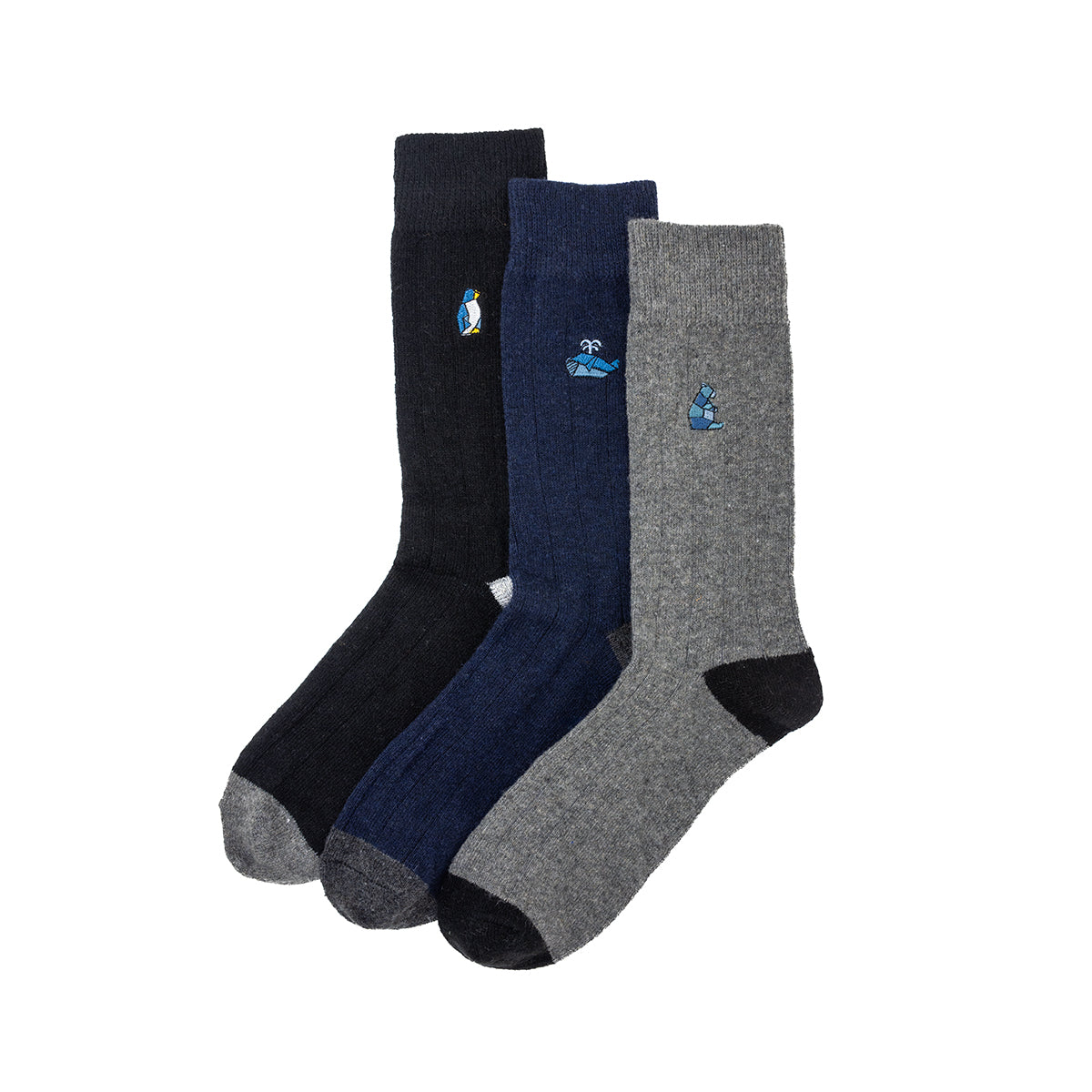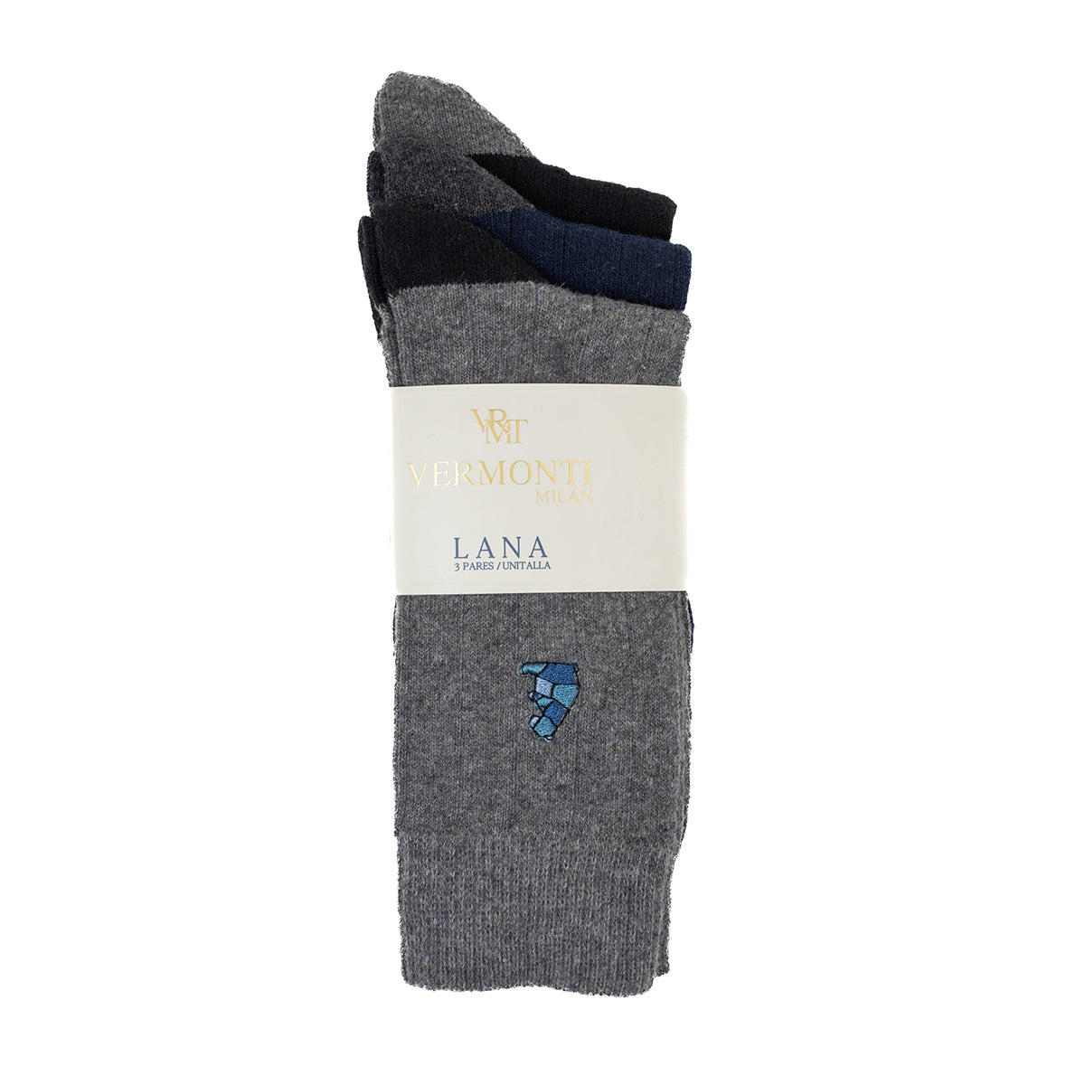 Set de 3 pares de calcetines largos de lana en diseño liso, con diseño de animales en forma geometríca.