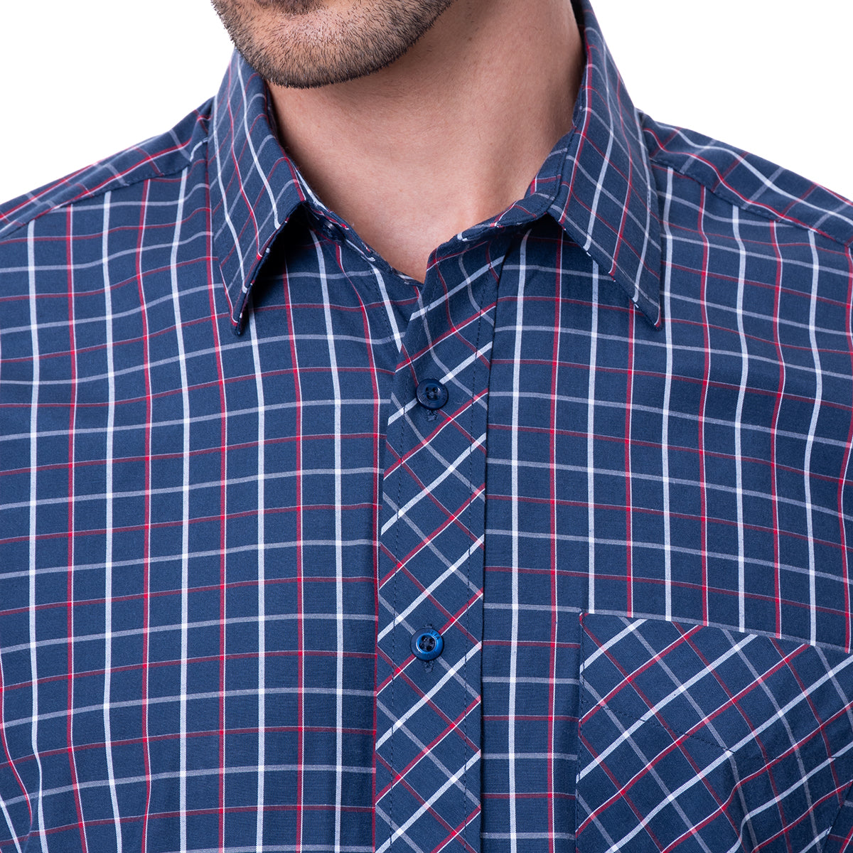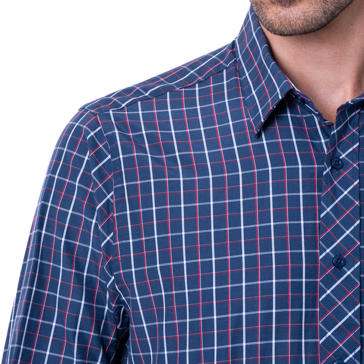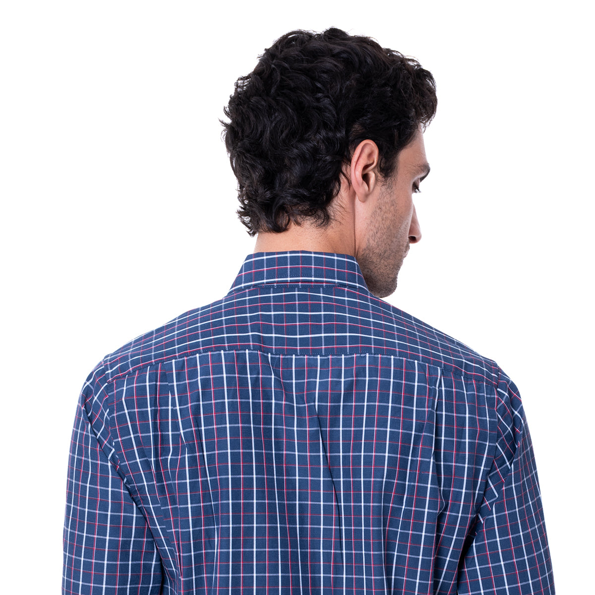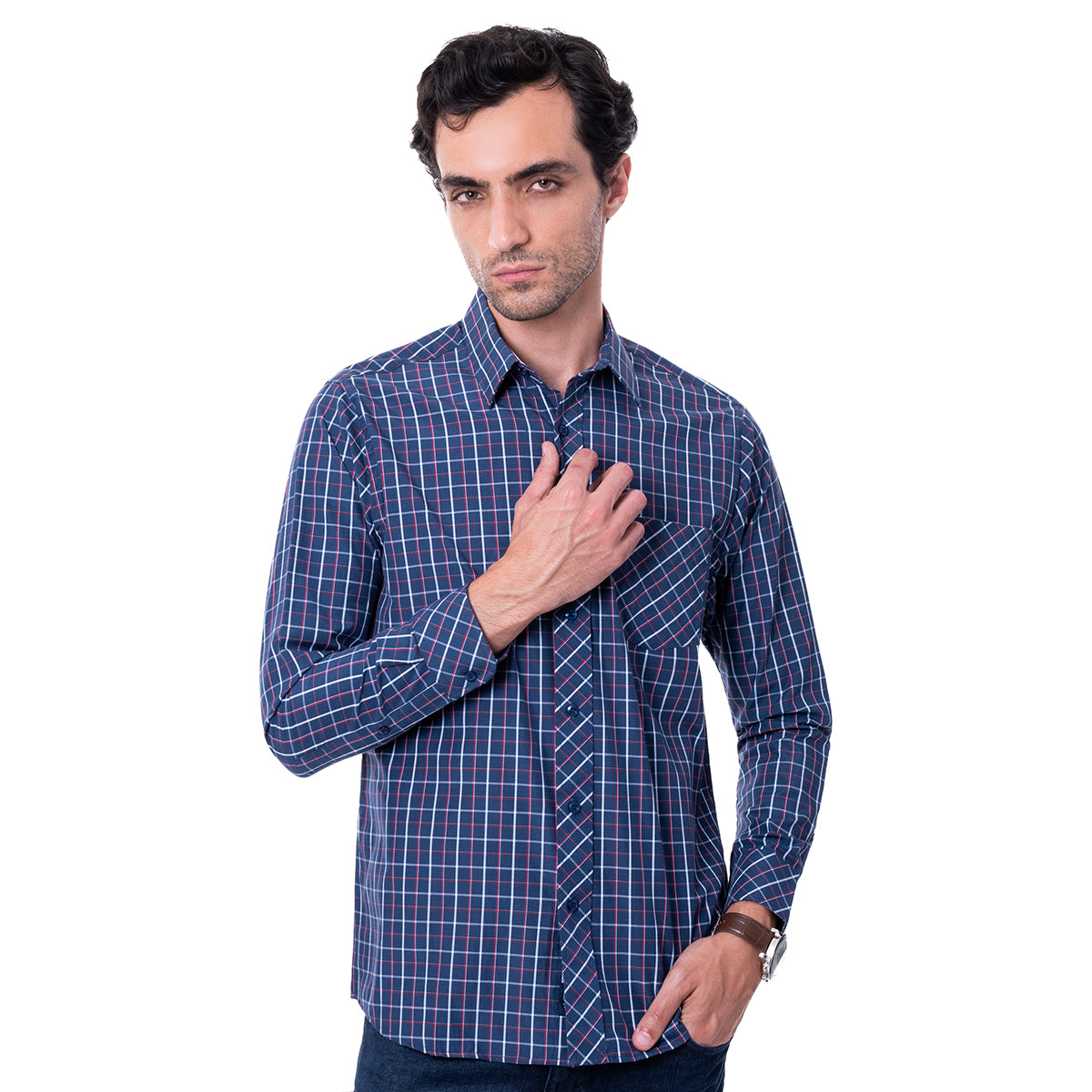 Camisa de corte Classic Fit, en color marino y diseño a cuadros. De cuello italiano, manga larga y cierre frontal de botonadura. Bolsillo a la altura del pecho.