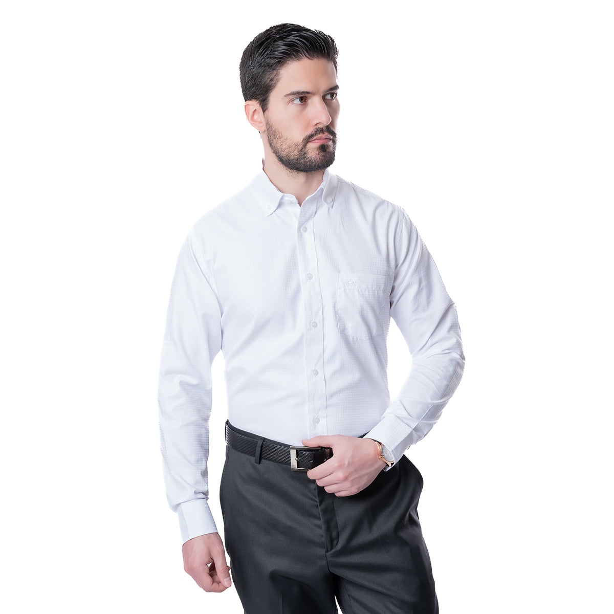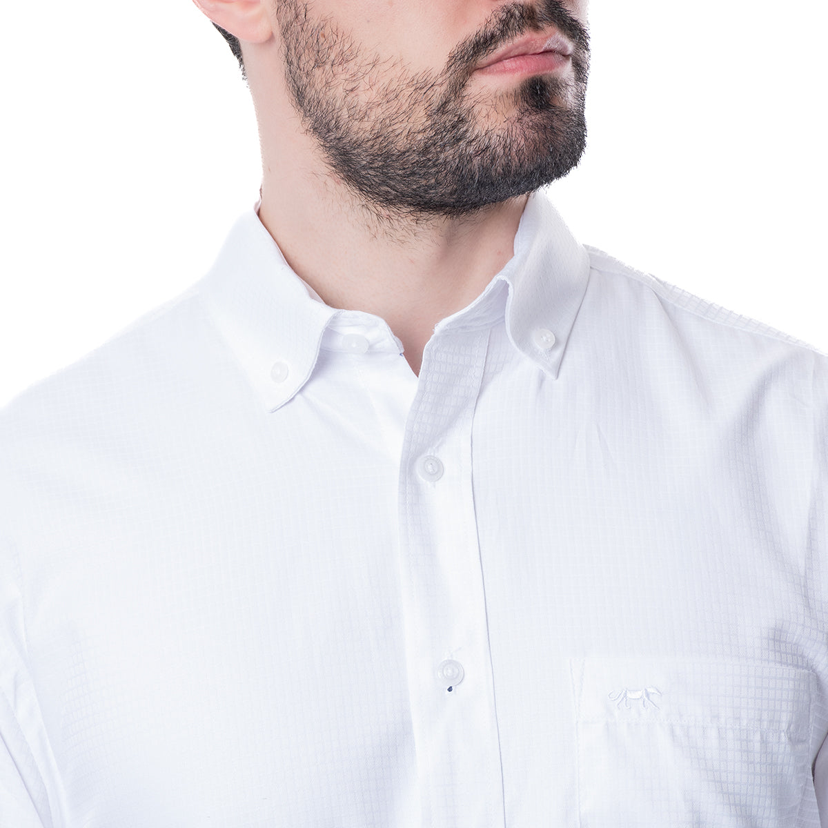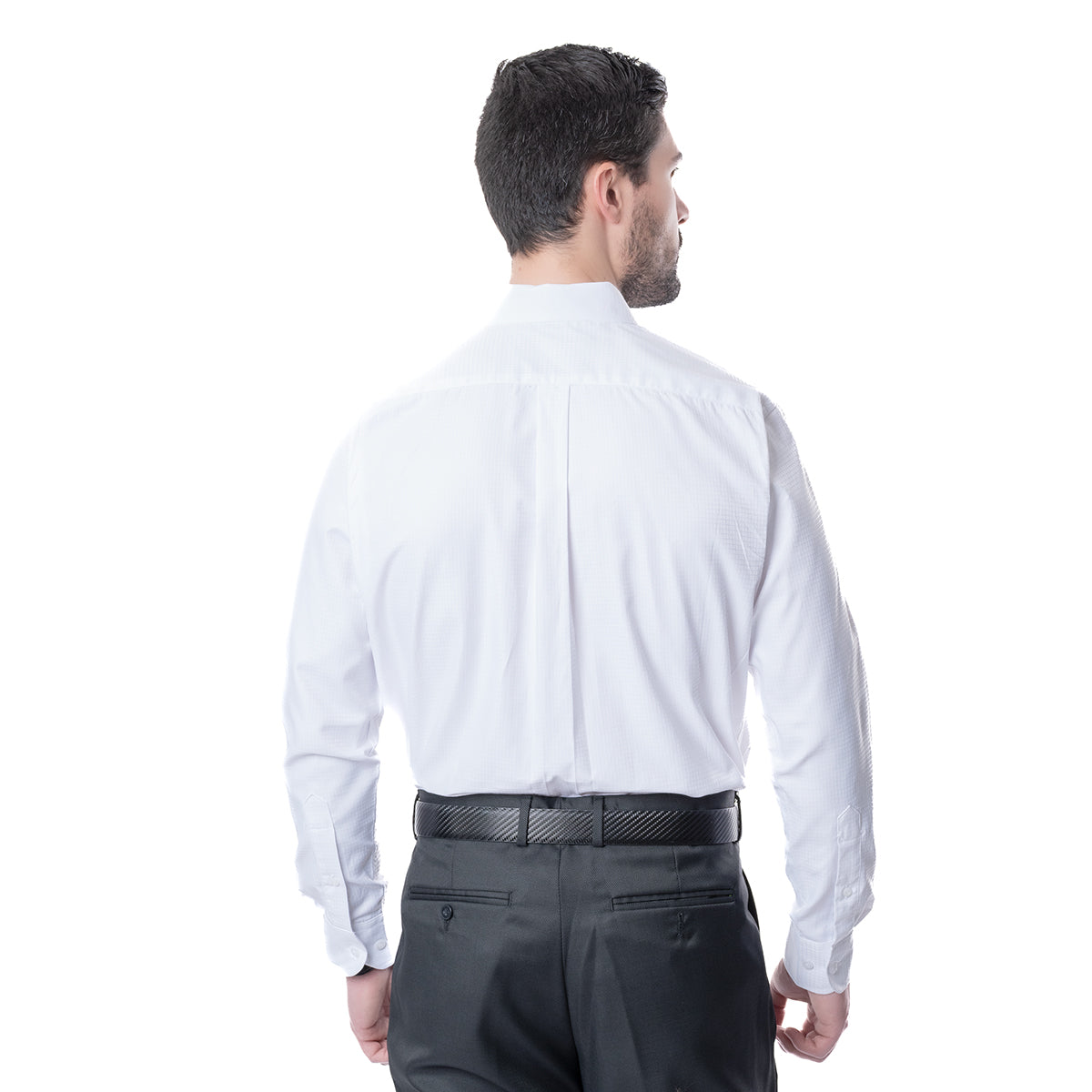 Camisa de manga larga en color blanco, diseño liso. Cuello button down, bolsillo a la altura del pecho y cierre frontal de botones.