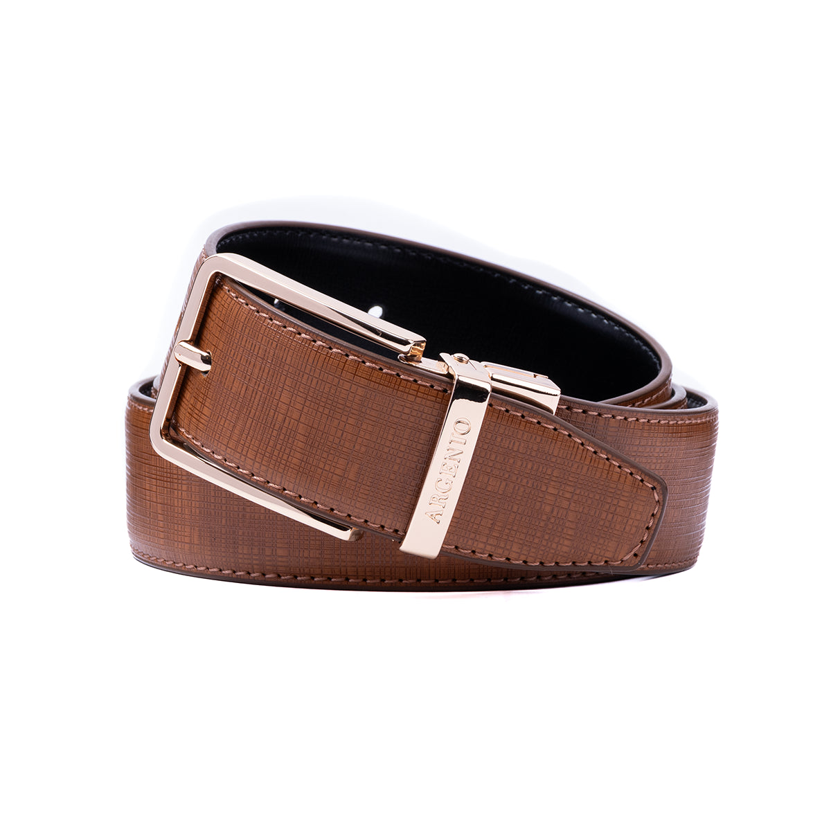 Cinturón para hombre en color café, con grabado sutil y hebilla tipo marco en tono oro. El detalle que cierra el look con precisión: se ve igual de bien con pantalón de vestir que con jeans.