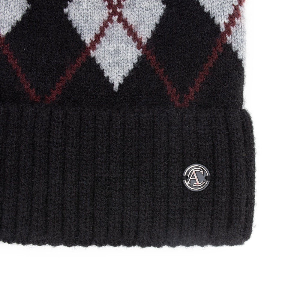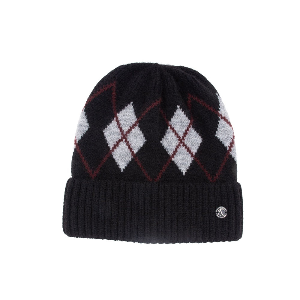 Gorro de estilo "Cuff Beanie" de color vino y diseño en rombos.