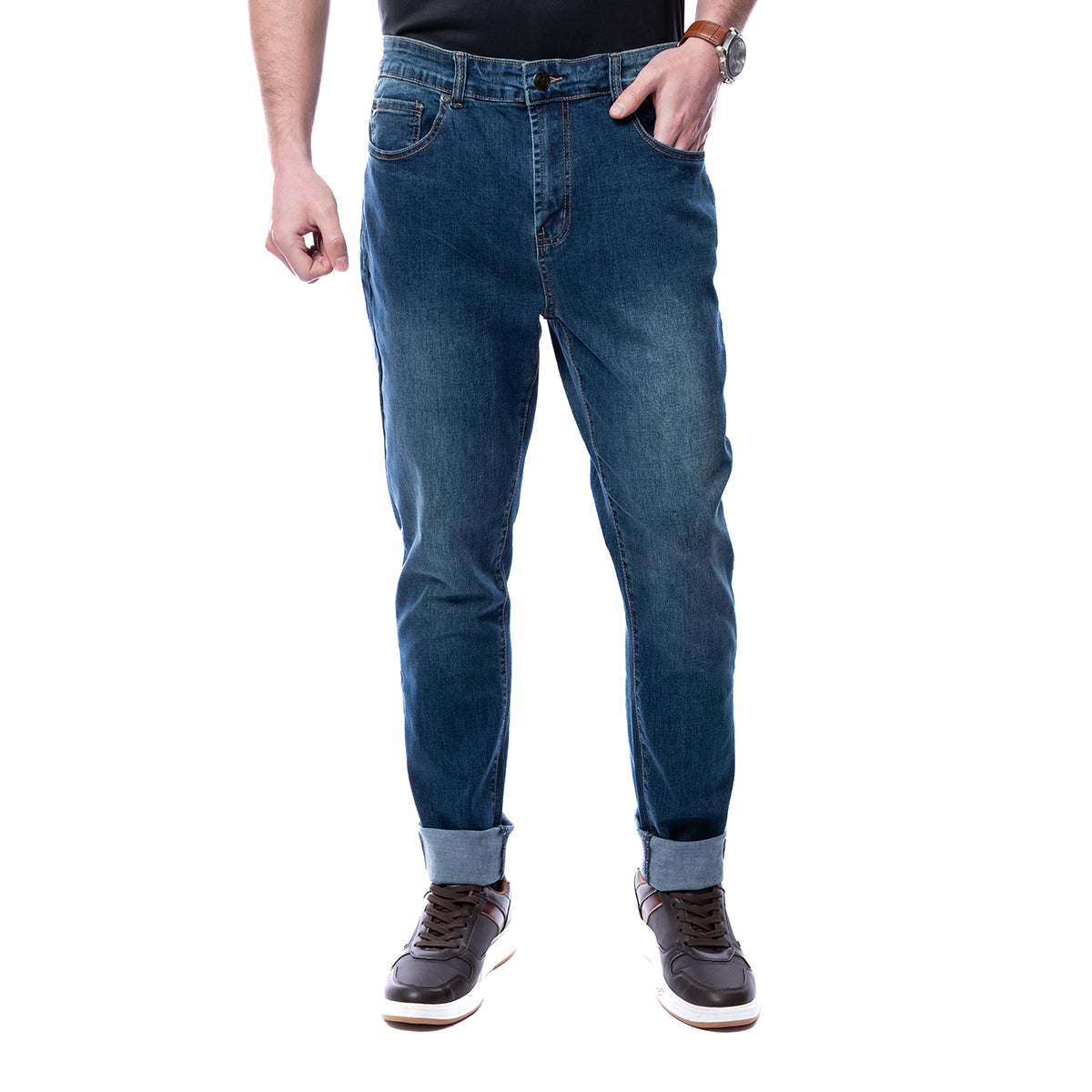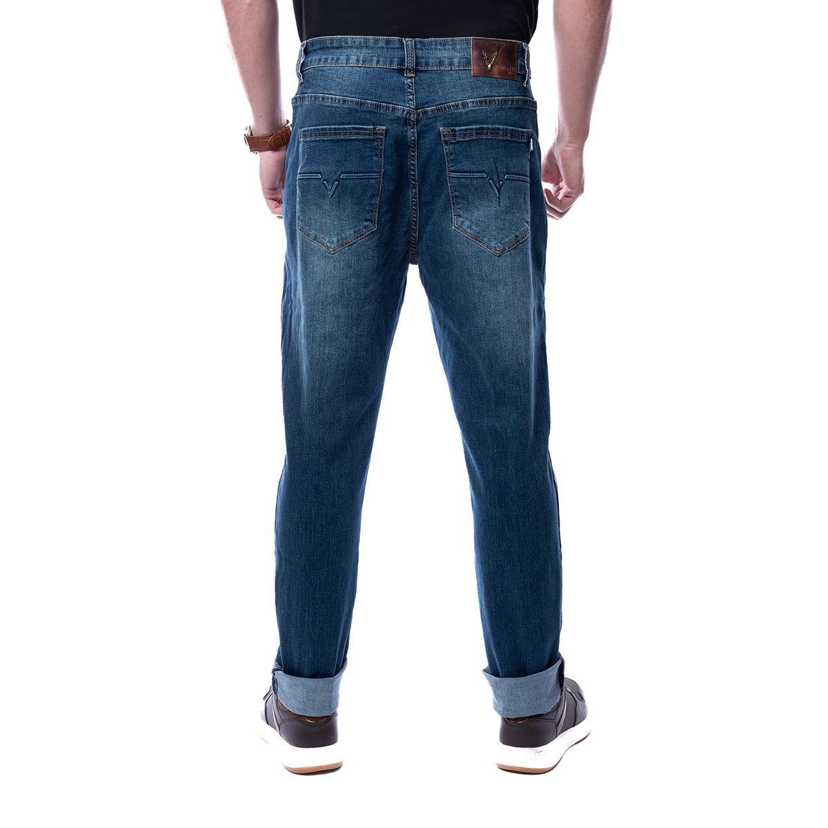 Jeans en color azul marino con cinco bolsillos y cierre frontal de botonadura y cremallera.