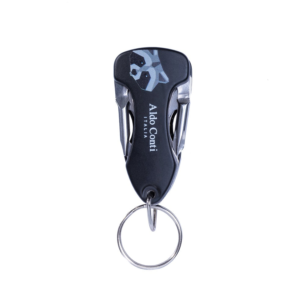 Llavero Aldo Conti en color negro con print en forma de mapache. Con anilla para agarre.