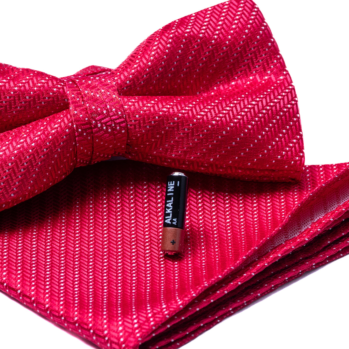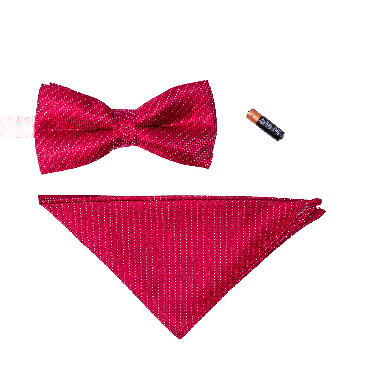 Moño en color rojo con diseño texturizado, acompañado de pin con forma de pila.