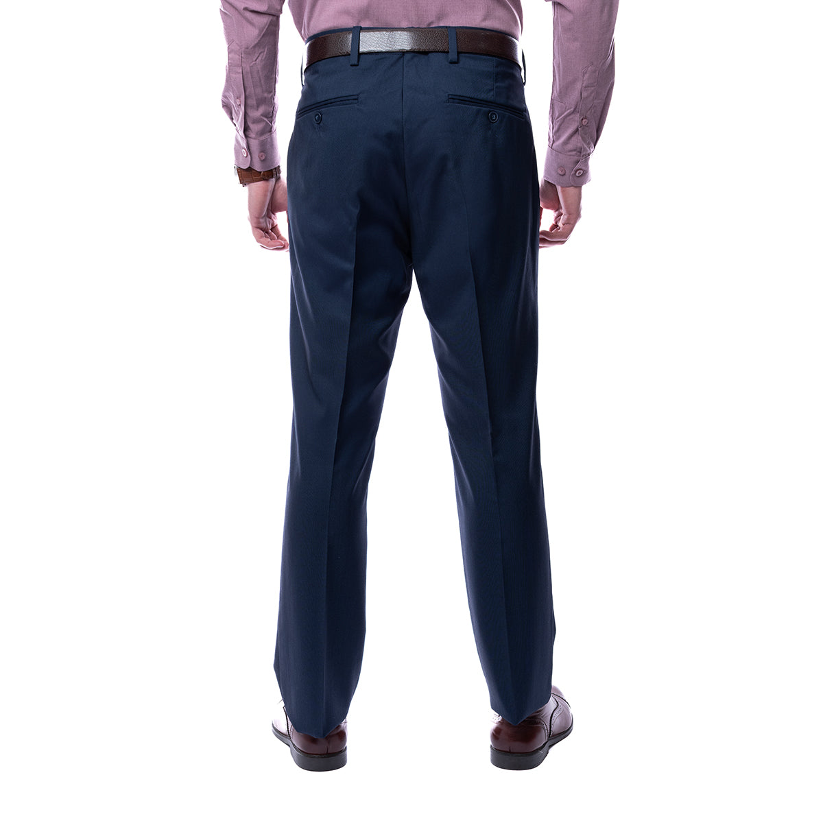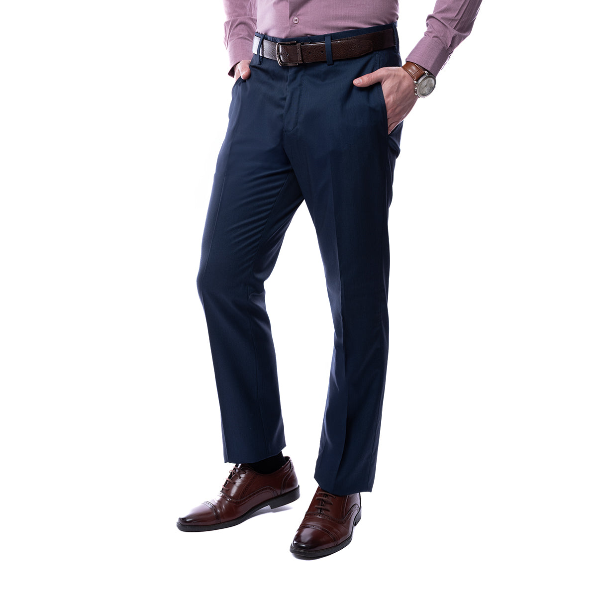 Pantalón de vestir en color azul marino con bolsillos frontales y traseros, cierre frontal de botonadura y cremallera.