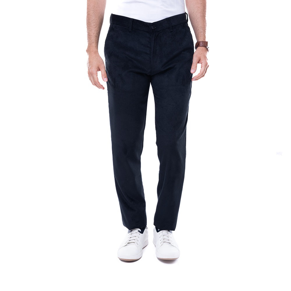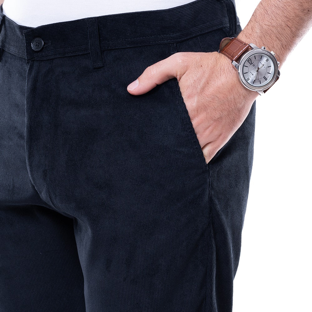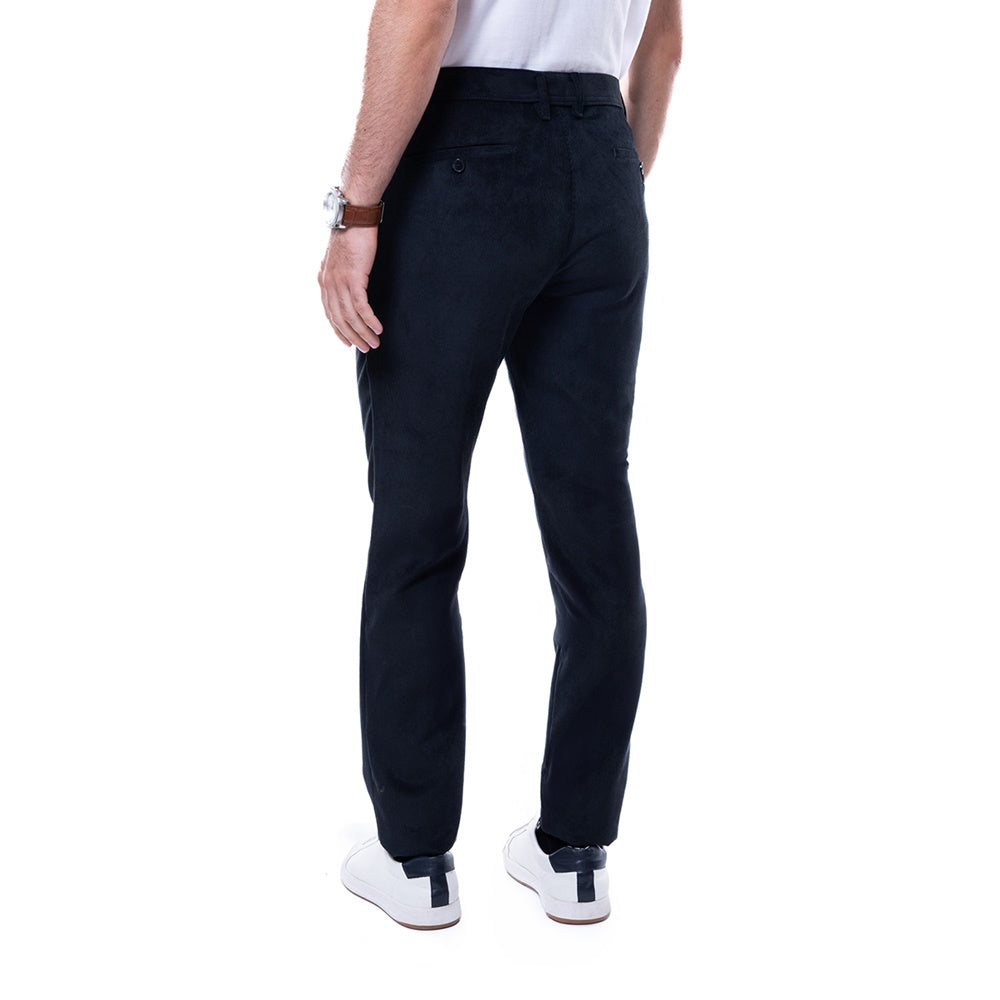 Pantalón de pana de corte Slim Fit, en color negro y diseño con textura, con bolsillos frontales sin botón y traseros de doble vivo con botón.