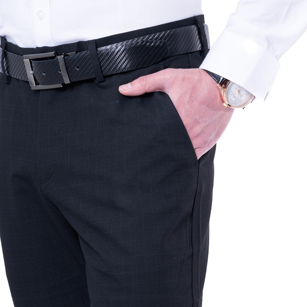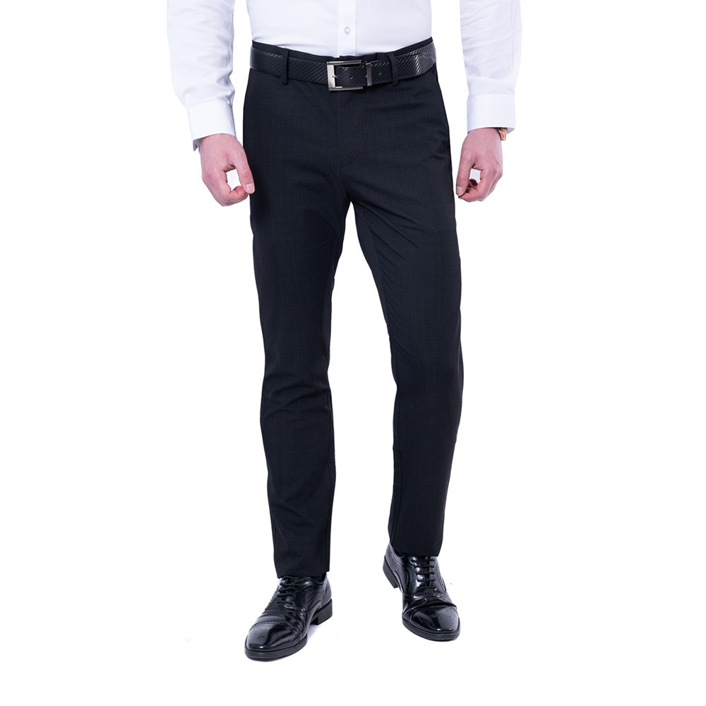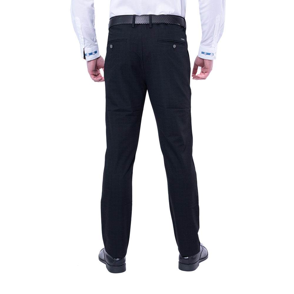 Pantalón de corte Slim Fit, en color negro y diseño liso, con bolsillos frontales sin botón y traseros de vibo con botón decorado. Cierre frontal con cremallera y botón.