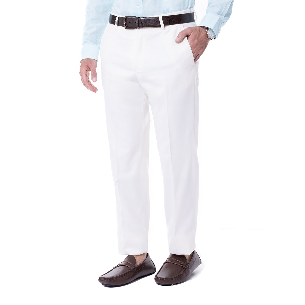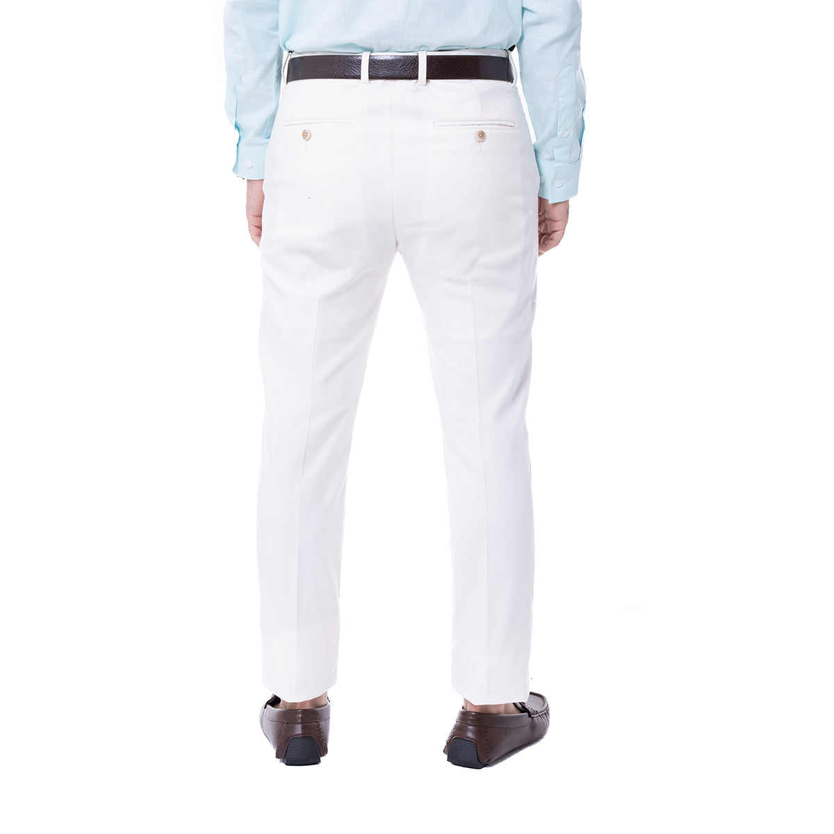 Pantalón de lino de corte Slim Fit, en color hueso y diseño liso, con bolsillos frontales sin botón, botón extra de lado derecho de dos vibos y traseros de vibo con botón. Cierre frontal con cremallera y botón.