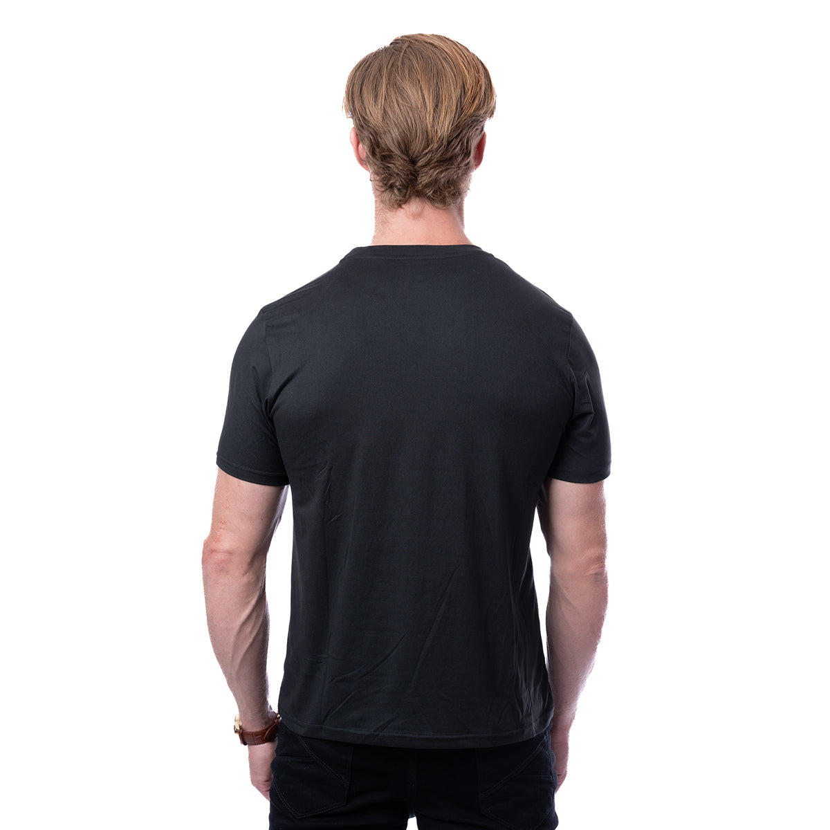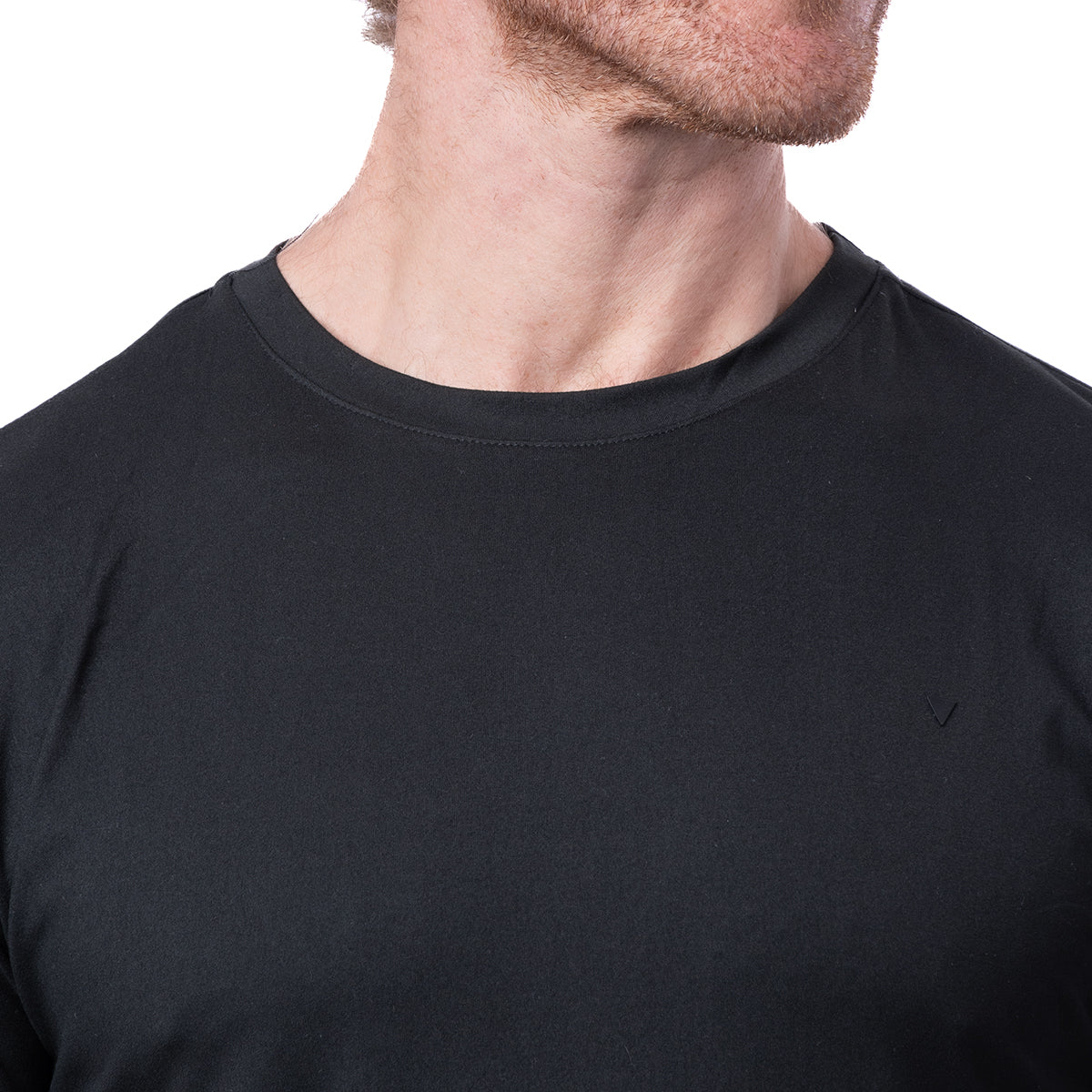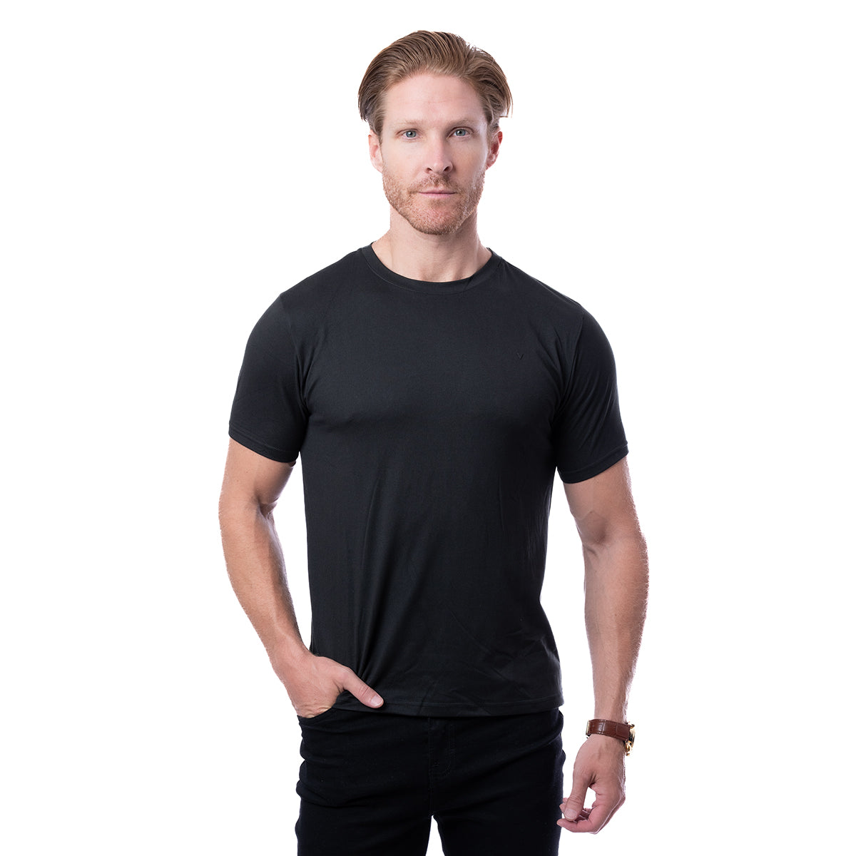 Playera de corte Slim Fit, en color negra, diseño liso, cuello redondo y manga corta.