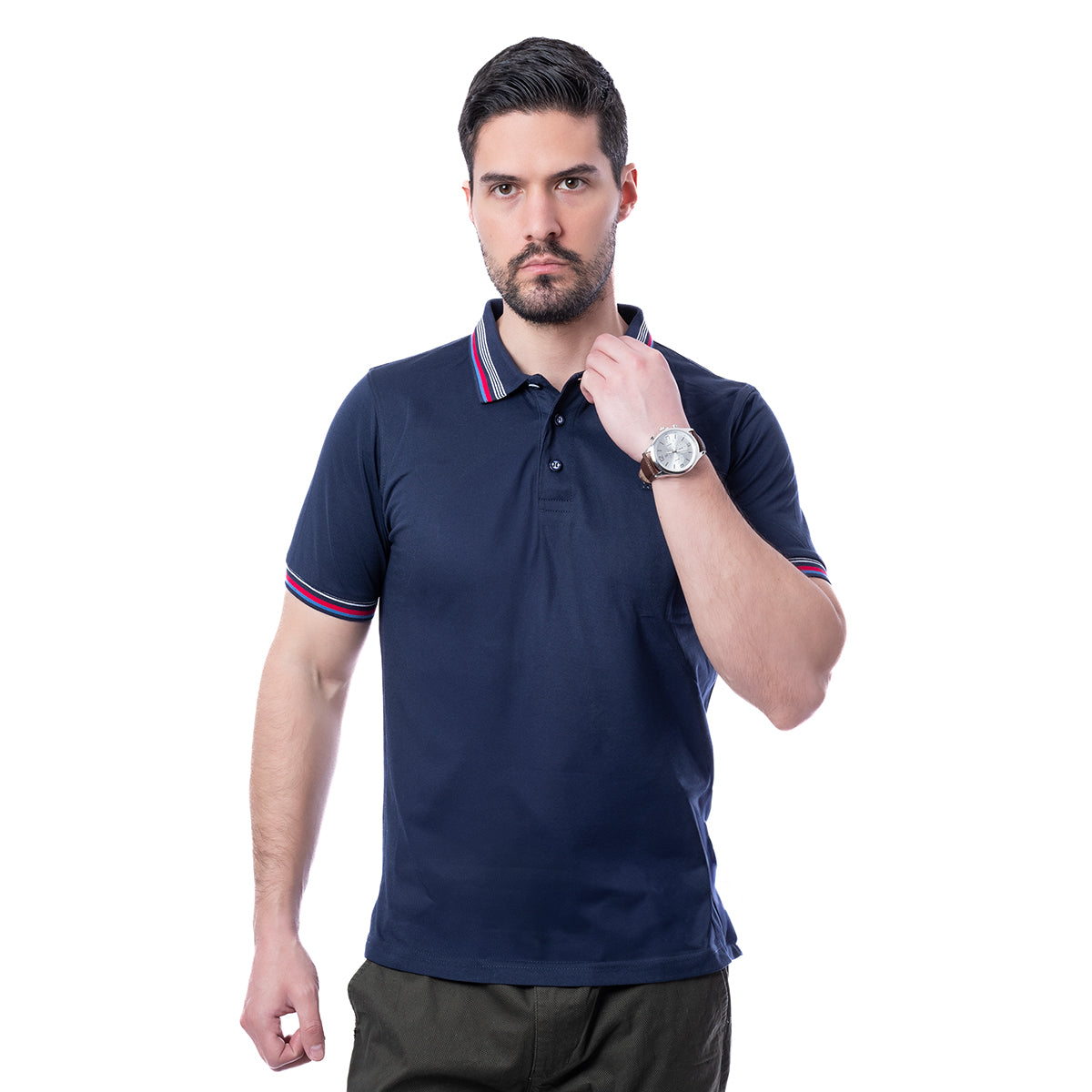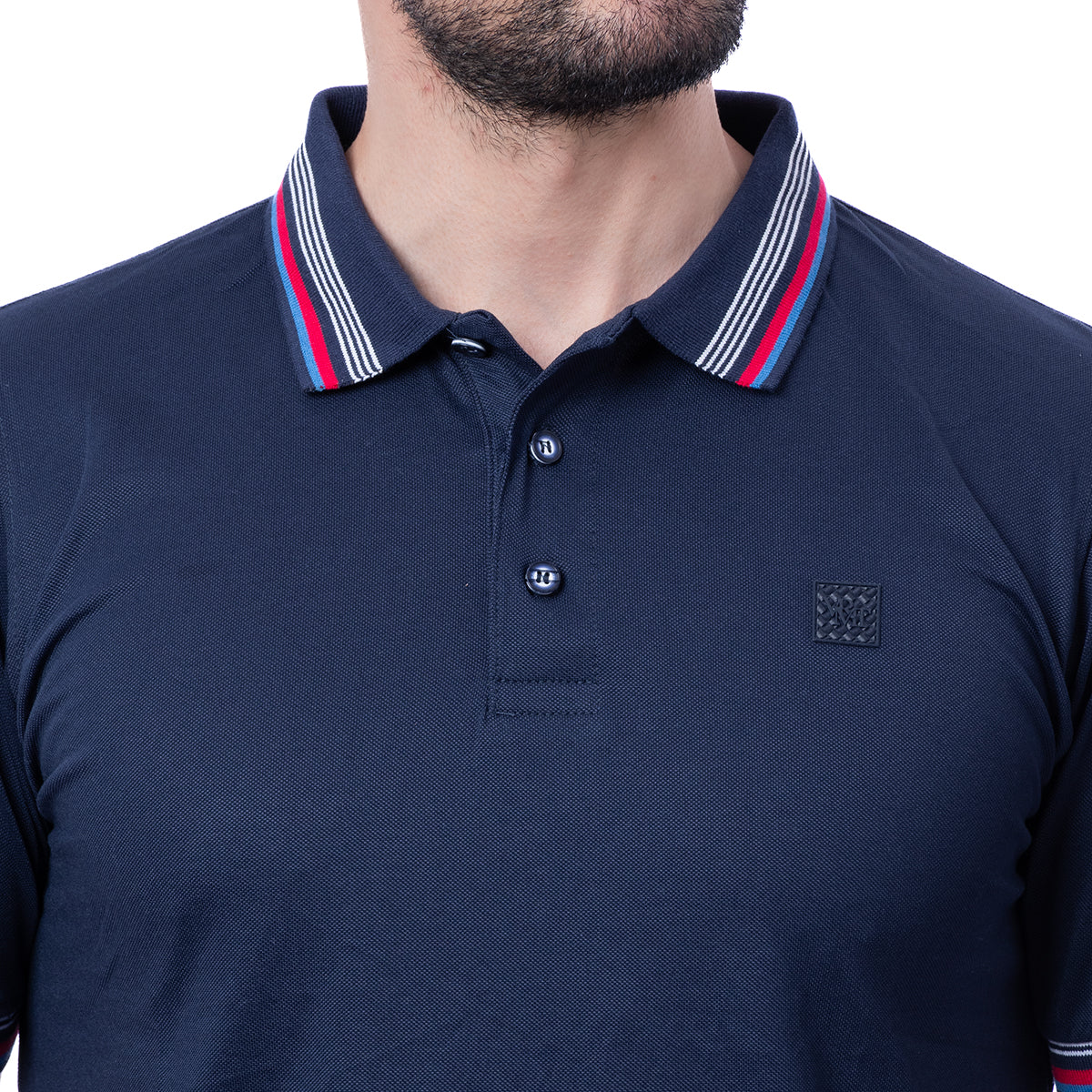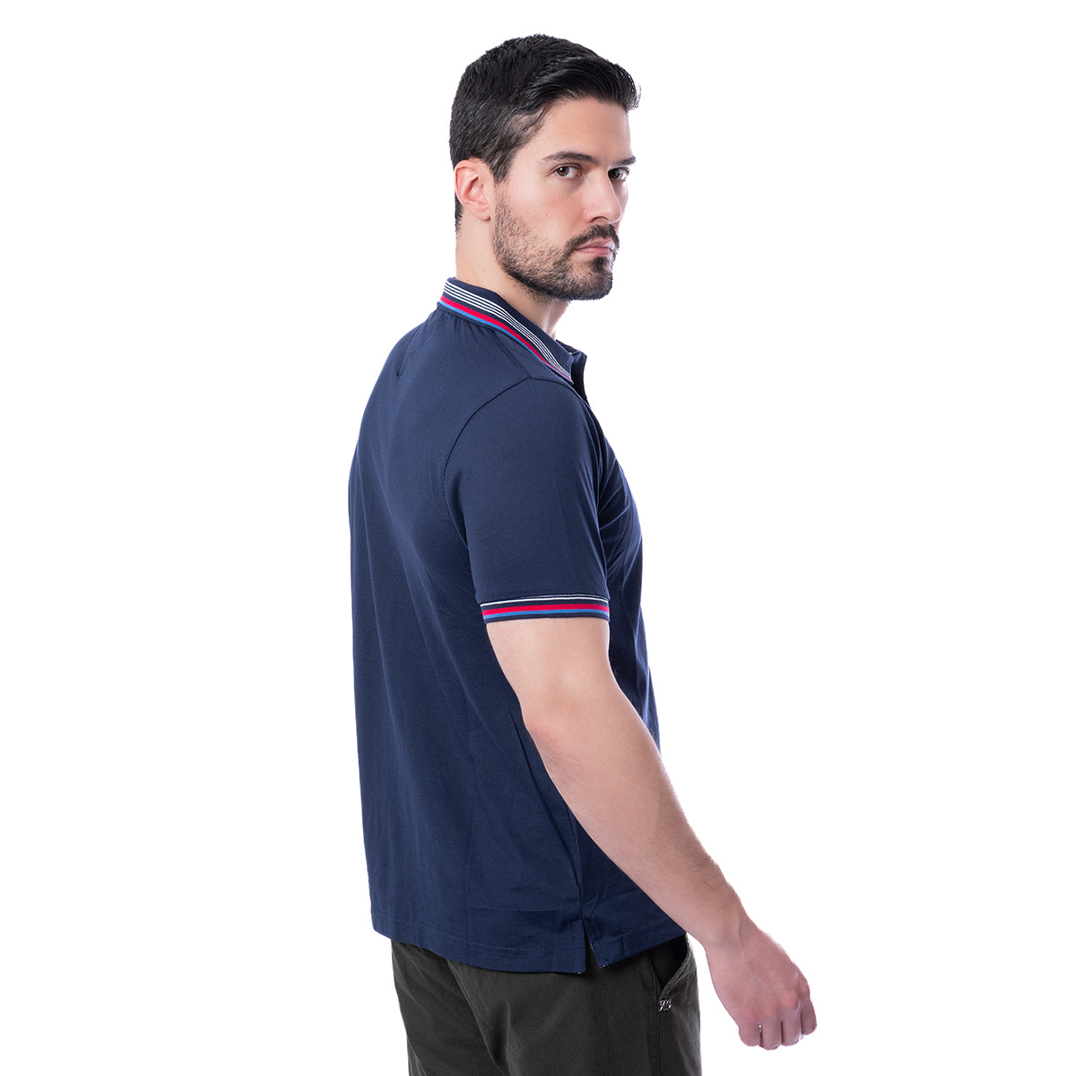 Playera tipo Polo de corte Slim Fit, en color marino, con diseño liso. Cuello camisero y manga corta . Moldeable al cuerpo y tela suave. Cierre de botonadura a la altura del pecho.